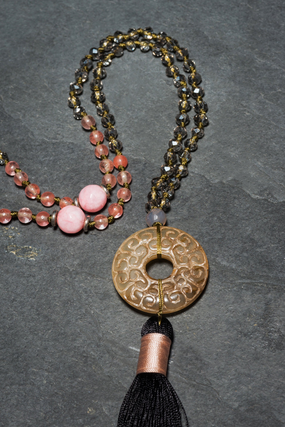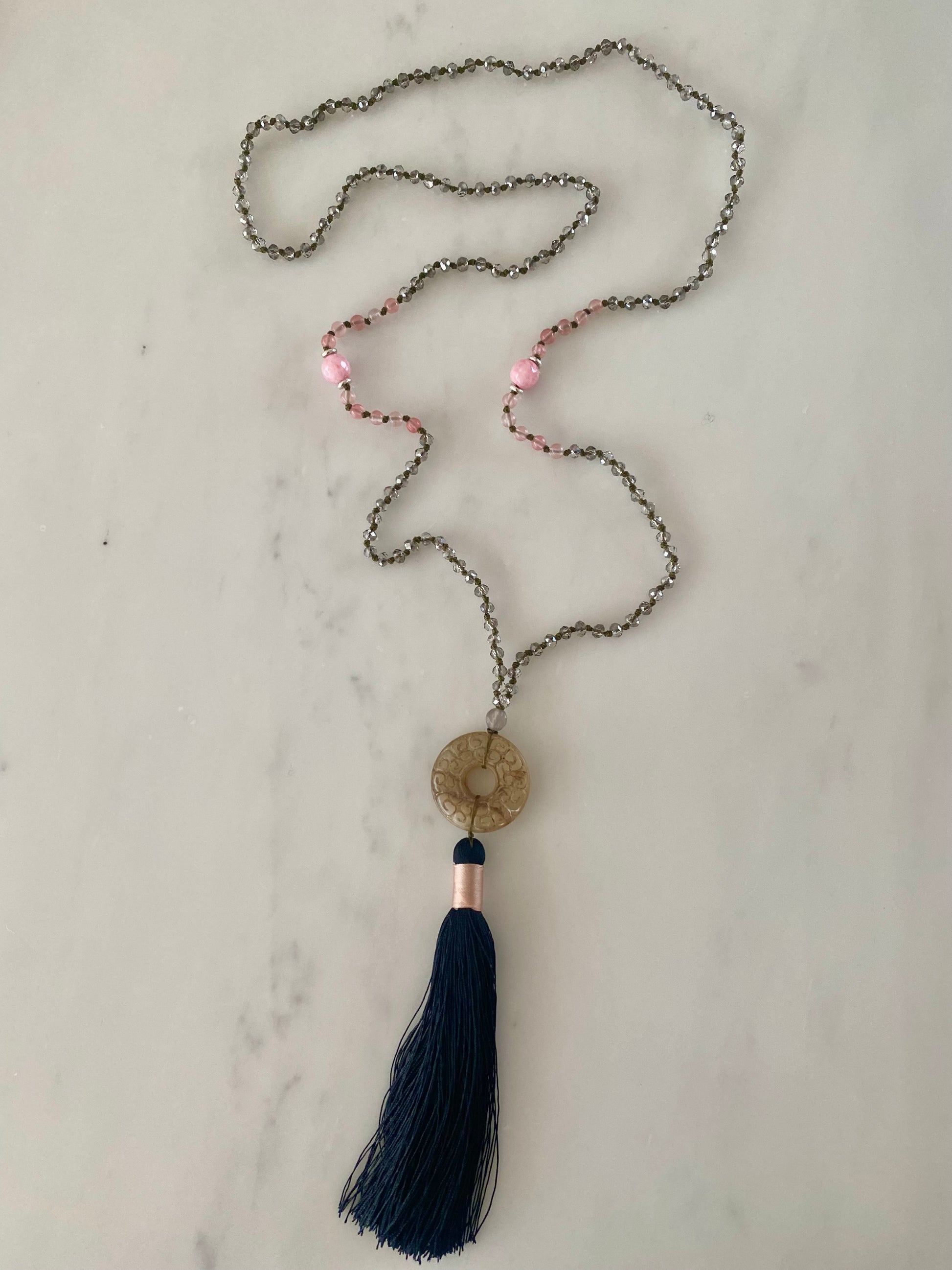 This is one of our very special limited pieces. It is hand knotted with iridescent grey crystals in khaki thread. At it’s centre sit soft large opaque pink and small transparent pink natural agate semi precious stones, chosen for their soft feminity. At the end, under a beautiful grey agate sits an antique carved nephrite jade mandala, from our dealer in Covant Garden. The necklace is then finished with a striking black tassel wrapped in soft elegant peach.