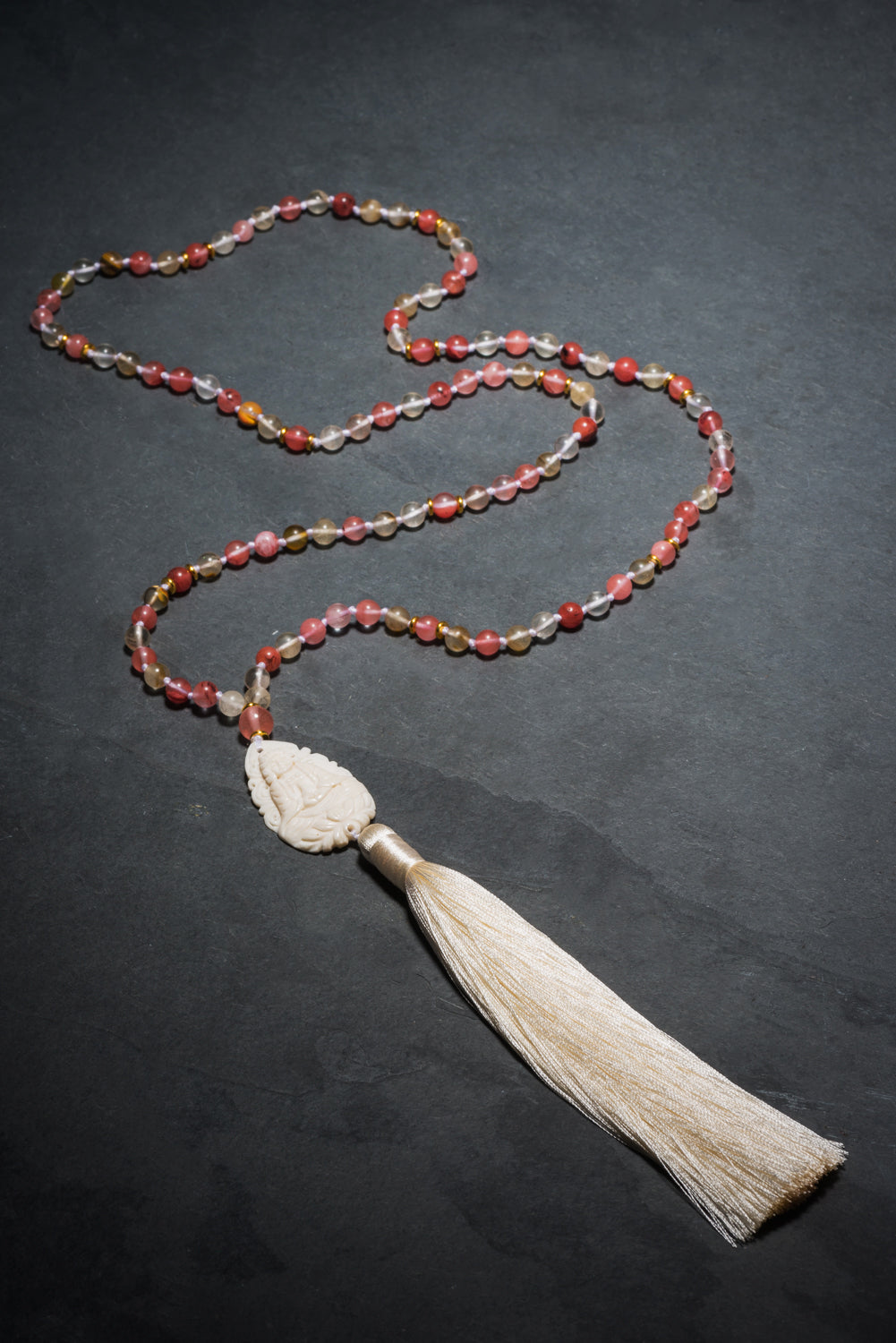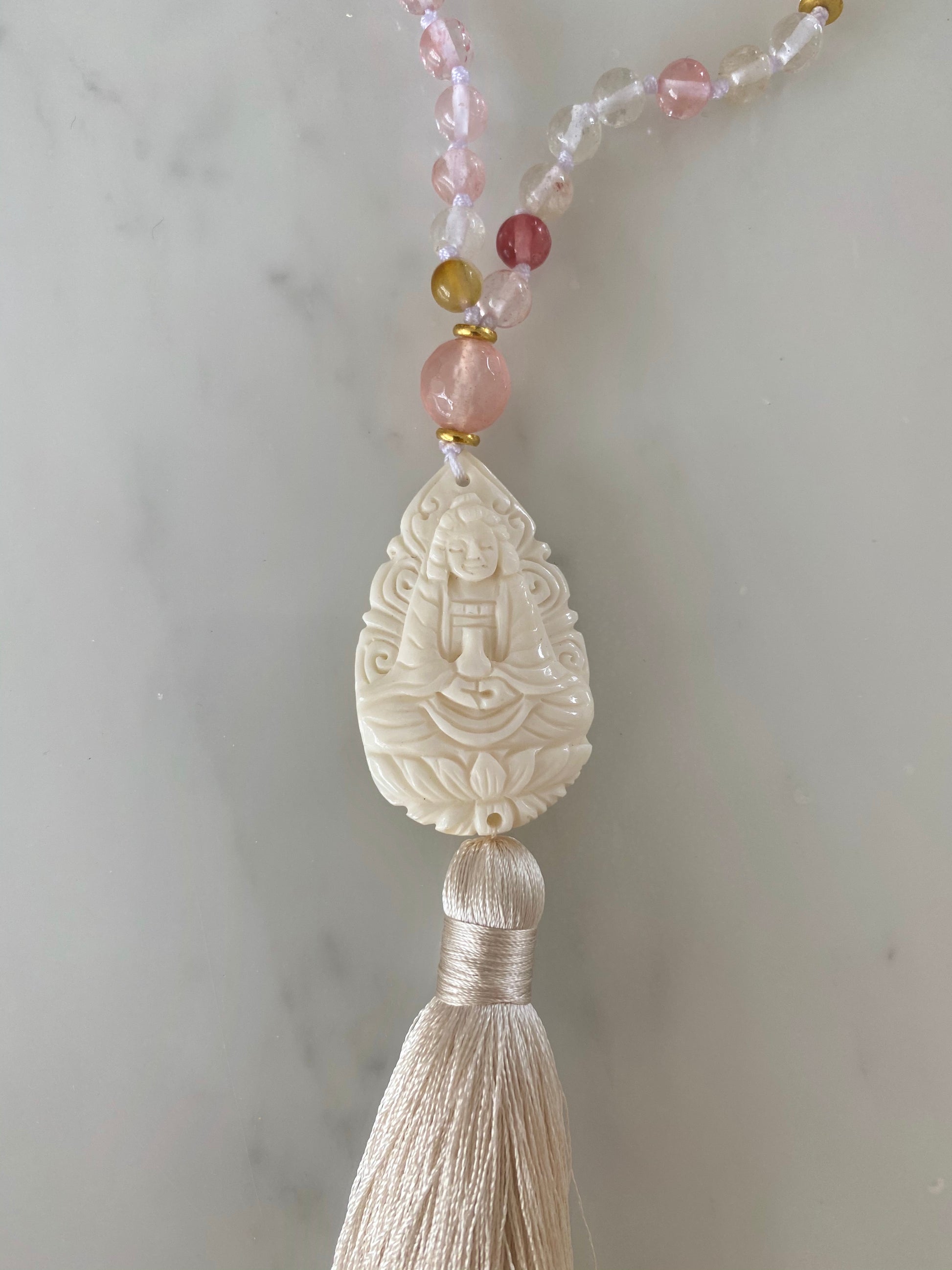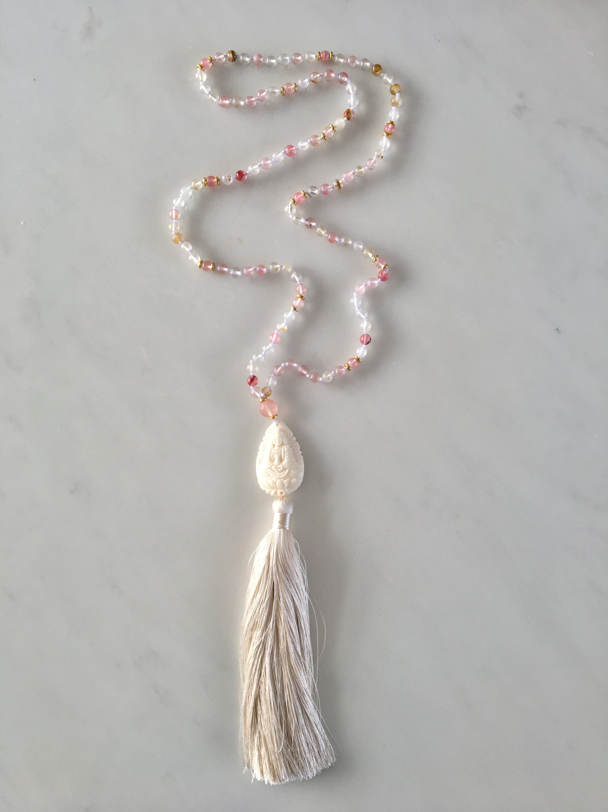 This is one of our very special limited edition mala pieces in full semi-precious stones. It is designed to wear both long or wrap once around the neck as a double. The buddha sitting in a lotus flower is beautifully hand carved by our artisan from ethically sourced bone. It is then hand knotted in white thread with luminous semi precious quartz stones, chosen for their soft, light properties. It is finished with a flowing soft cream silk tassel.