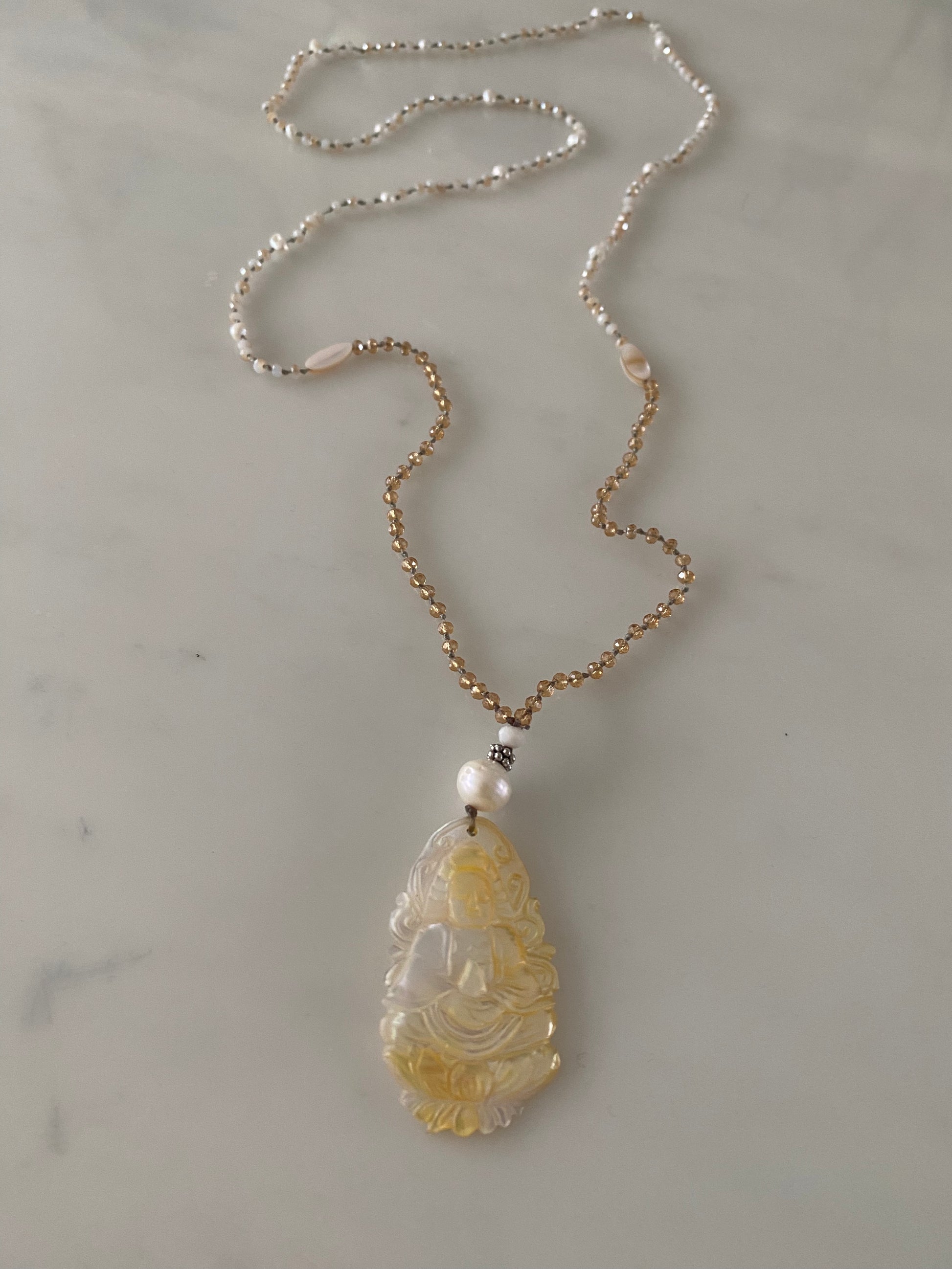 This is one of my very special limited edition pieces with a unique hand carved mother of pearl lotus Buddha. The buddha sitting in a lotus flower is beautifully hand carved by our artisan from mother of pearl. It is then hand knotted in liffy grey thread with fine bronze and cream-gold opaque crystals, tiny fresh water pearls are inter dispersed throughout. Two beautiful shield like mother of pearl beads separate the lower bronze with the upper cream crystals.