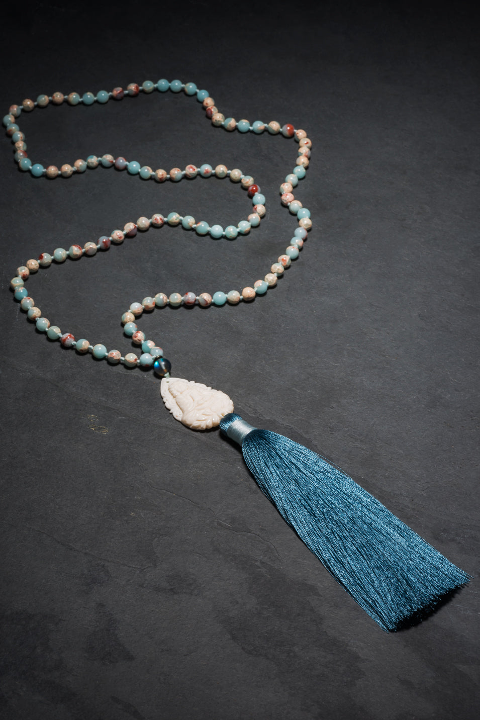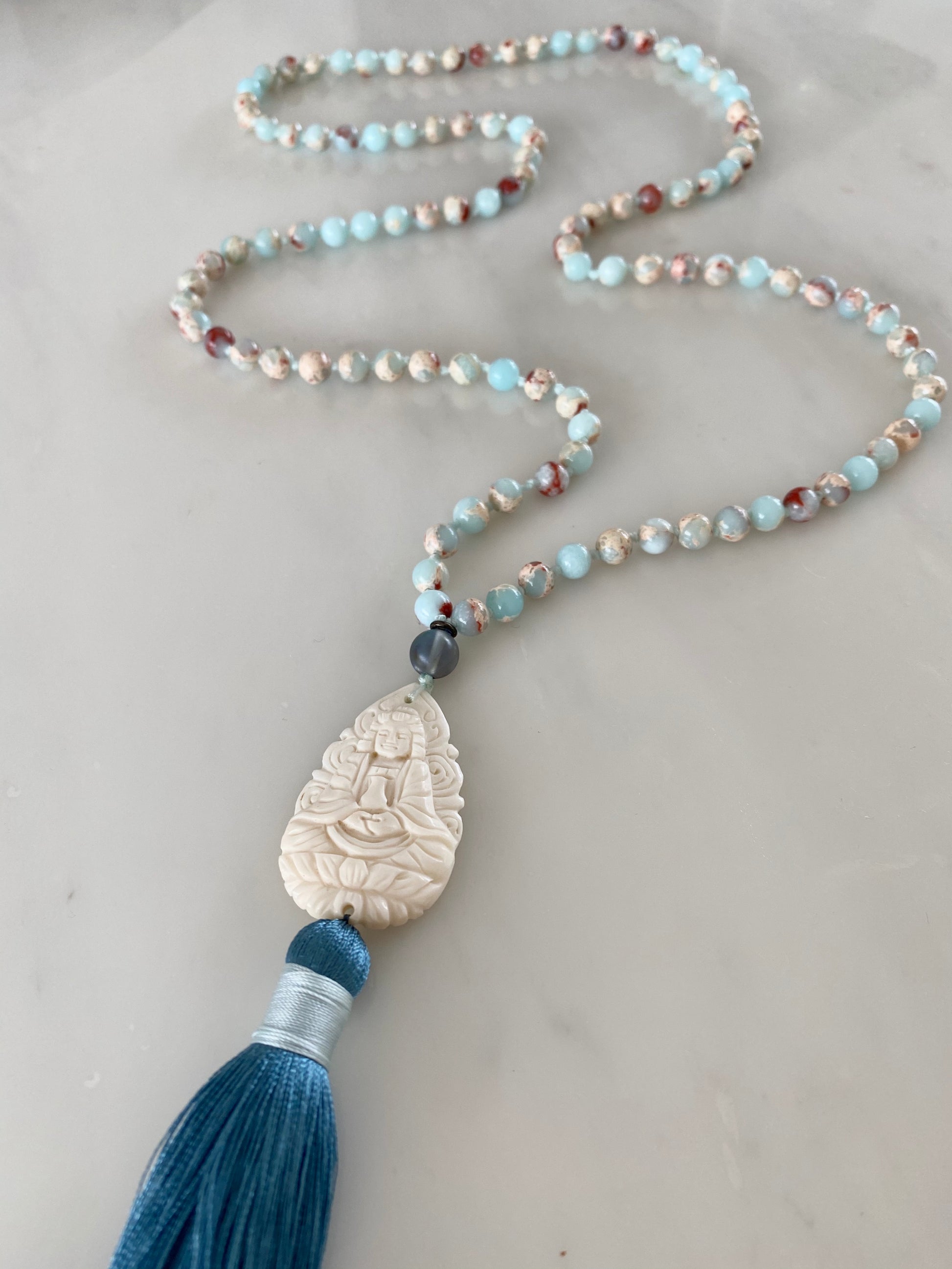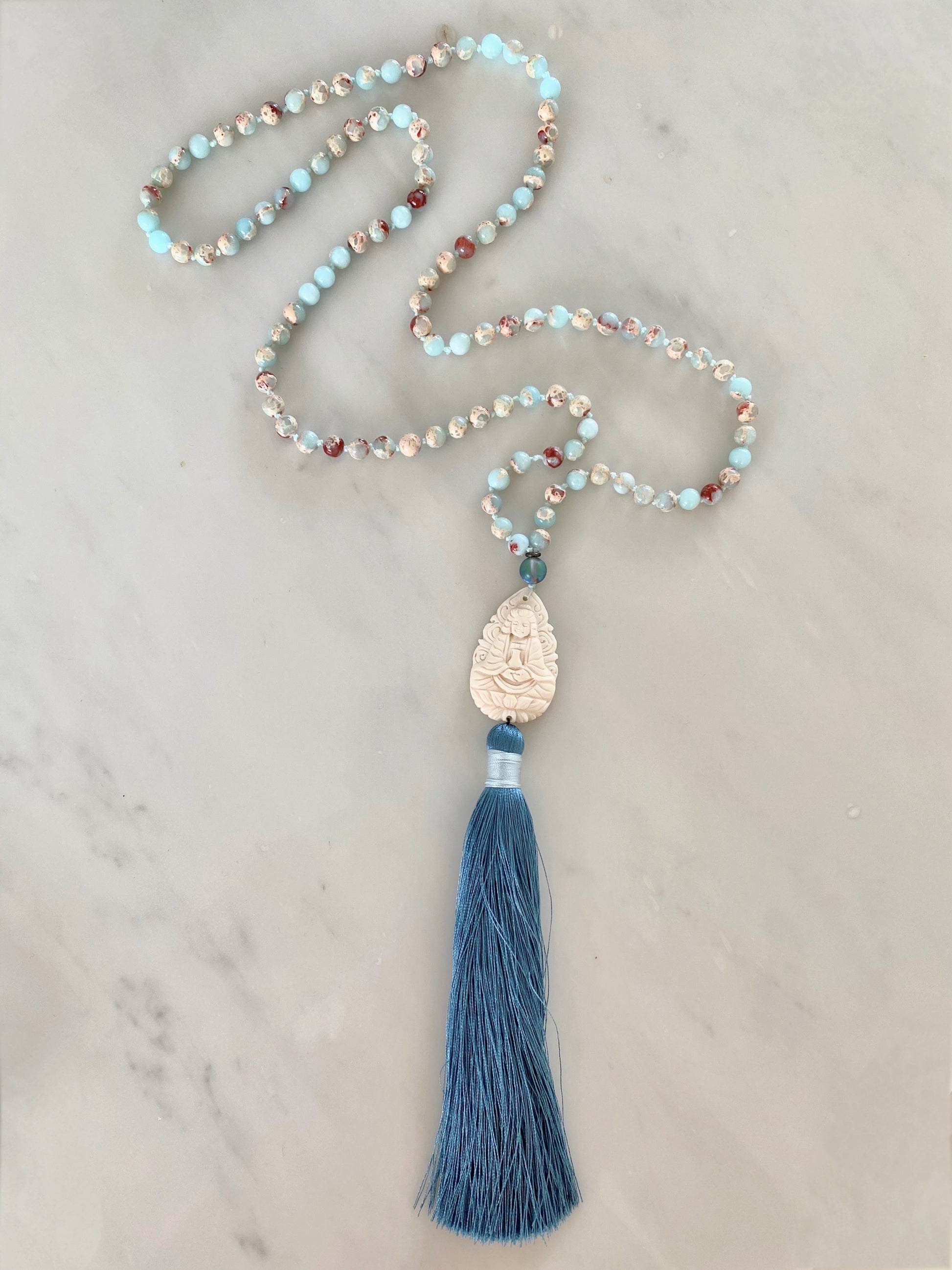 This is one of our very special limited edition mala pieces in full semi-precious stones. It is designed to wear both long or wrap once around the neck as a double. The buddha sitting in a lotus flower is beautifully hand carved by our artisan from ethically sourced bone. Abo e which sits the incredibly beautiful cats eye stone from holland, an almost iridescent blue that catches the light. It is then hand knotted in light aqua thread with beautiful marbled agate stones in aqua and cream with touches of russet. It is finished with a flowing soft tranquil ocean blue silk tassel wrapped in light cloud blue.