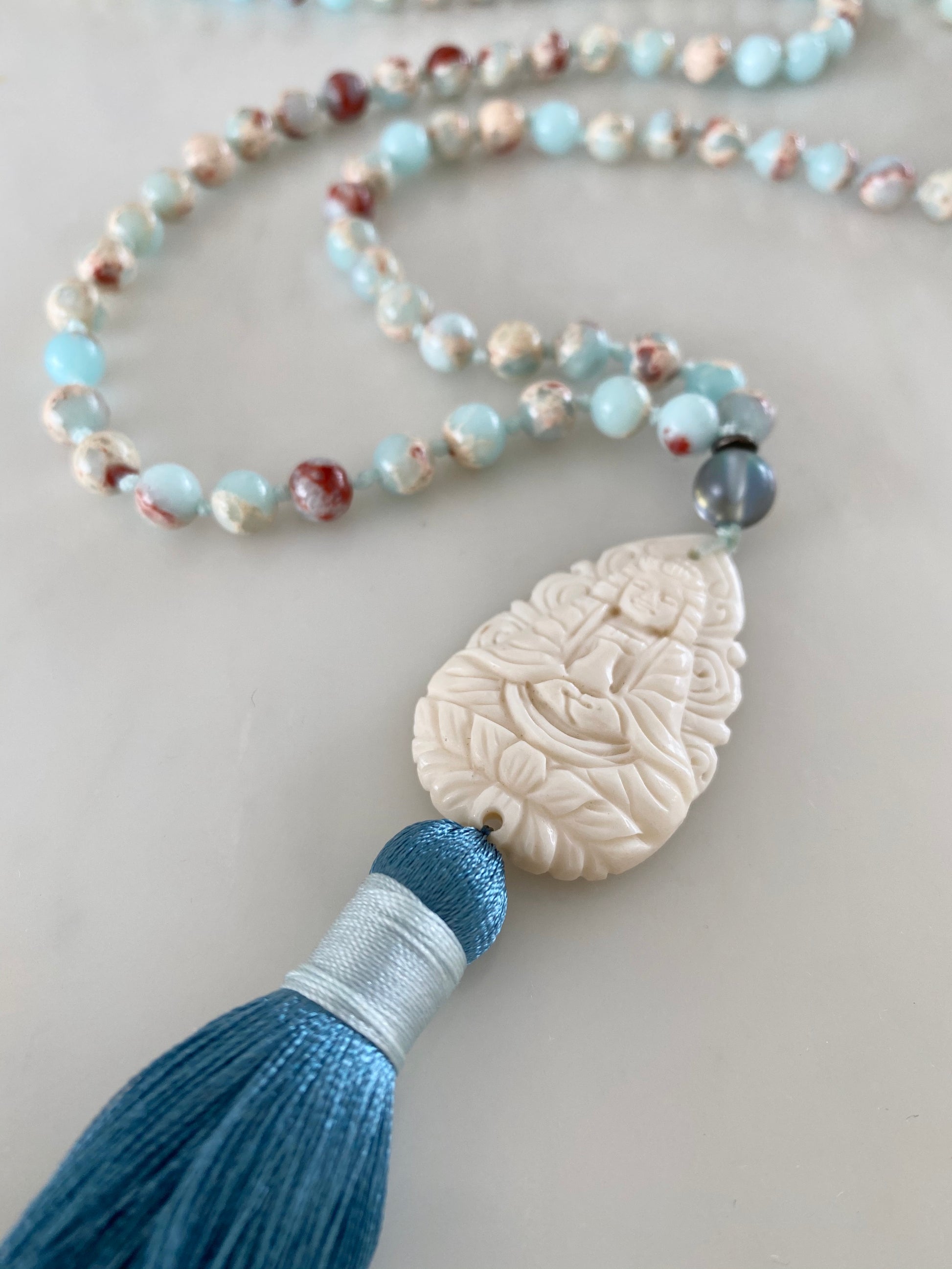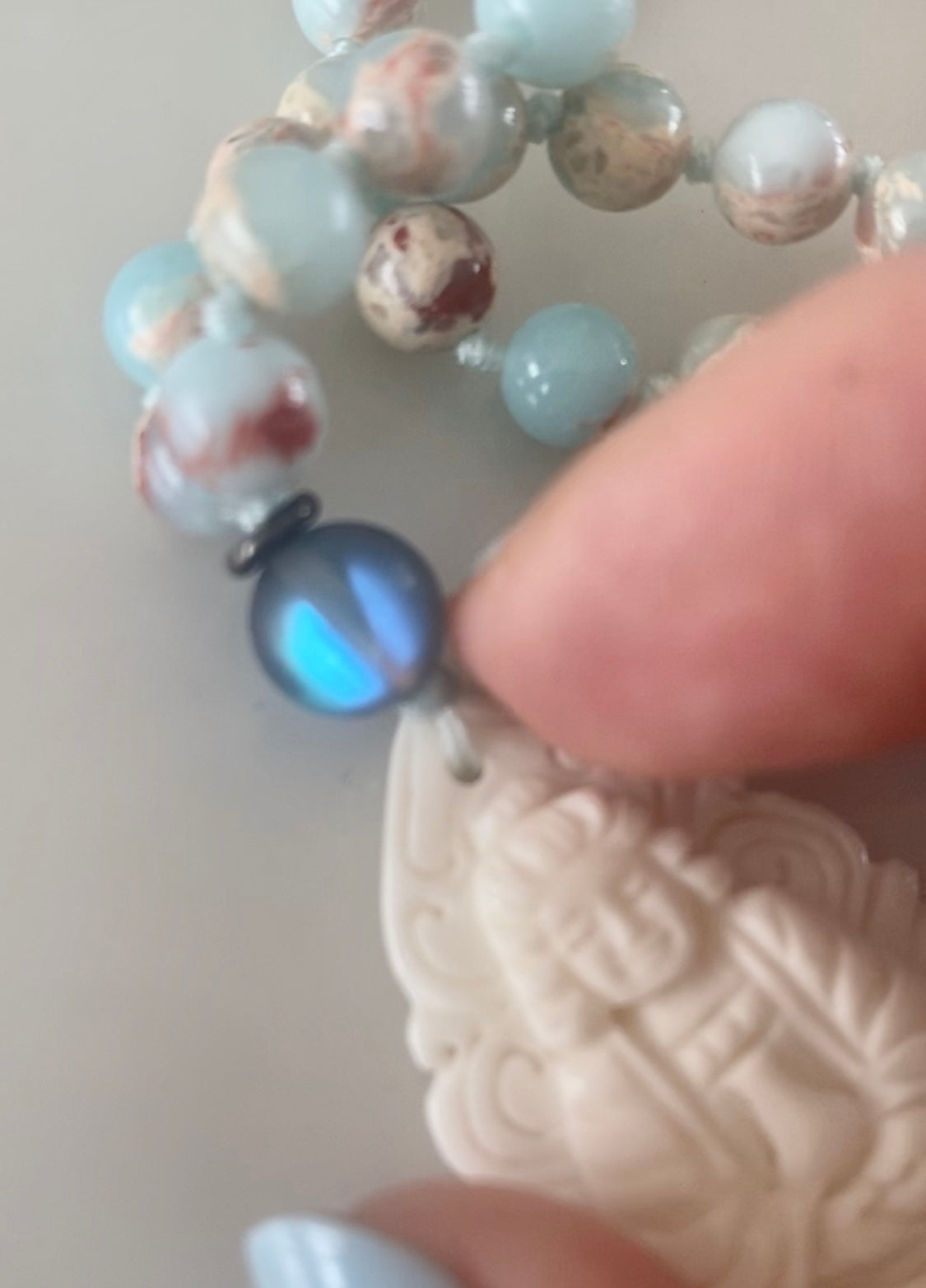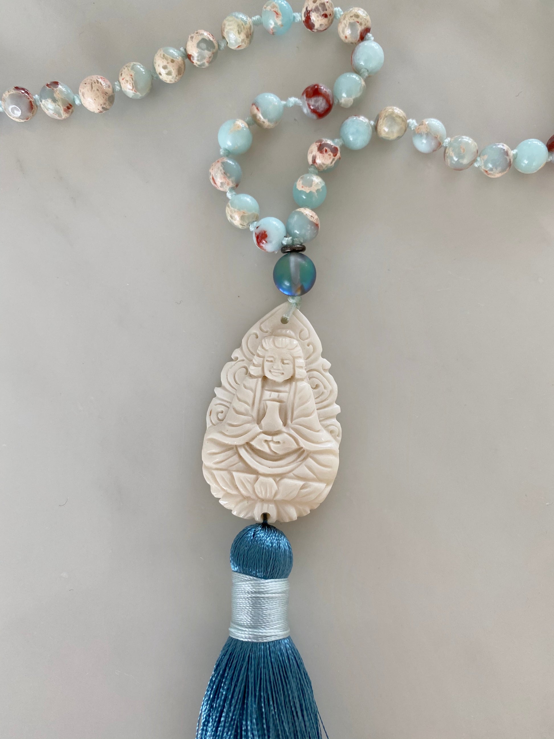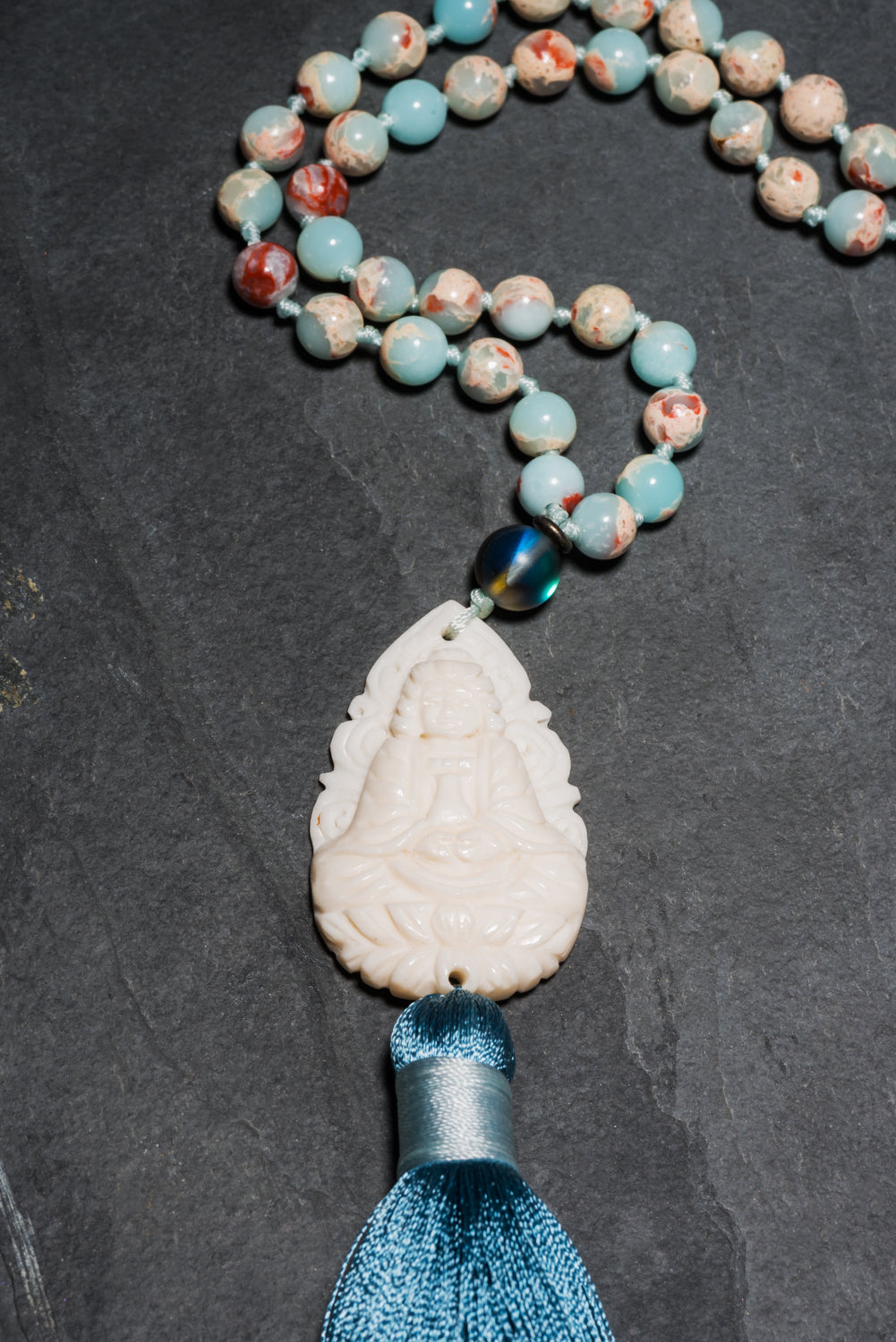 This is one of our very special limited edition mala pieces in full semi-precious stones. It is designed to wear both long or wrap once around the neck as a double. The buddha sitting in a lotus flower is beautifully hand carved by our artisan from ethically sourced bone. Abo e which sits the incredibly beautiful cats eye stone from holland, an almost iridescent blue that catches the light. It is then hand knotted in light aqua thread with beautiful marbled agate stones in aqua and cream with touches of russet. It is finished with a flowing soft tranquil ocean blue silk tassel wrapped in light cloud blue.