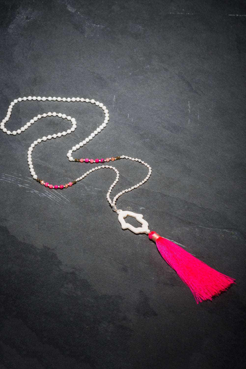 This unique tassel necklace features a hand-carved Hamsa, crafted by our skilled artisan from ethically sourced horn. The intricate design is complemented by handwoven pink agate, hand-blown glass beads, and golden decorative elements. A grey agate sits before the carved amulet, and it is finished with a hot pink tassel wrapped in light pink..