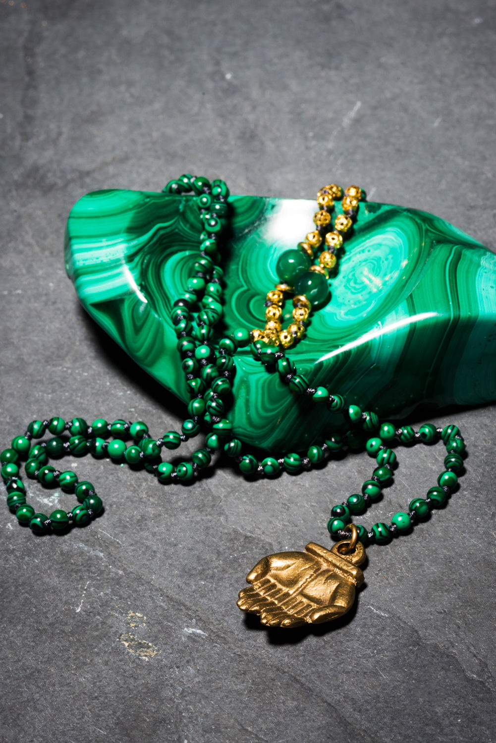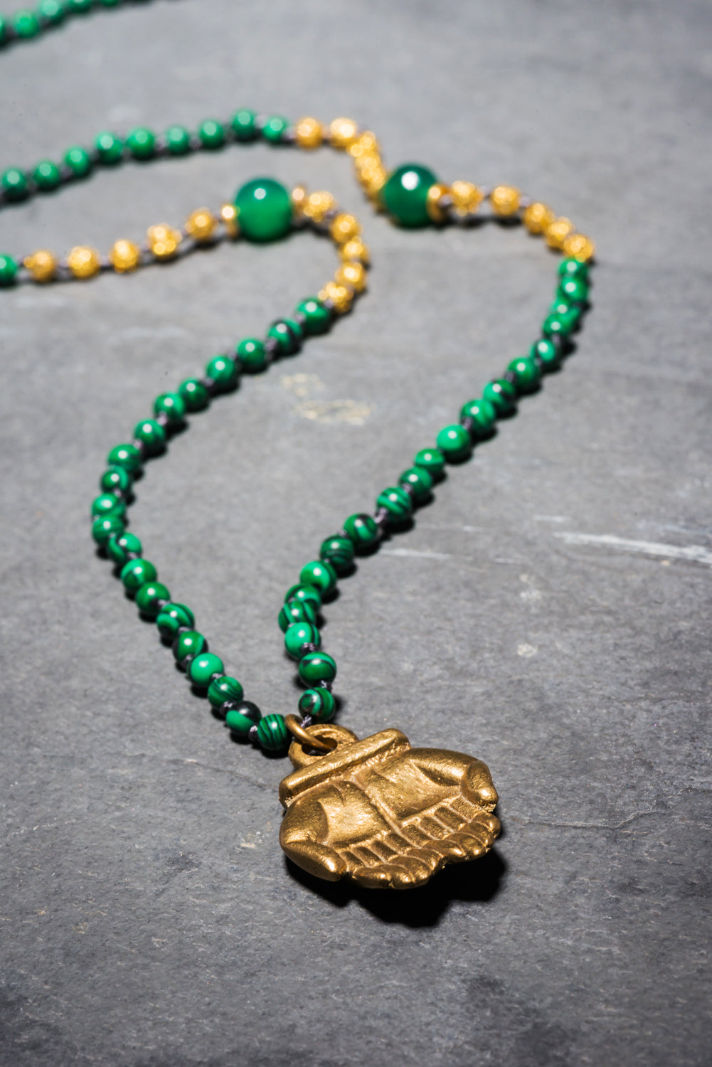 This beautiful and limited edition version of our Buddha hands pendant in prayer. Hand knotted in dark grey thread, full malachite semi precious stones, green agate and golden brass. The pendant is hand cast in sand and wax by our Maasai artisan from recycled padlocks.