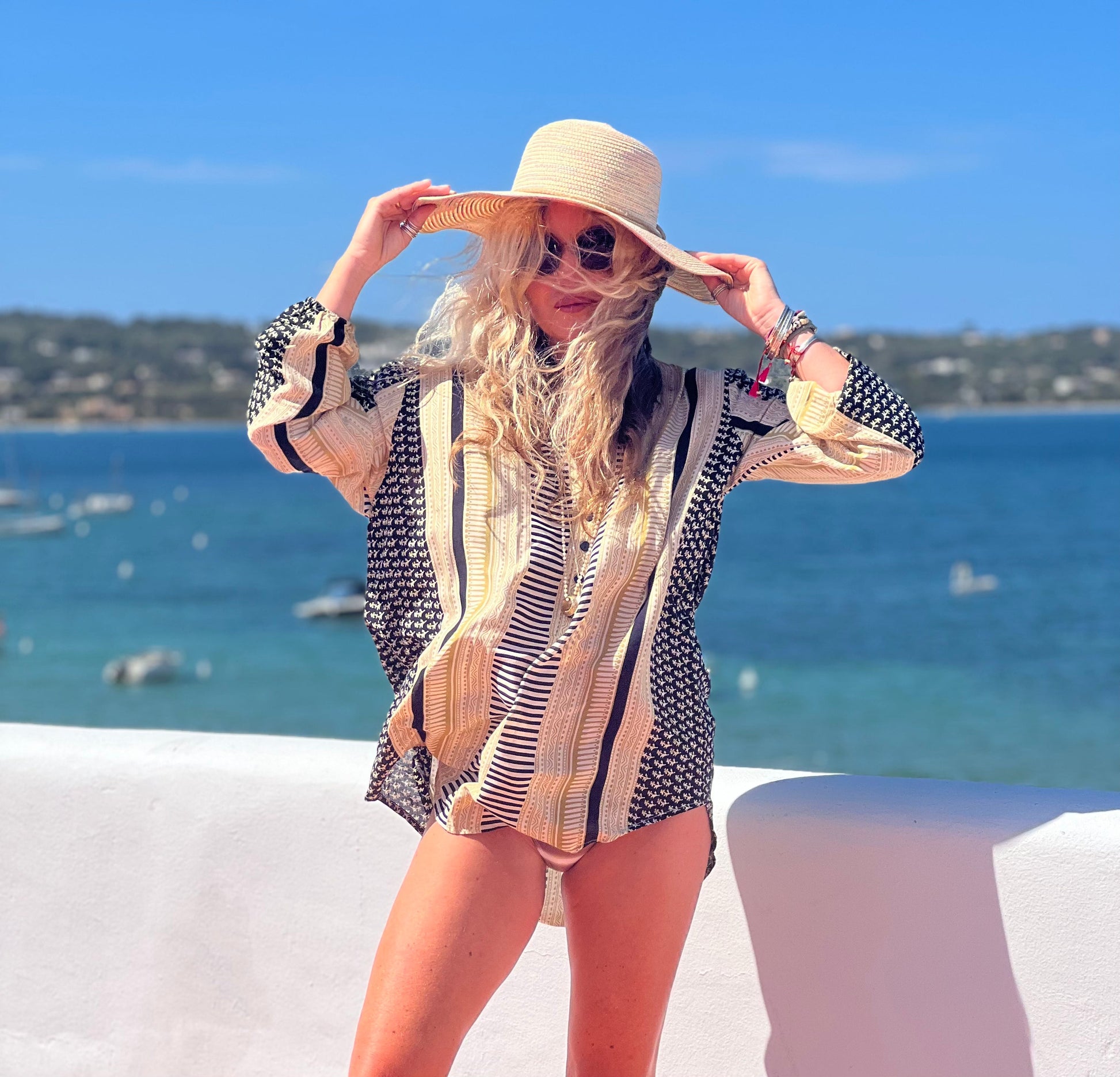 Featuring a half-buttoned front for easy styling, it's the ultimate in versatile chic. Each piece is meticulously hand screen printed, giving it that unique artisanal touch.
