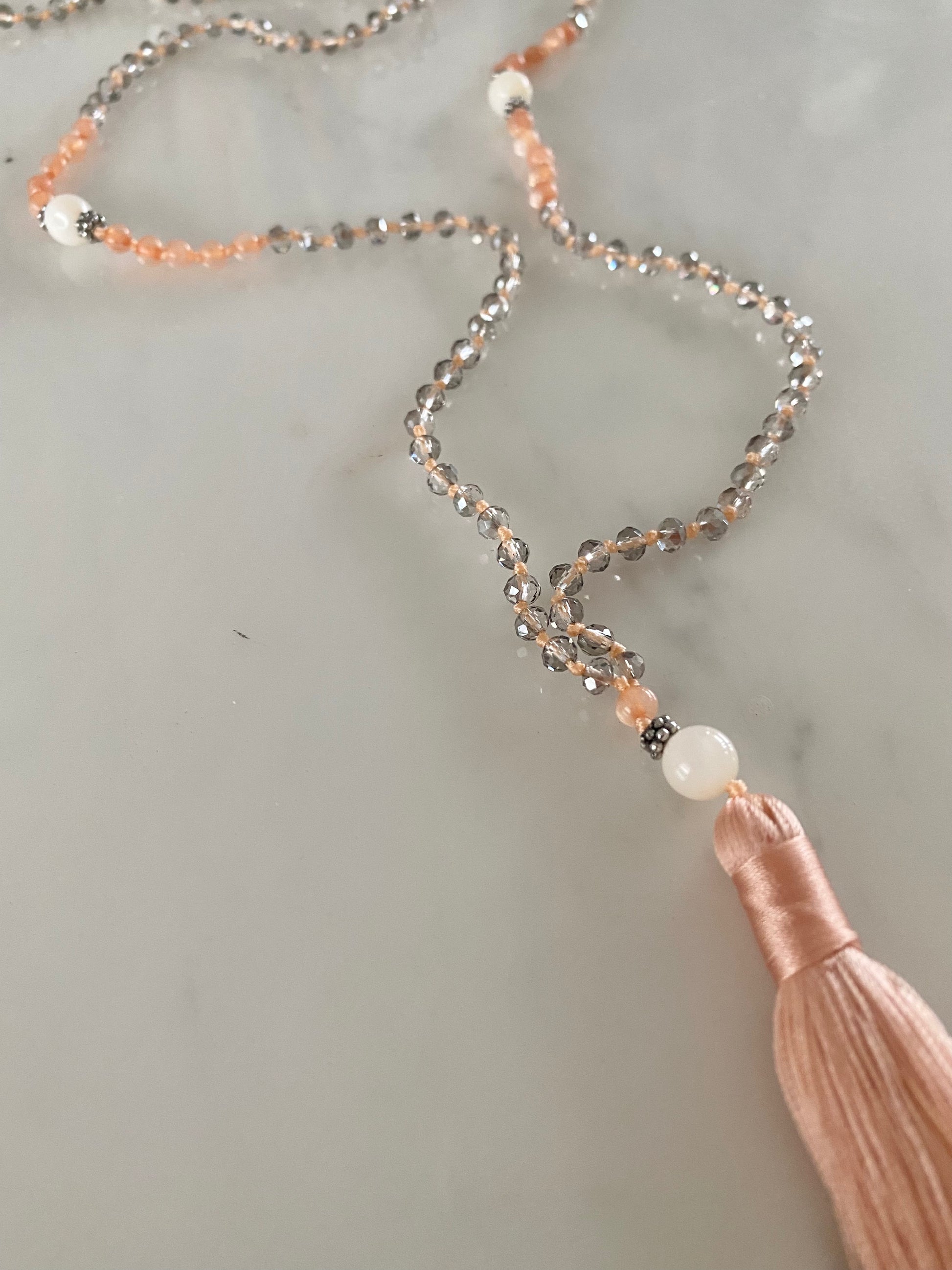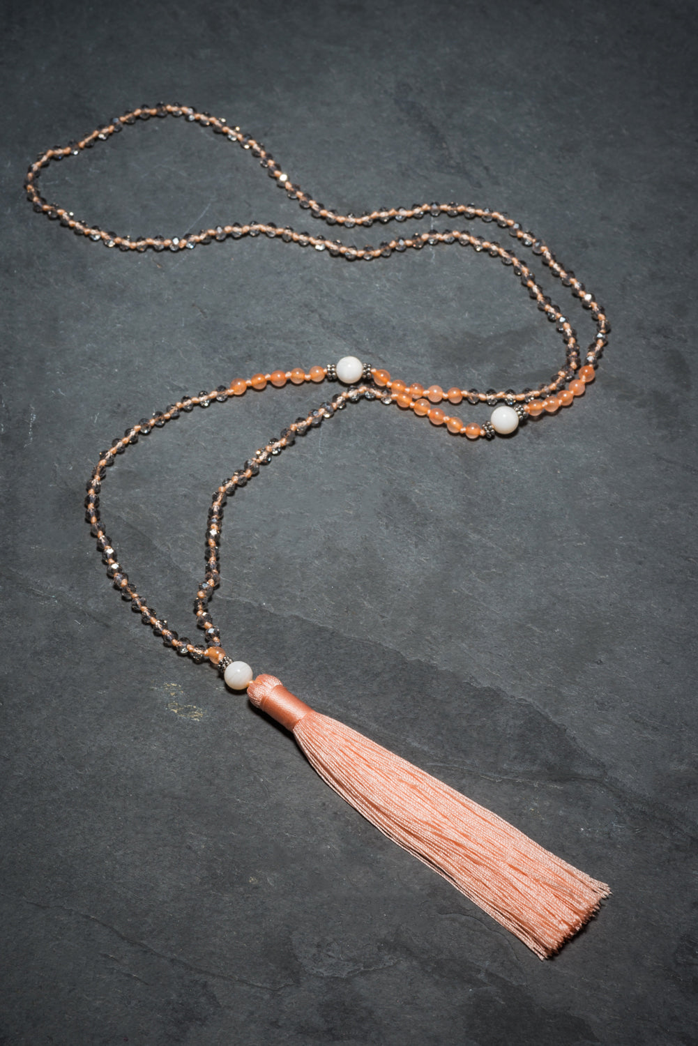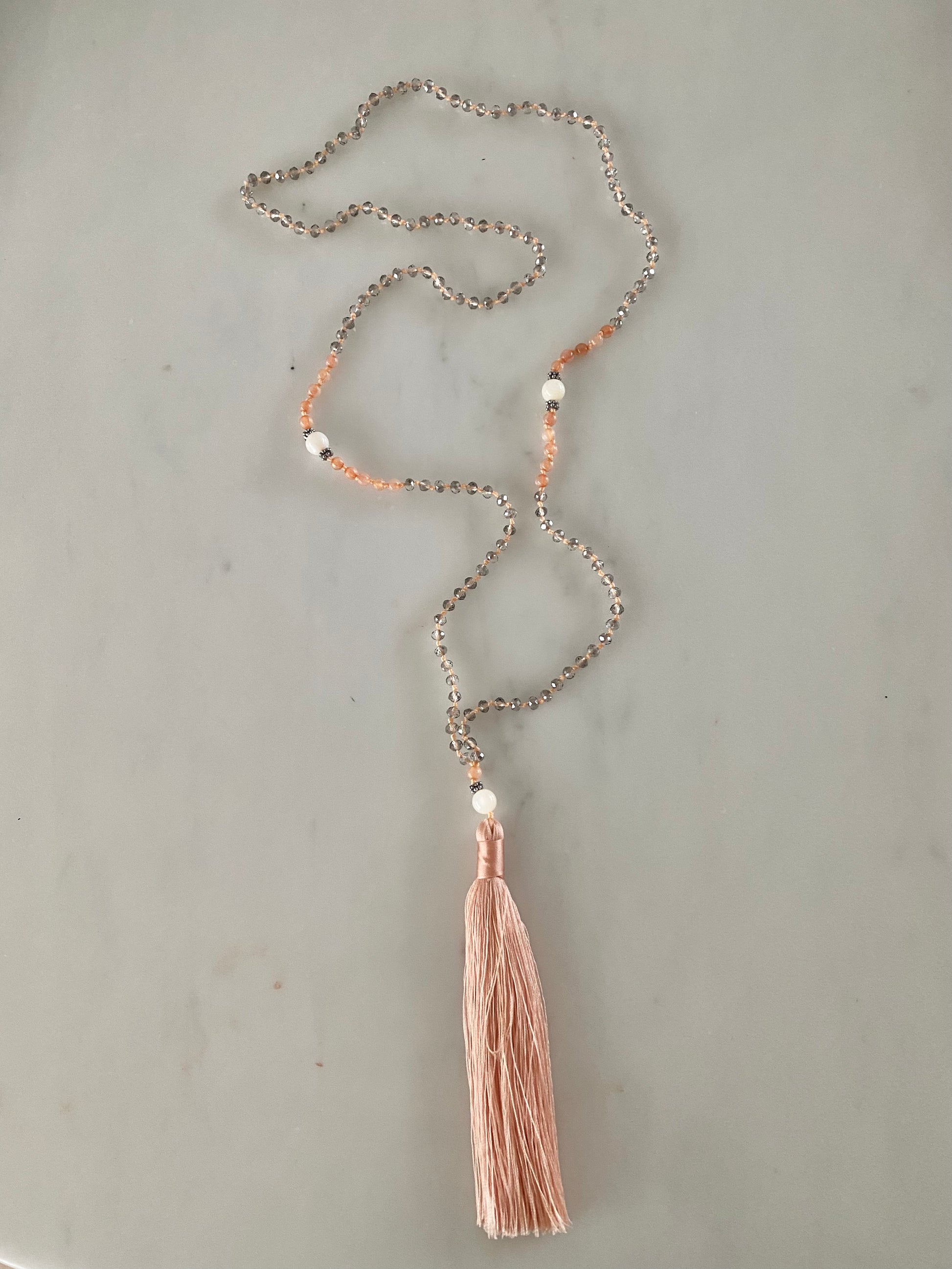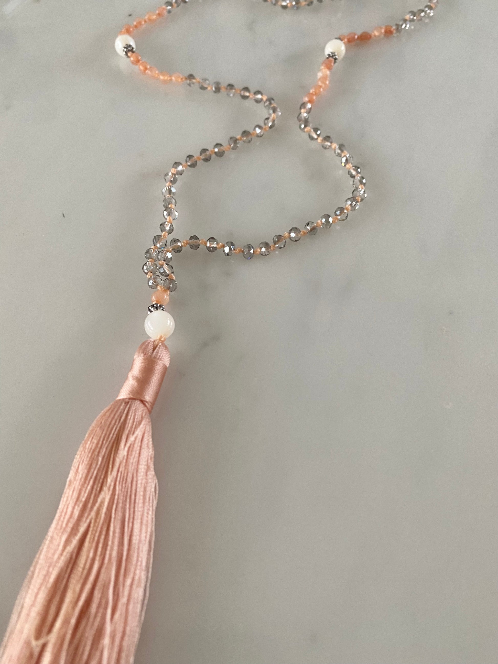 Subtle light grey transparent crystals are knotted in light nude thread with beautiful peach-nude agates eithe side of smooth shell beads. A further shell beads and agate sits before the peachy-nude tassel, giving a beautifully luxurious and gentle vibe.