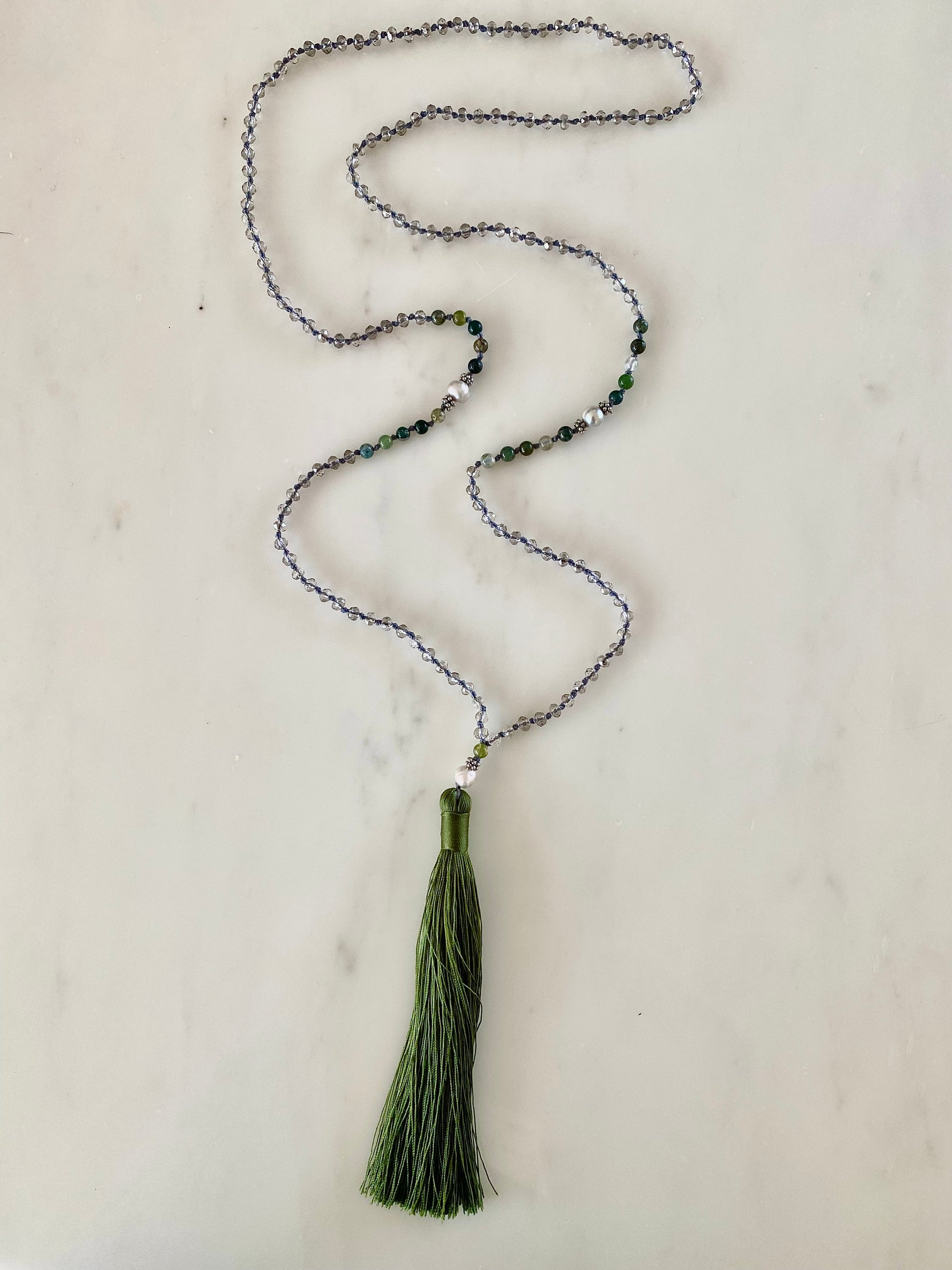 Inspired by shimmering silver clouds over a deep forest. This beautiful necklace is made up of clear crystals, hand knotted in soft grey. At its centre sit glowing iridescent silver-grey pearls surrounded by small mixed deep green, clear, grey, black semi precious agate faceted stones. The necklace is finished with a further green agate and silvery Pearl before the olive forest green end tassel. Effortlessly elegant it adds a touch of subtle shimmer to your look.