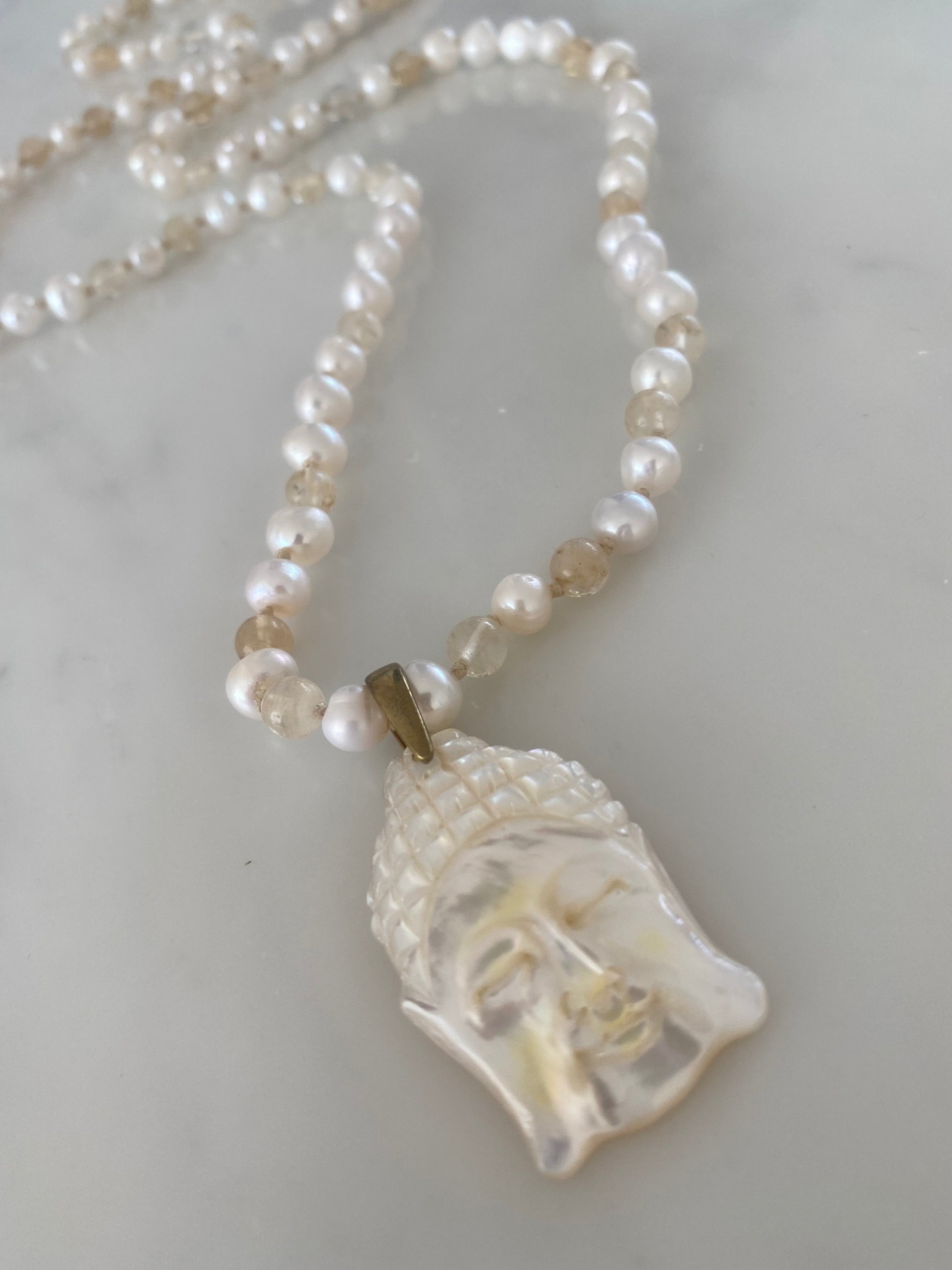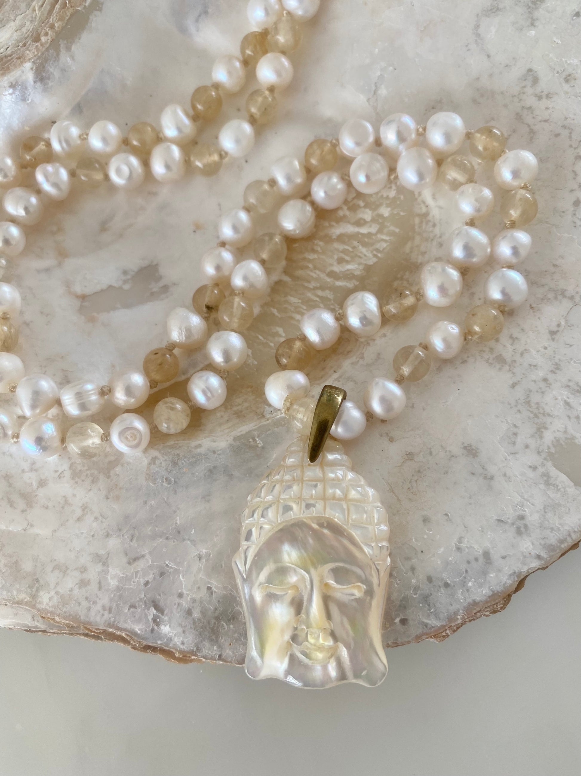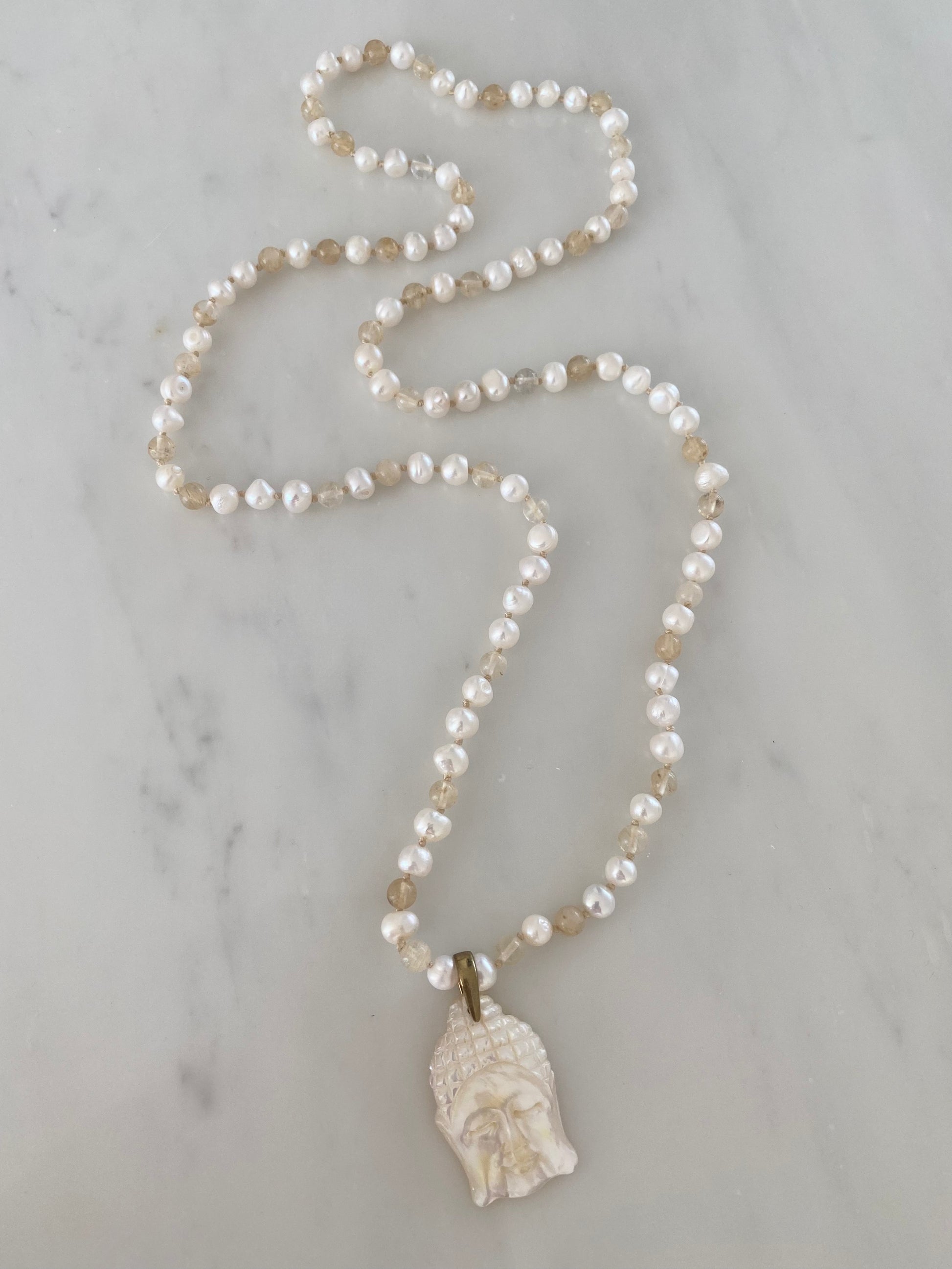 This beautiful very limited edition necklace, hand made by our artisan. Substantial white fresh water pearls are hand knotted together with rutile quartz semi precious stones, in cream thread. finished with a beautiful mother of Pearl, hand carved Buddha head, by our artisan.