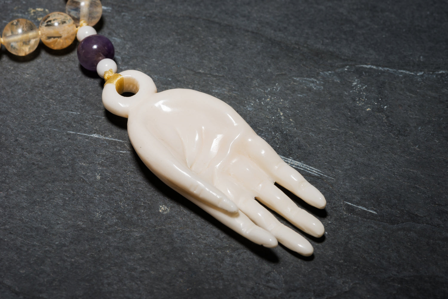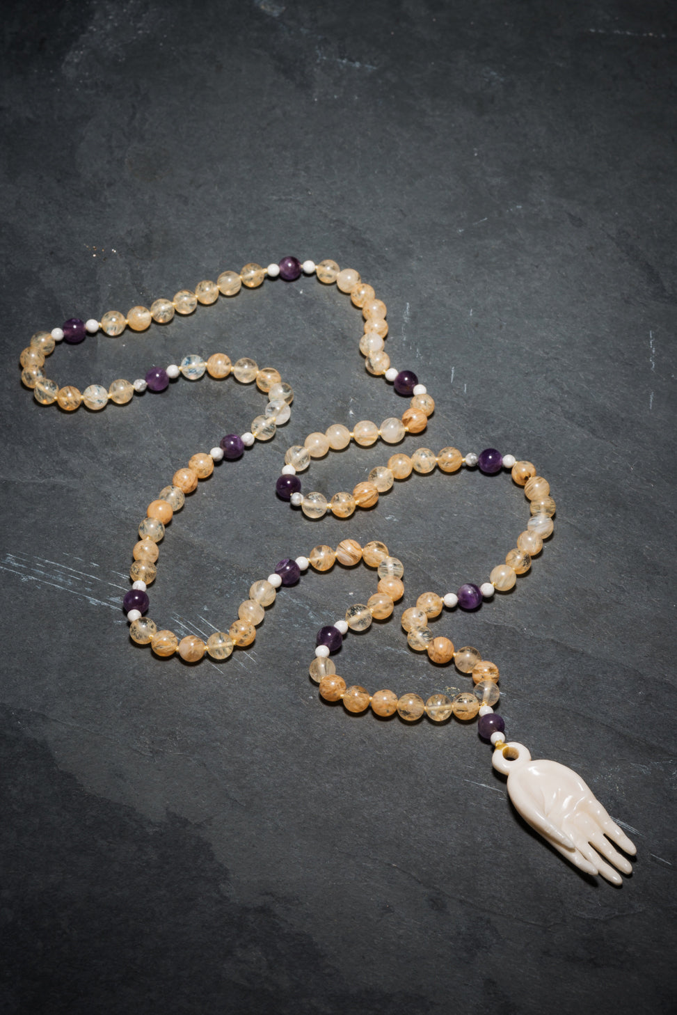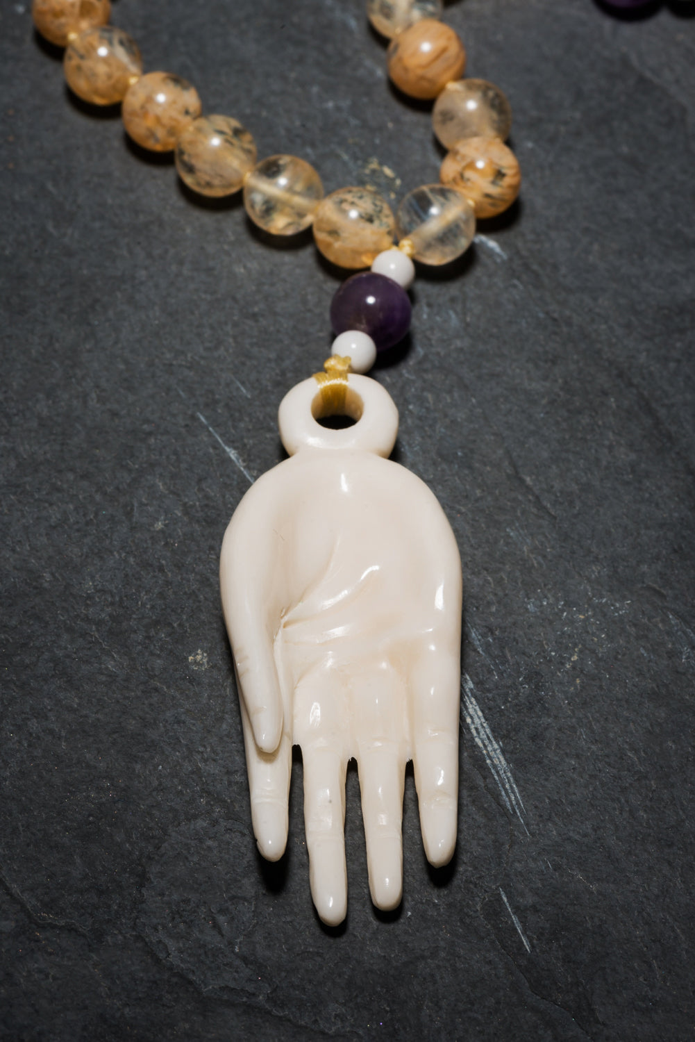 This is a beautiful necklace of 8mm semi precious stones, shorter than our full Mala version. It is made from glowing Rutile quartz with Amethyst and White Howlite inter-dispersed. The Pendant is a hand carved ethically sourced hand of buddha. The piece is honouring the wisdom of life, meaning I bow.