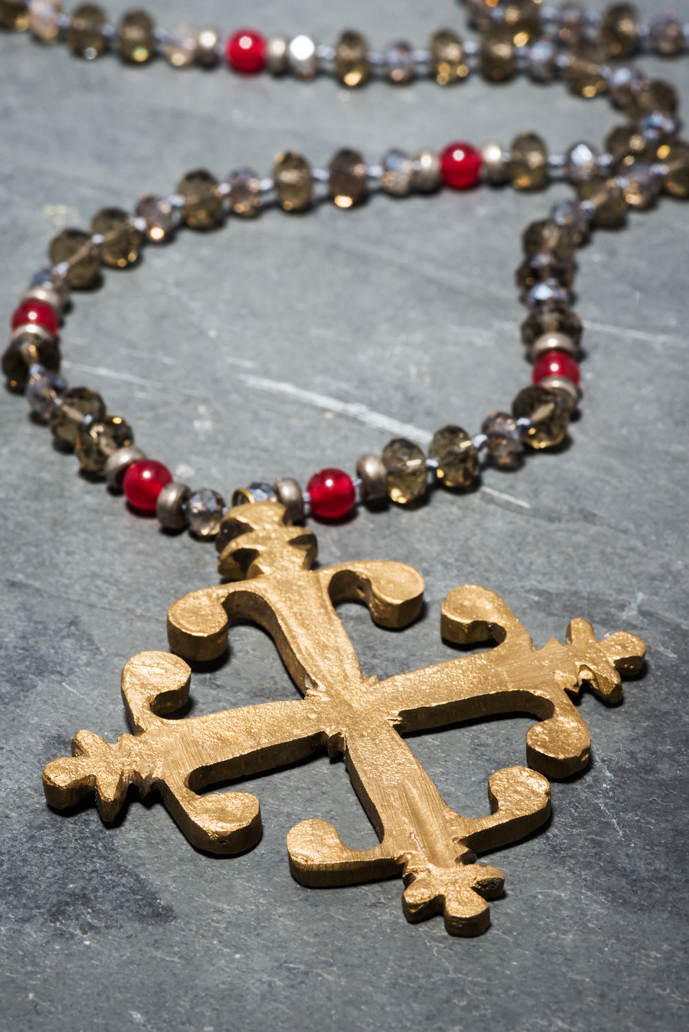A very limited edition statement piece. This heavier, more dressy and sparkling version of our New York Cross has neutral grey crystals interspersed with rich ruby agates.