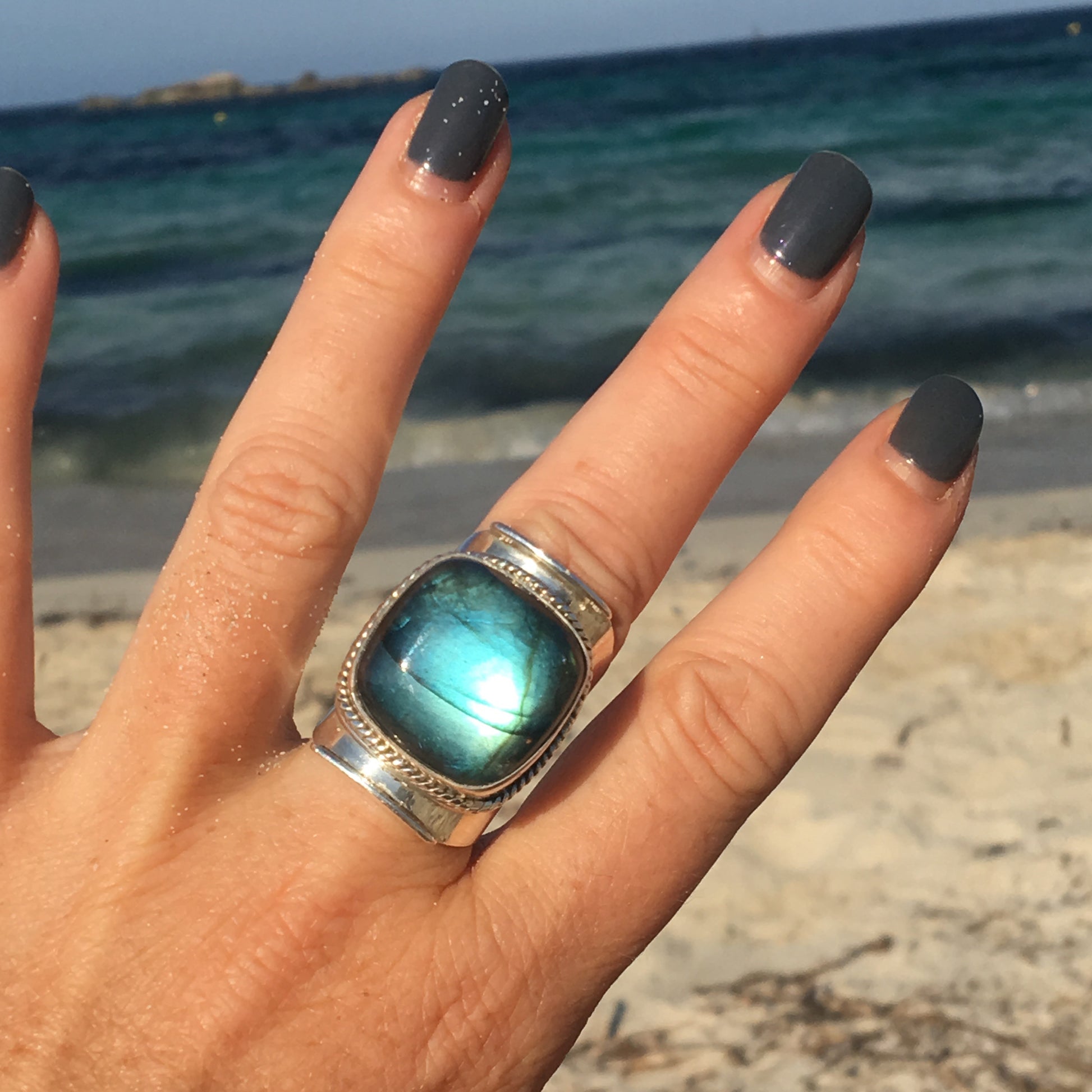 Our signature chunky solid 925 silver ring with a smooth glowing large labradorite semi precious stone. Based on a vintage Indian design it is Bohemian chic at its best.