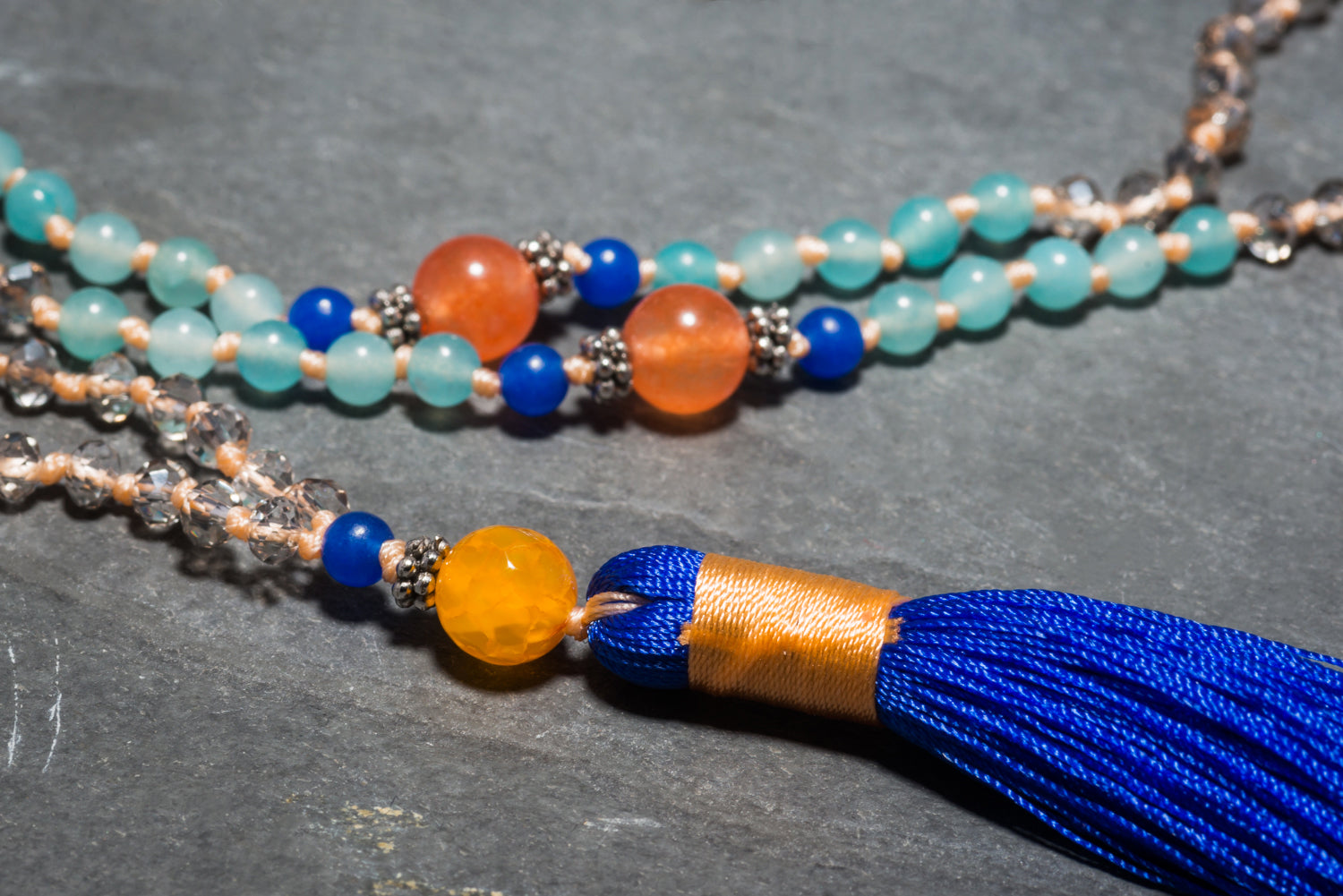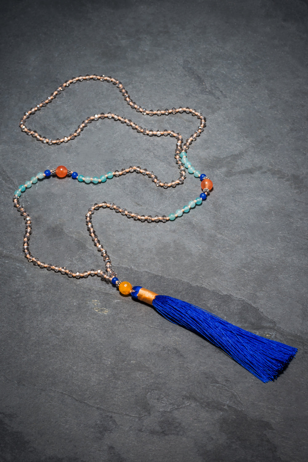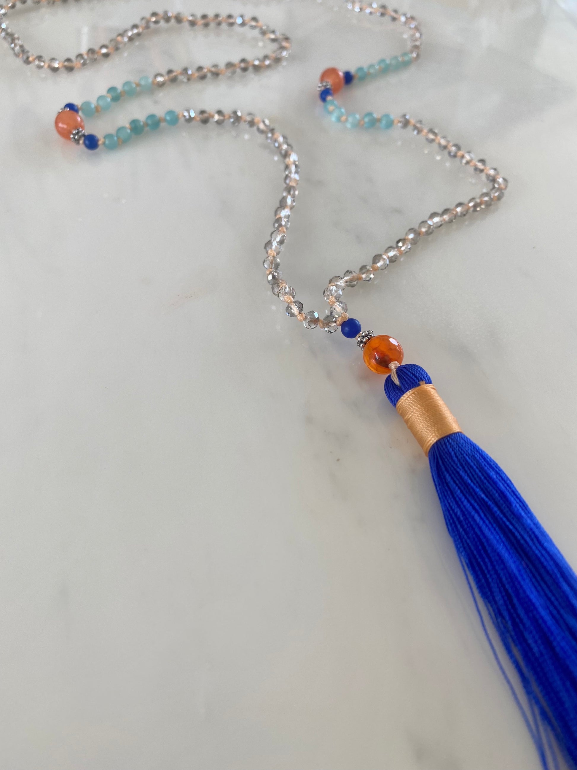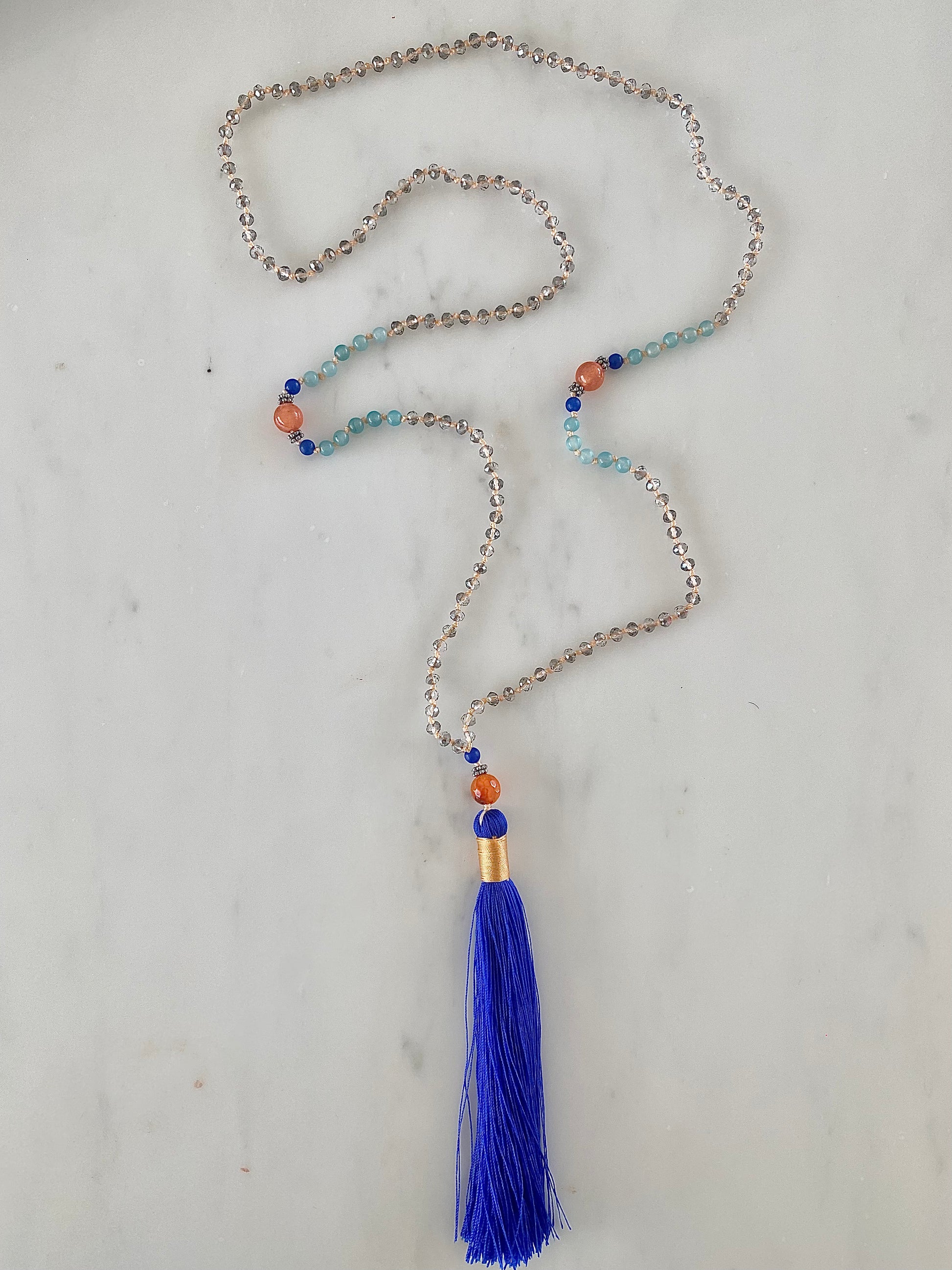 This necklace is hand knotted with light grey crystals in soft coral thread. Small light turquoise, deep blue and warm coral agates sit at its centre. Finished with a further coral and blue agate before the striking blue tassel wrapped in soft coral thread.