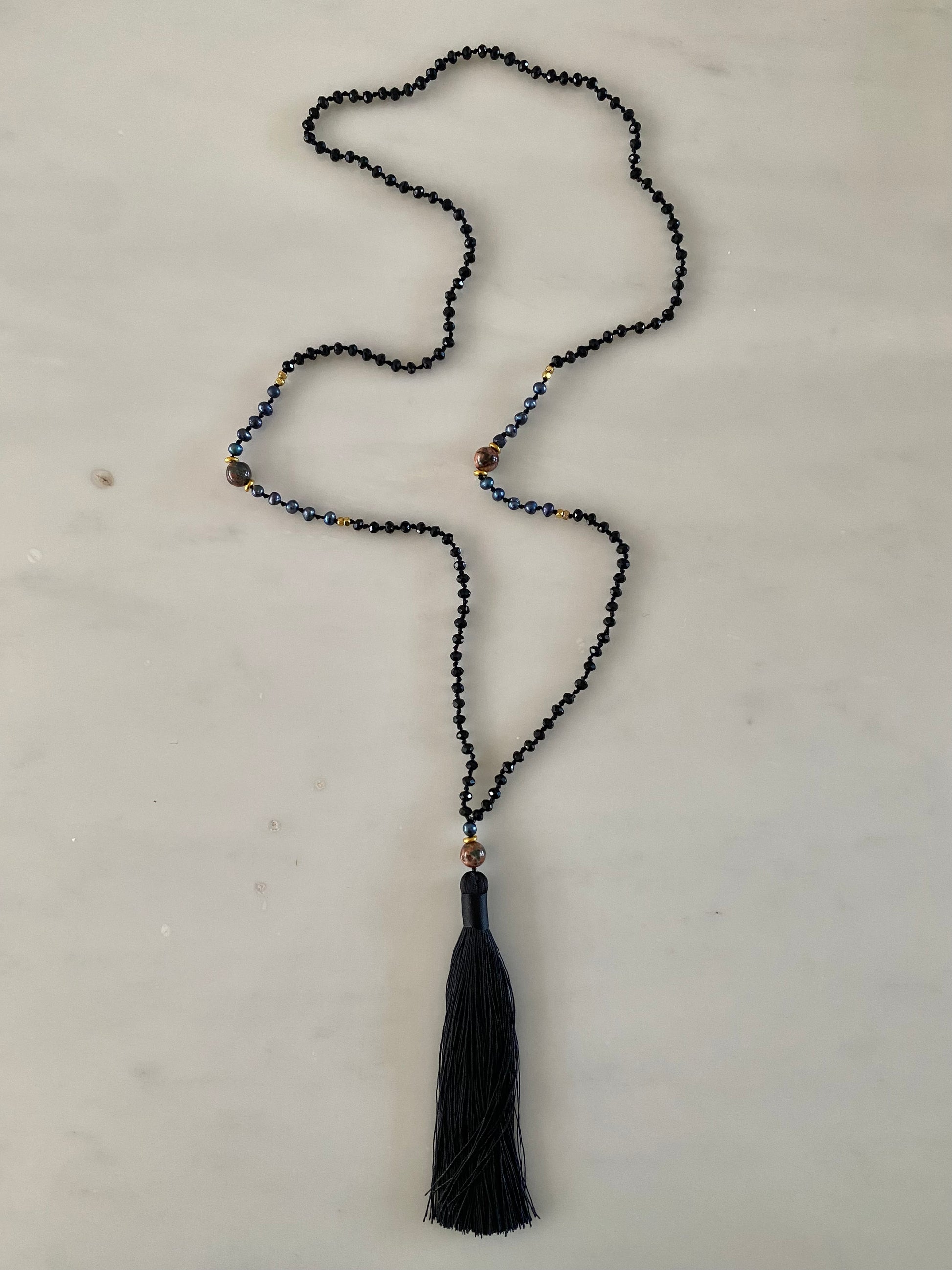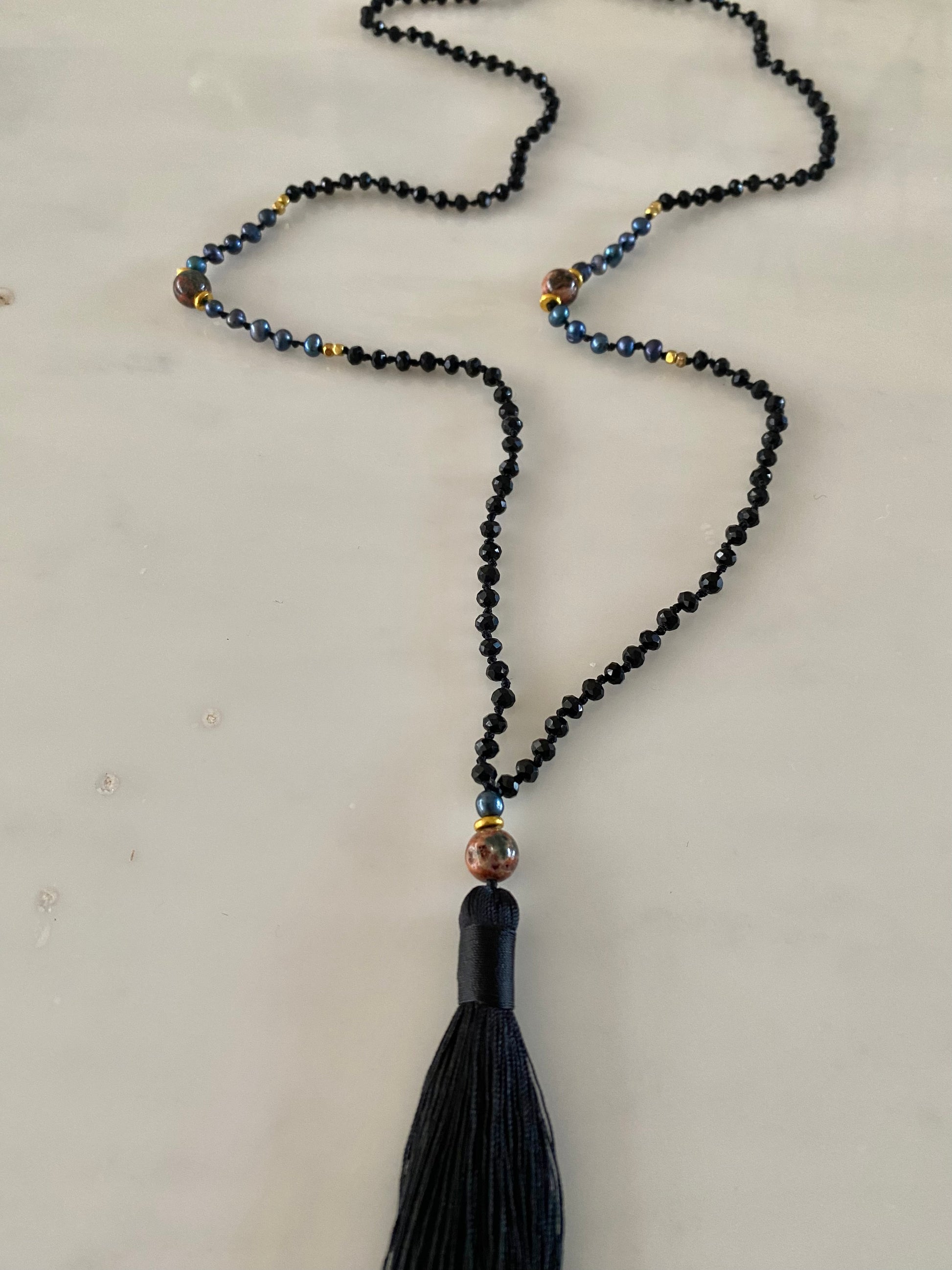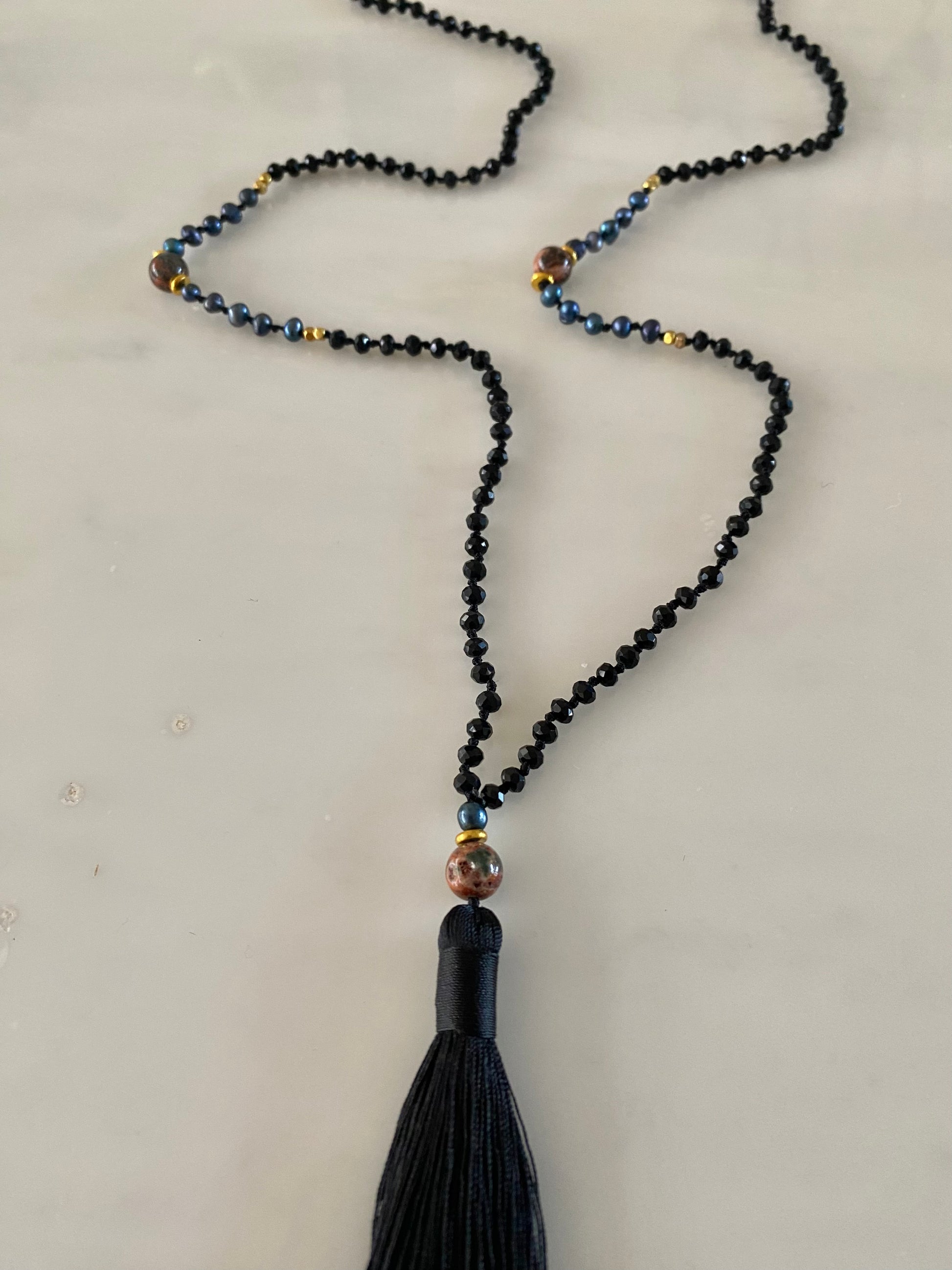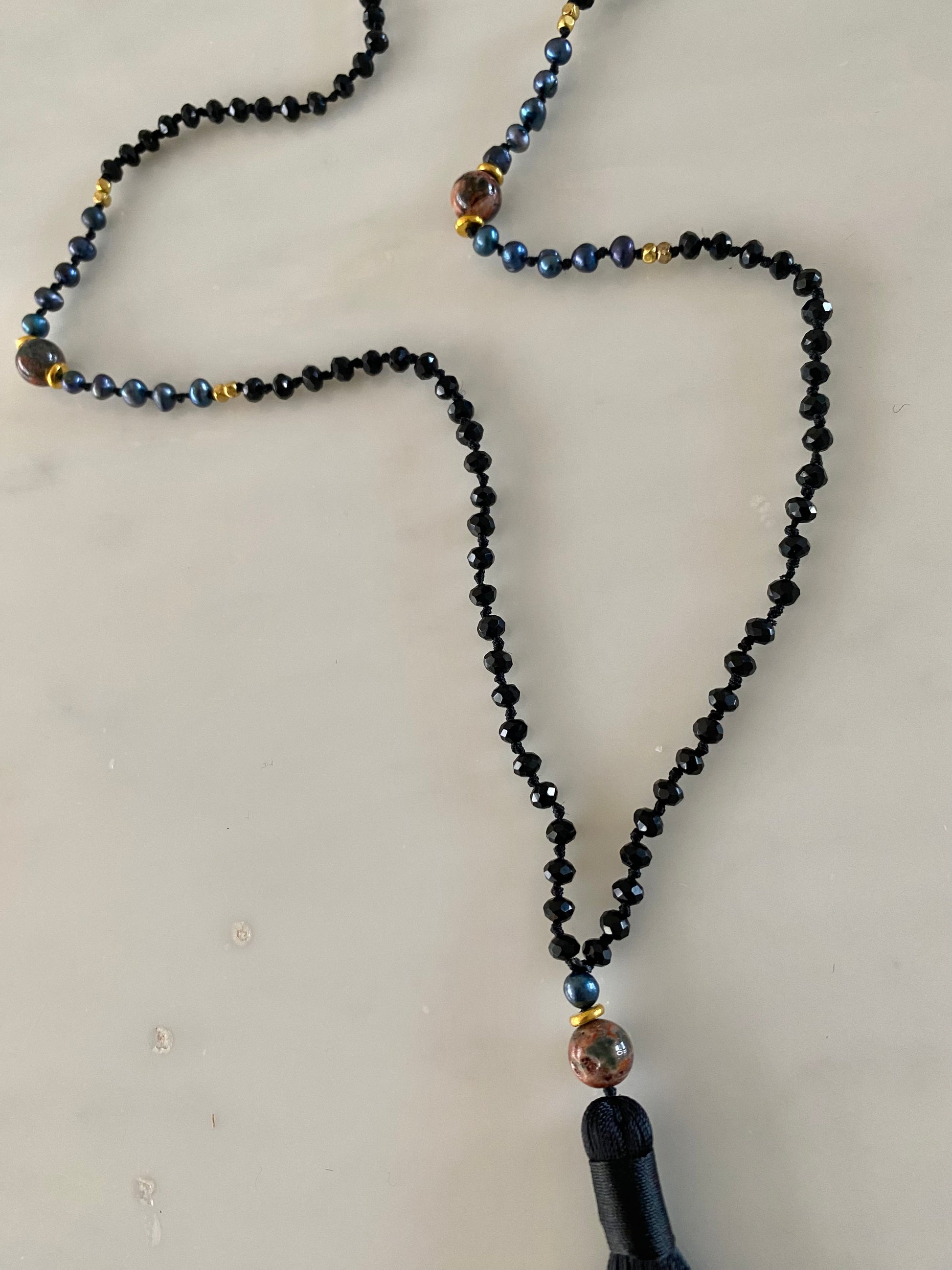 A further pearl and agate sit before the black hand made tassel. A sophisticated necklace with intrigue.