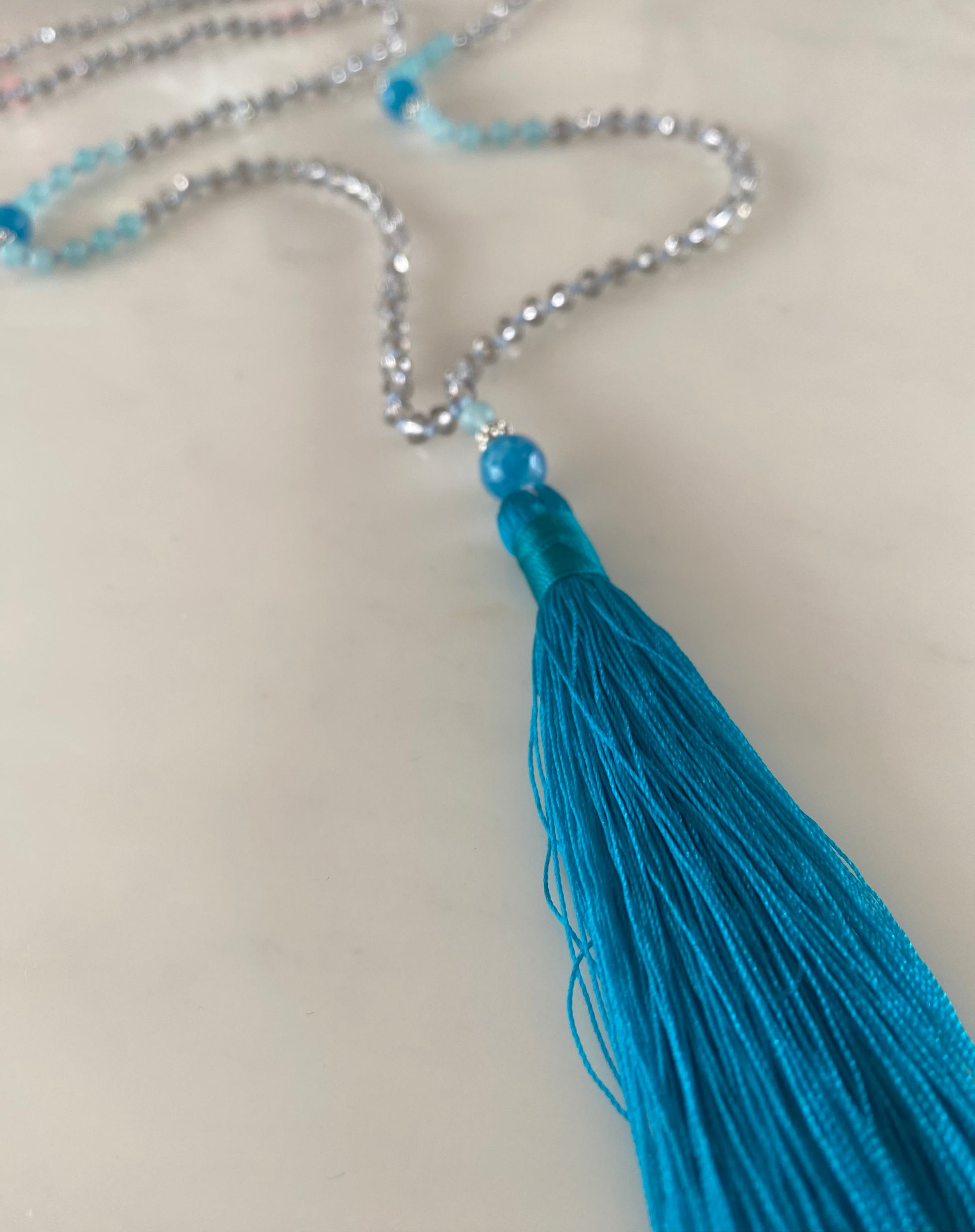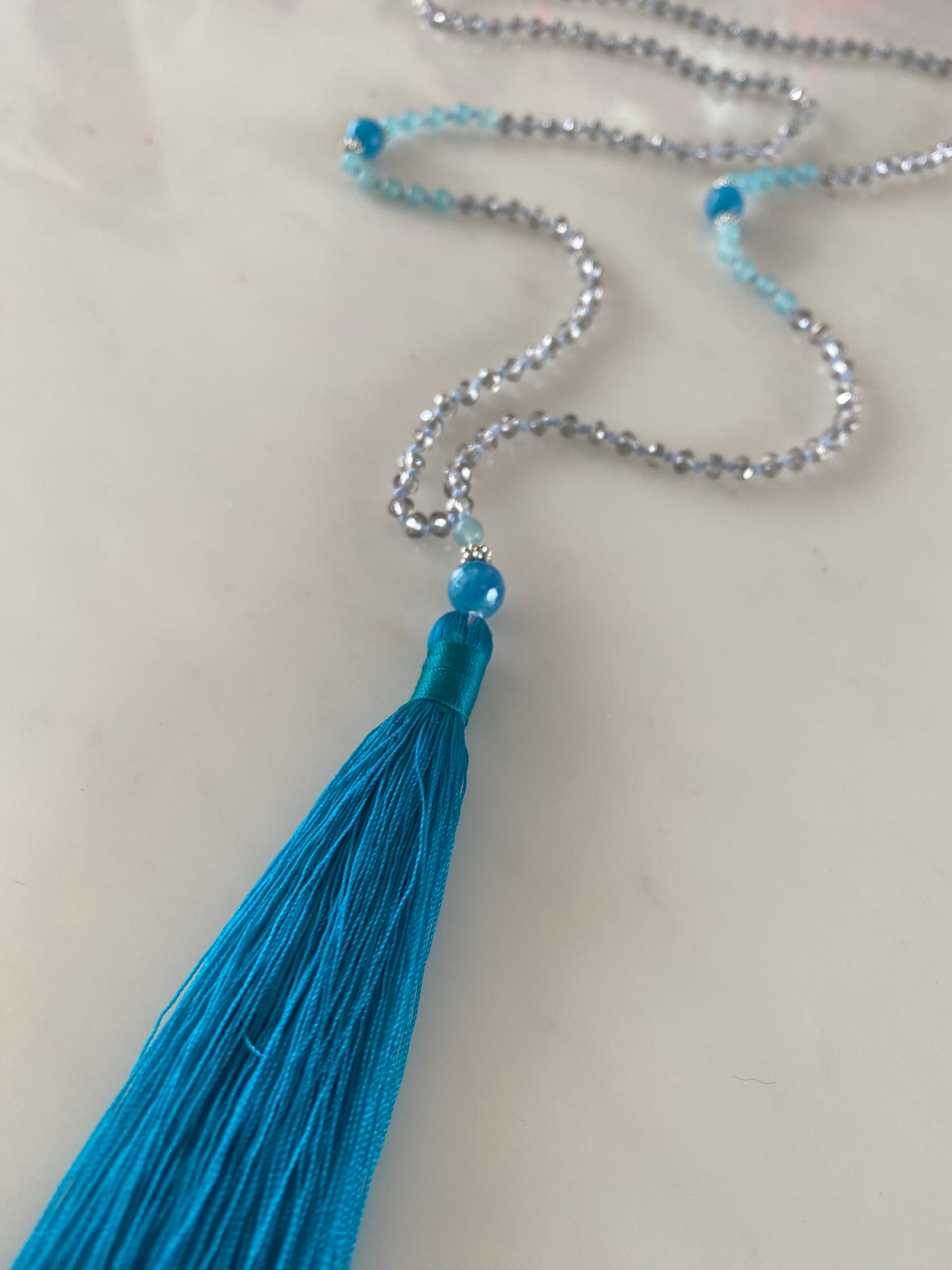 This striking deep teal necklace is fabulous colour pop. Hand knotted with transparent grey crystals in pale blue thread. It has large deep faceted teal agate semi precious stones at its centre, surrounded in smaller semi-transparent, light blue agate semi precious stones. Another of each sit before the beautiful vibrant teal tassel.
