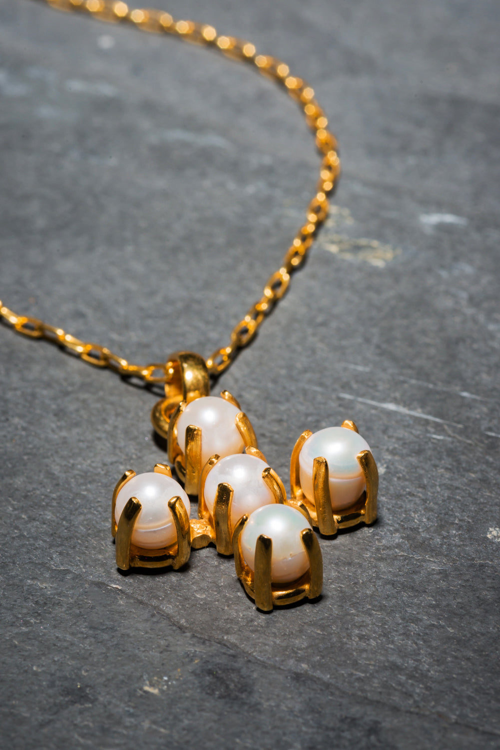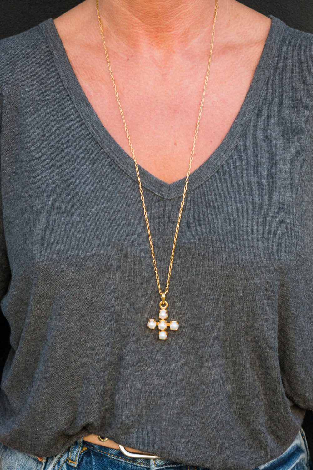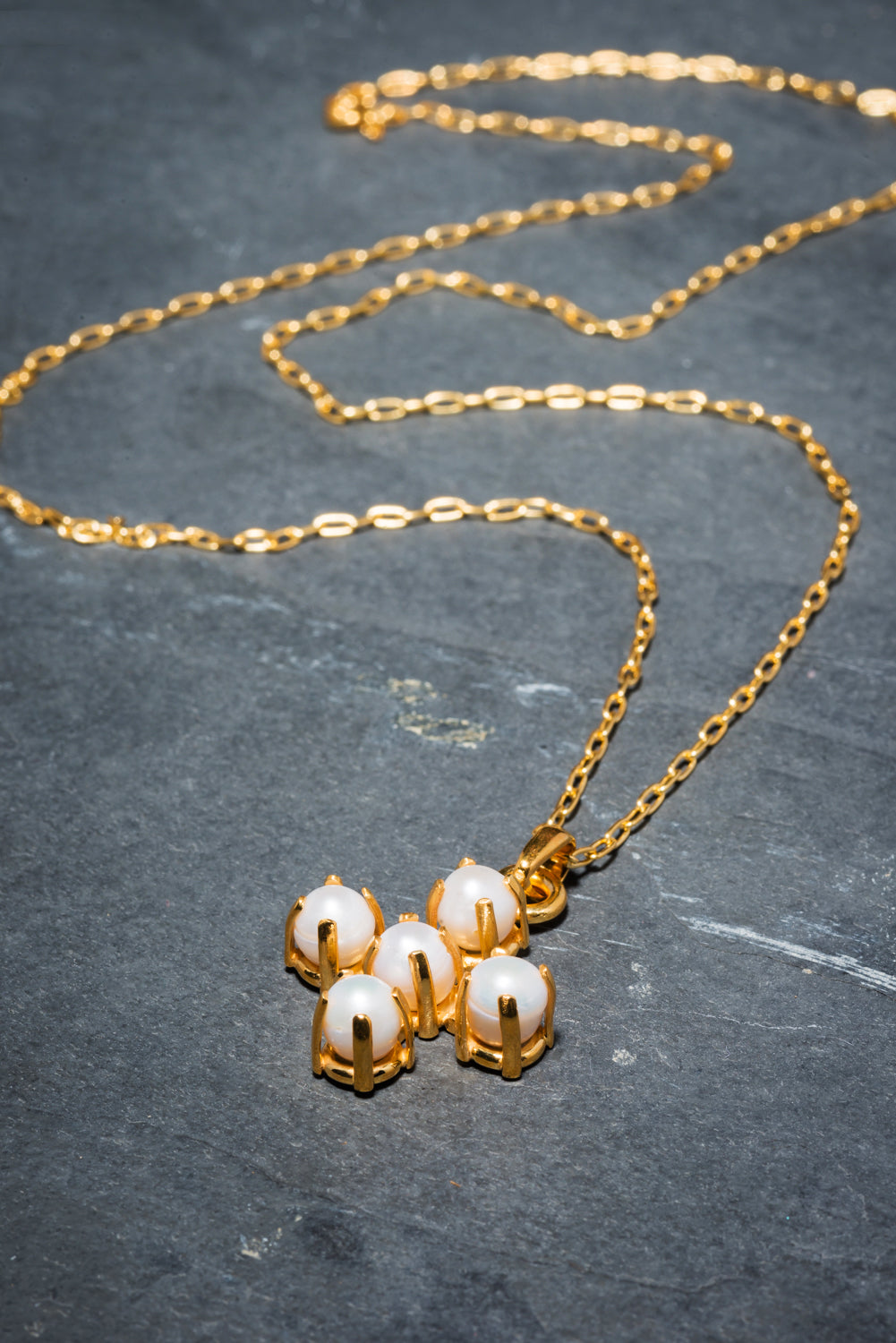 A beautiful handmade pendant, made by our artisan. It is set in gold plated 925 silver. Five white pearls are claw set into the cross for a luxe rock and roll chic vibe.
