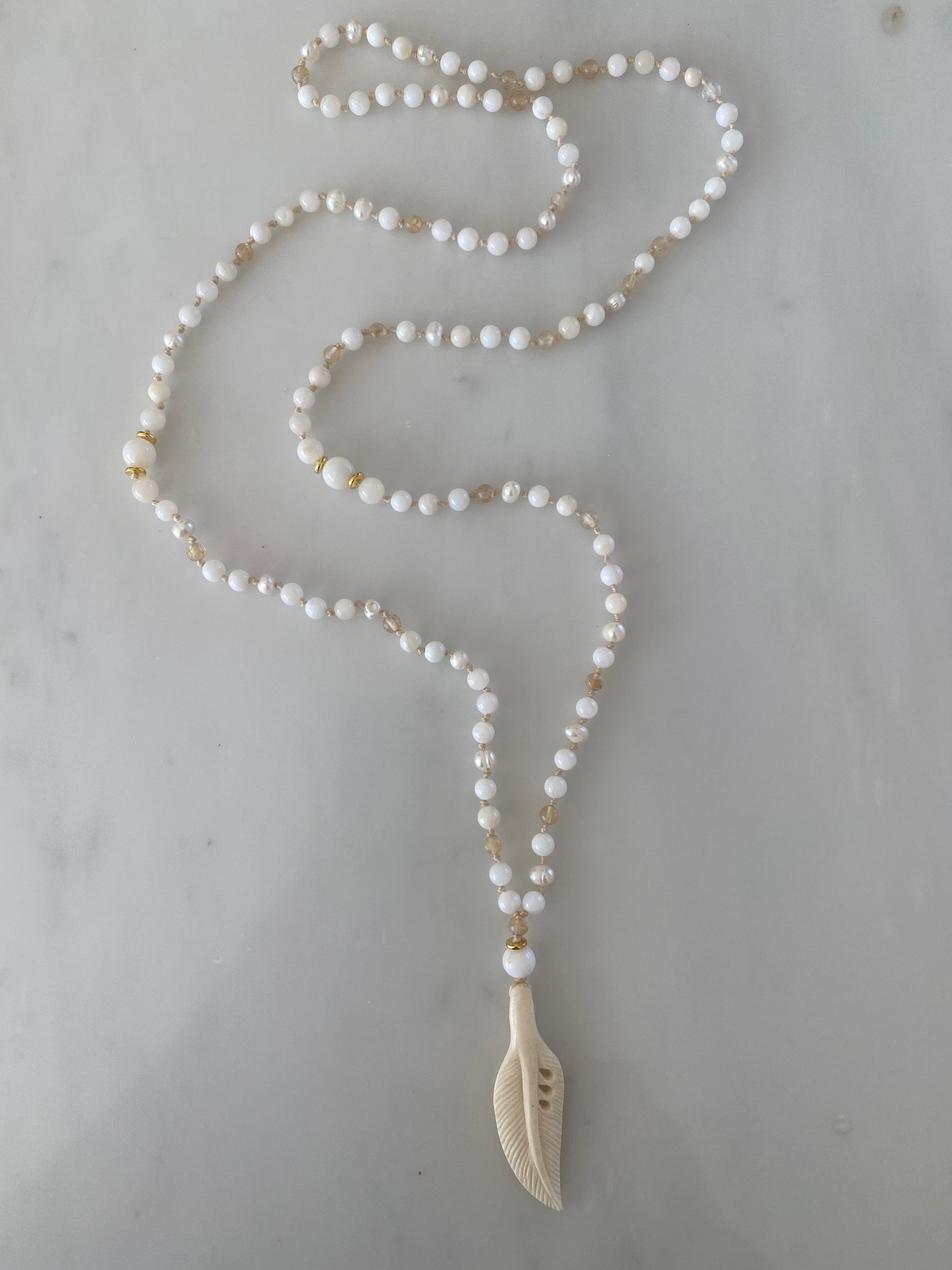A subtle and easy to wear, limited edition piece with hidden power. Hand knotted smooth shell beads, fresh water pearls and rutile quartz semi precious stones. Finished with a feather pendant painstakingly hand carved from ethically sourced horn, by our artisan carver.