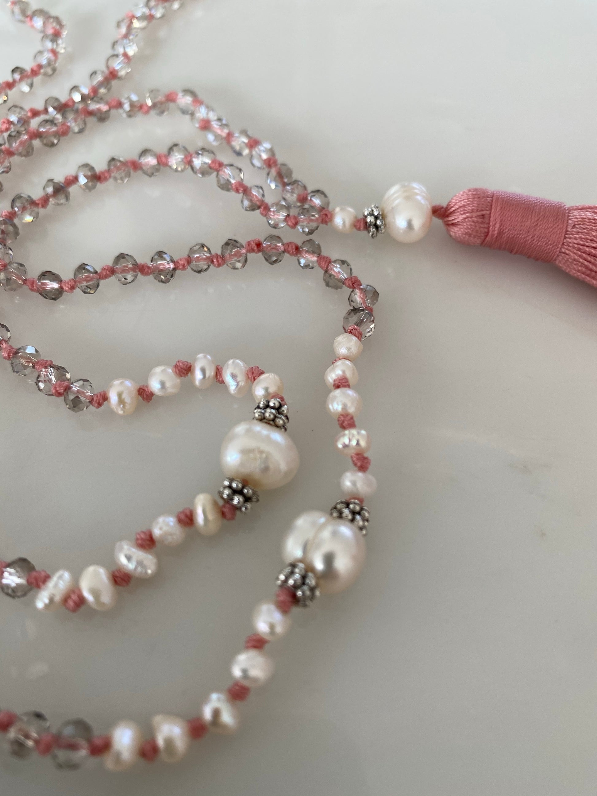 This playful and pretty boudoir style necklace is made up of small and larger white pearls, hand knotted in soft pink thread. Finished with a sophisticated soft pink tassel.