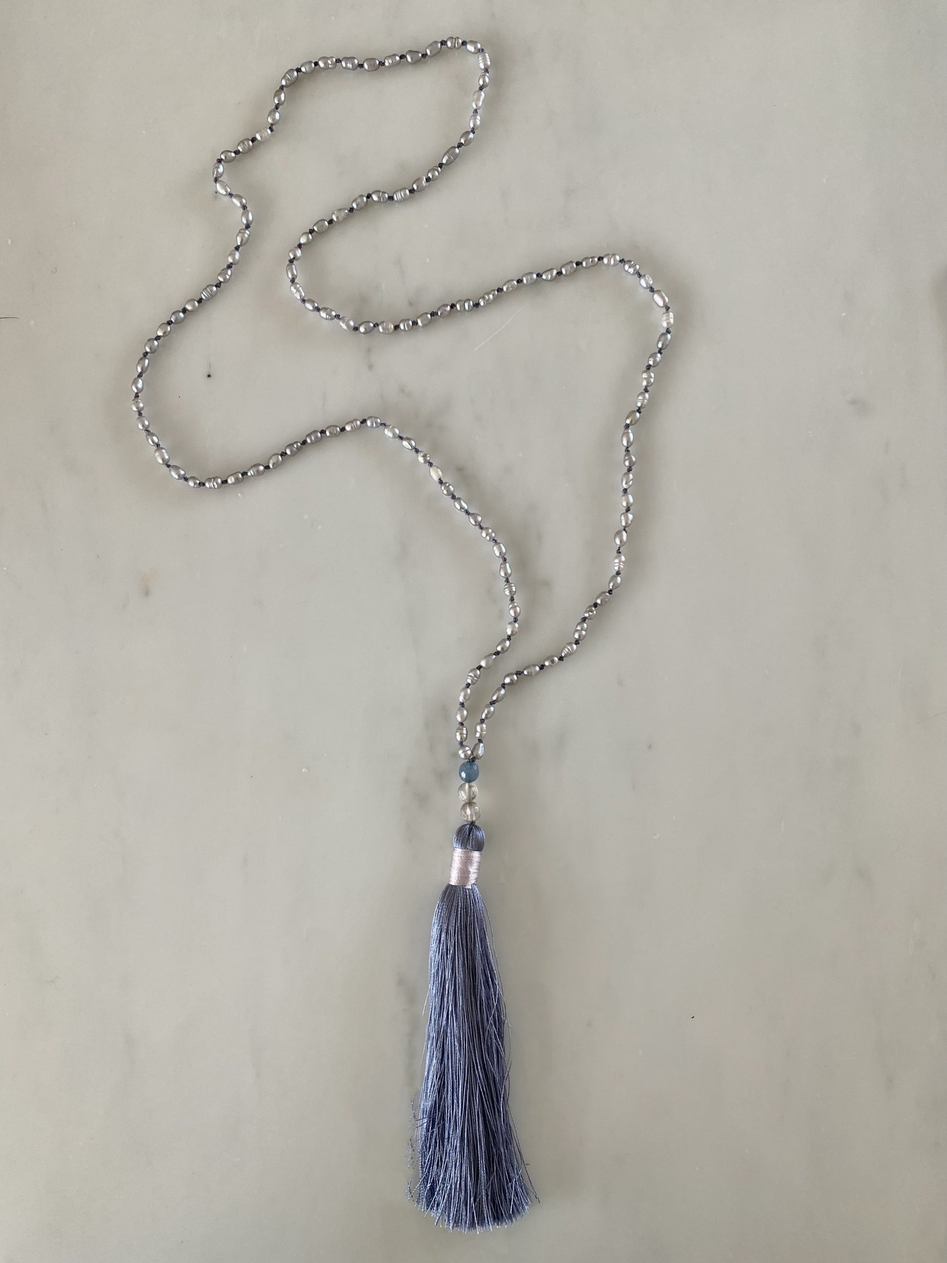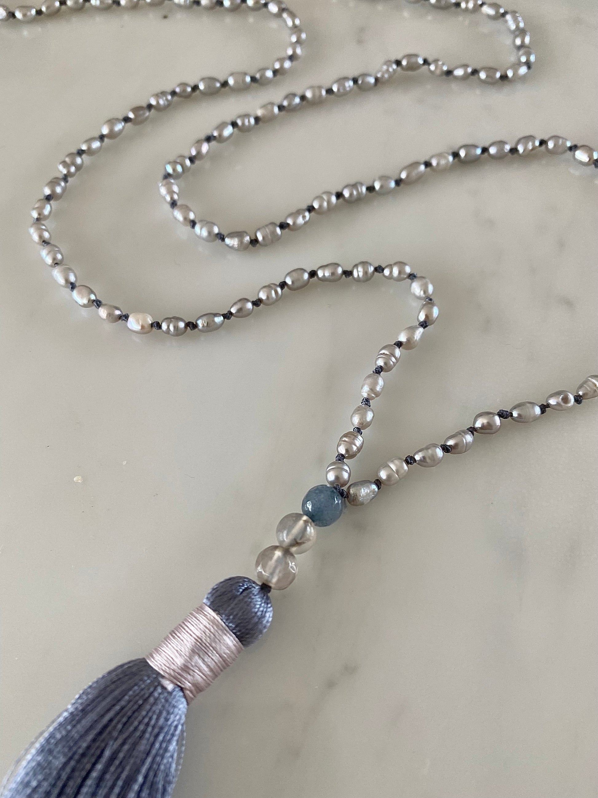 This Beautiful full pearl tassel necklace is a soft and simplistic beauty. Made of natural iridescent grey fresh water pearls hand knotted with grey silk thread. At the end are three storm grey and light grey semi precious agate stones, before the silvery storm grey silk tassel grey tassel, wrapped in light pearly grey silk thread.