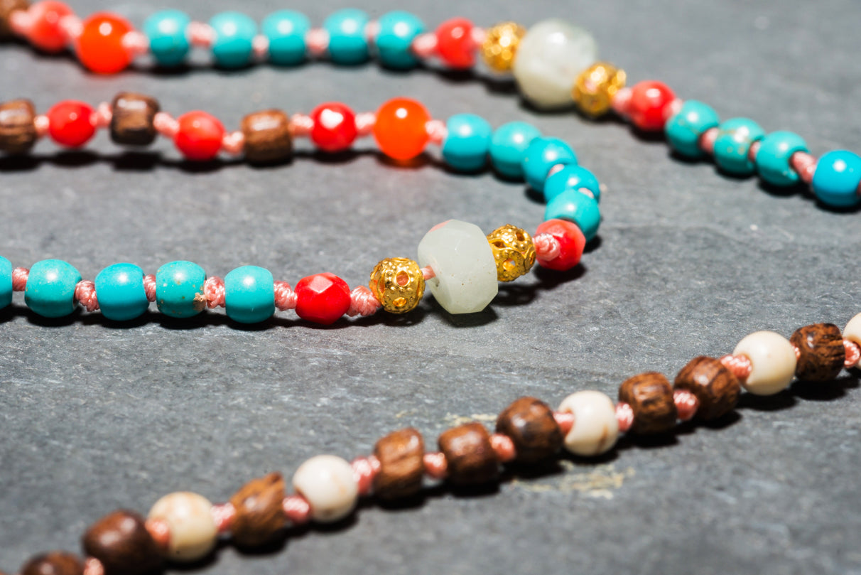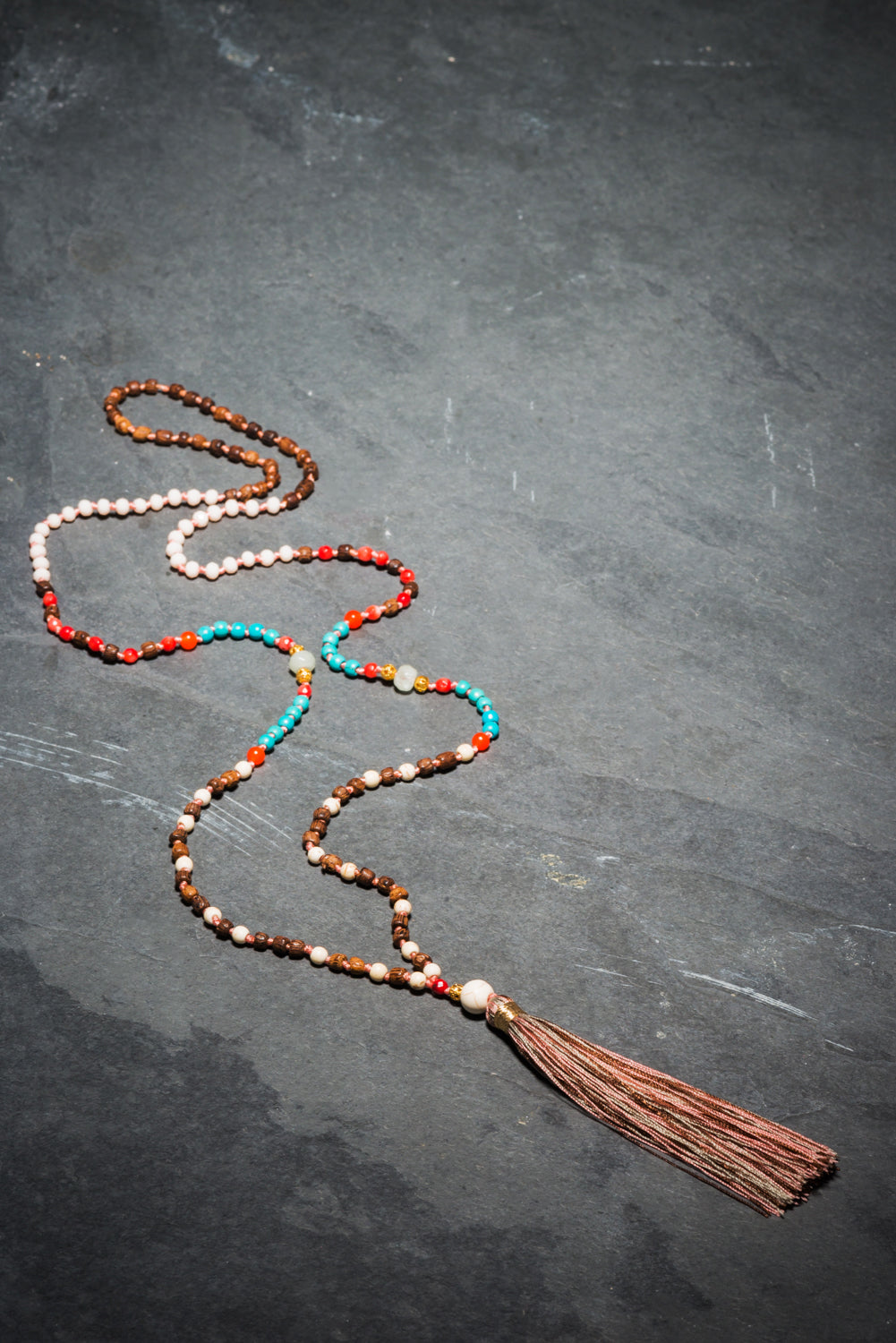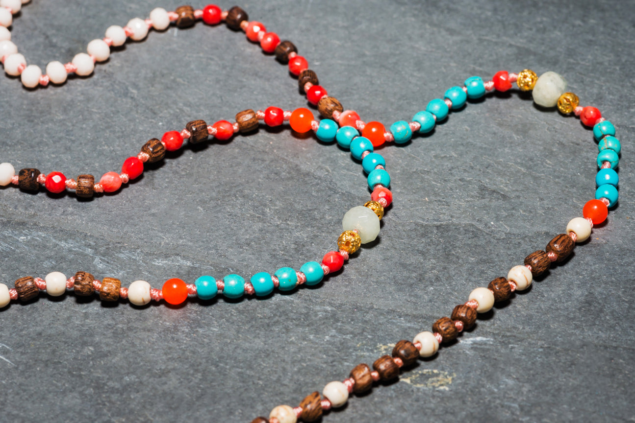 This necklace is inspired by the hues of the beautiful fabrics, majestic palaces and lively festivals of Rajastan. It is made up of wood, cream stones, semi-precious turquoise, cherry quartz and a smattering of cream and red opaque crystals.