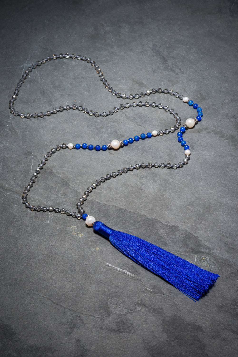 Grey transparent crystals are knotted in grey thread with bright blue crackle agate between small freshwater pearls and a round white centre pearl. A round white pearls sits before the royal blue tassel. Wear it to Henley, wear it sailing, wear it with your favourite jeans and summer dress, the list is endless.....