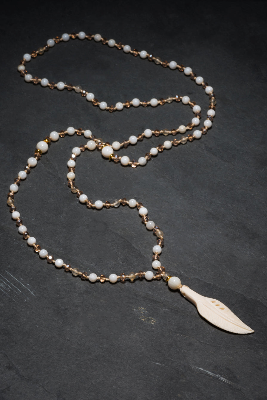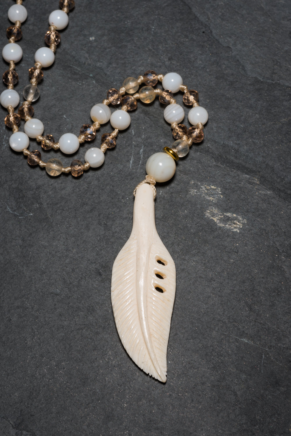 A subtle and easy to wear, limited edition piece with hidden power. Hand knotted smooth shell beads, rutile quartz semi precious stones and crystals. Finished with a feather pendant painstakingly hand carved from ethically sourced horn, by our artisan carver.