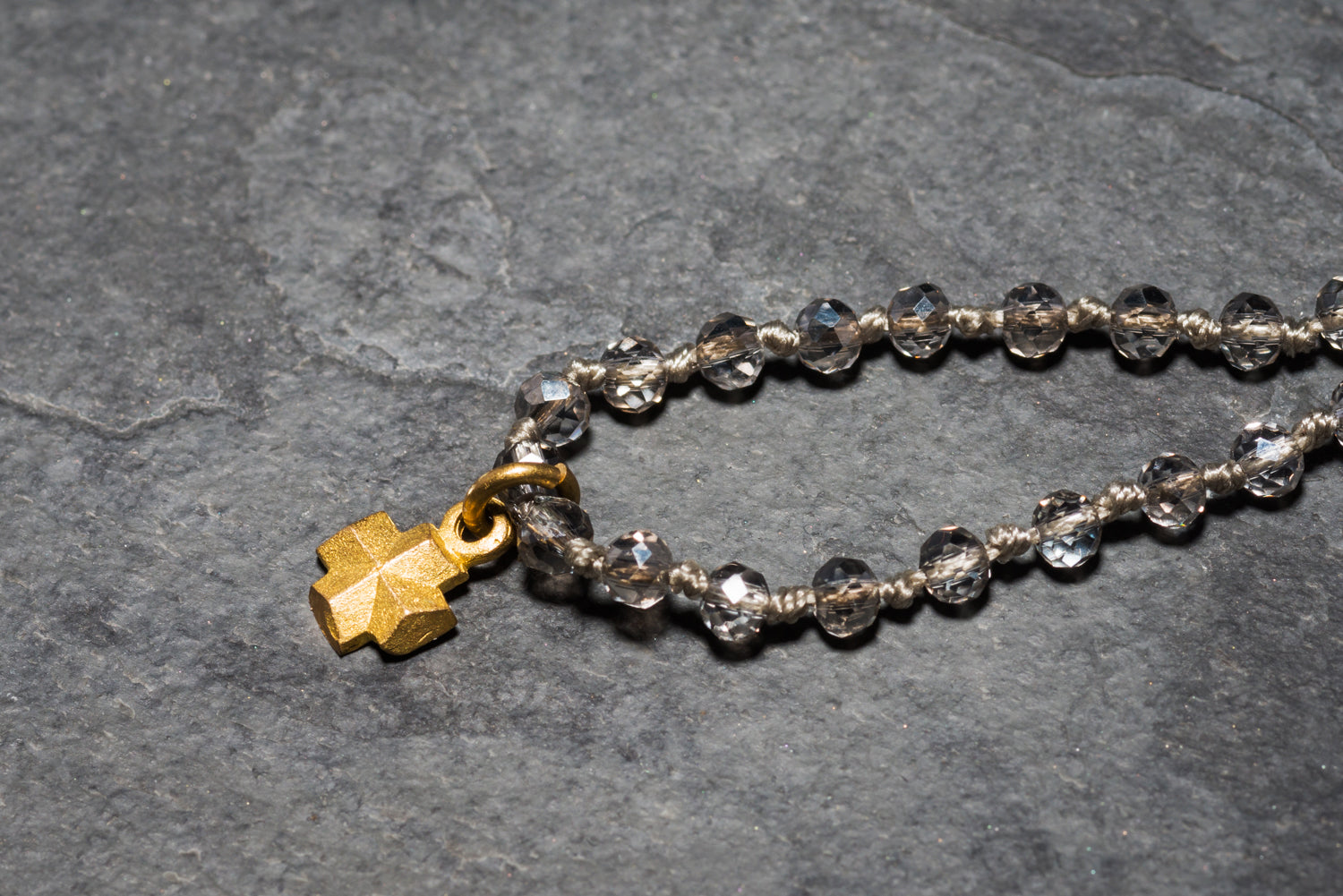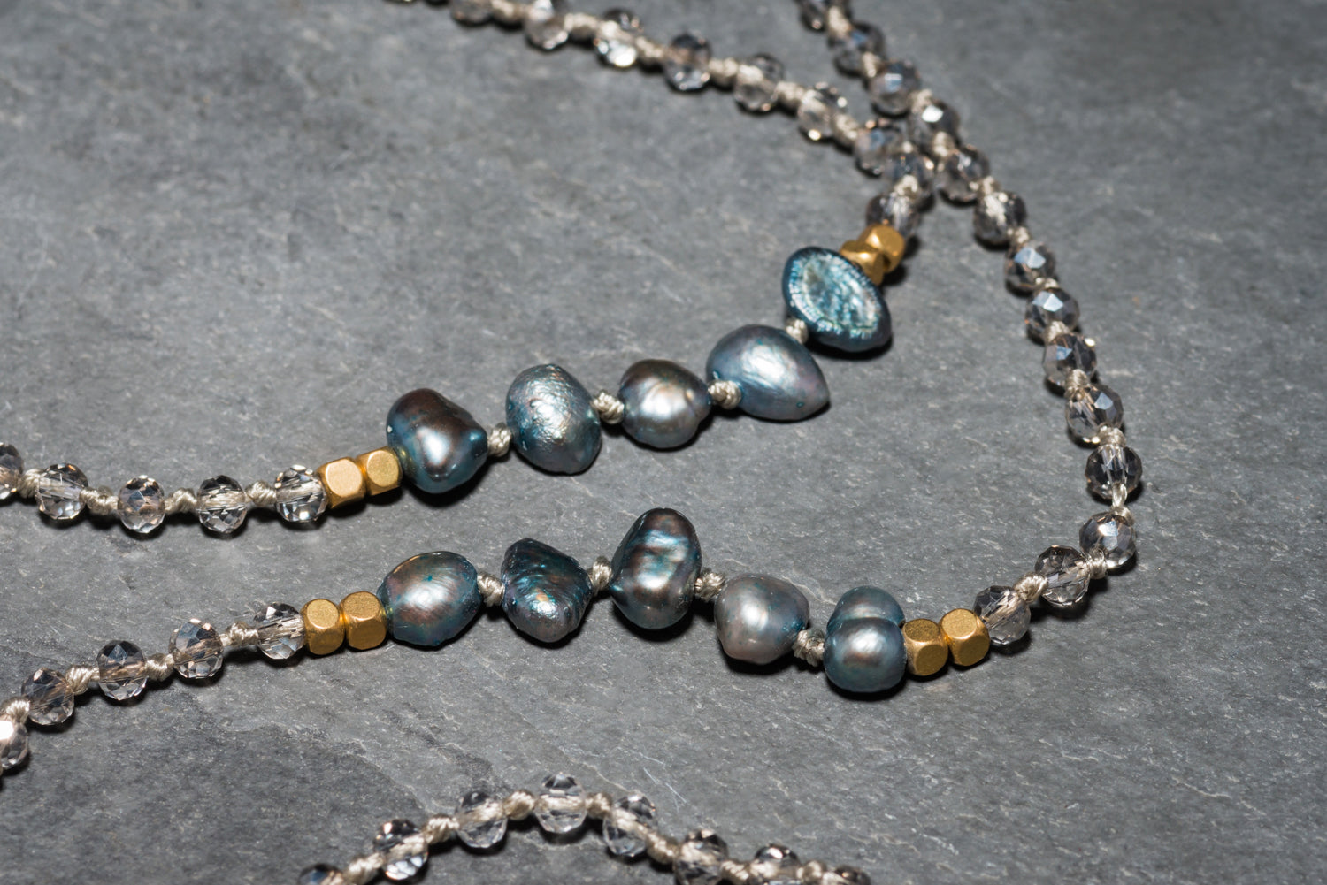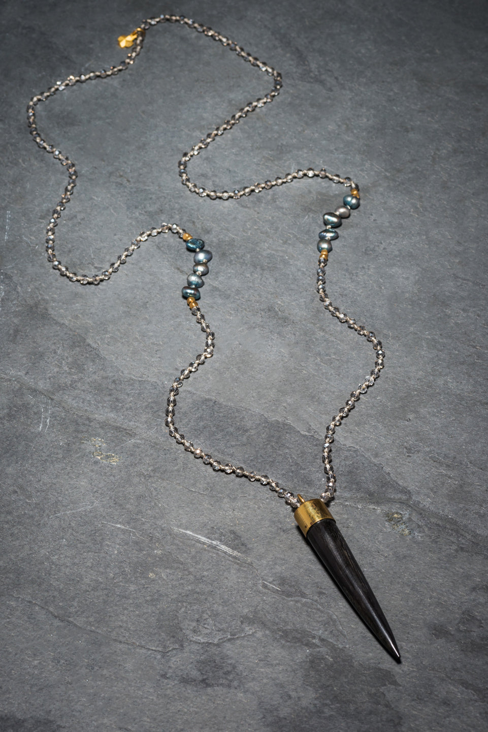 A simple and elegant tusk pendant to wear and layer with other necklaces. Hand knotted with fine grey crystals, a row of gleaming silver pearls sit at it's centre with golden brass cubes either side. It is finished with a hand carved black horn pendant set in hand cast brass, made by our Maasai artisan.