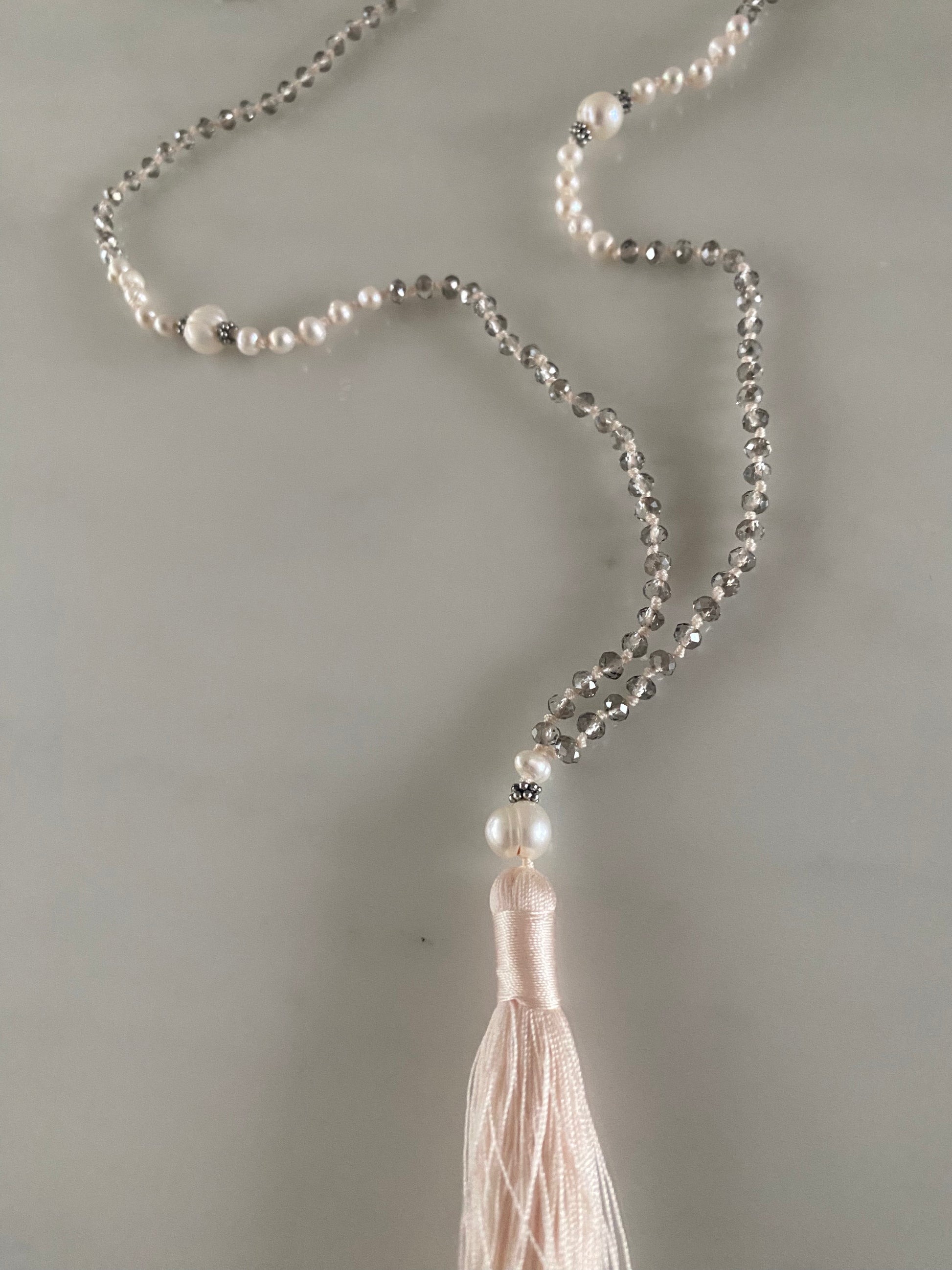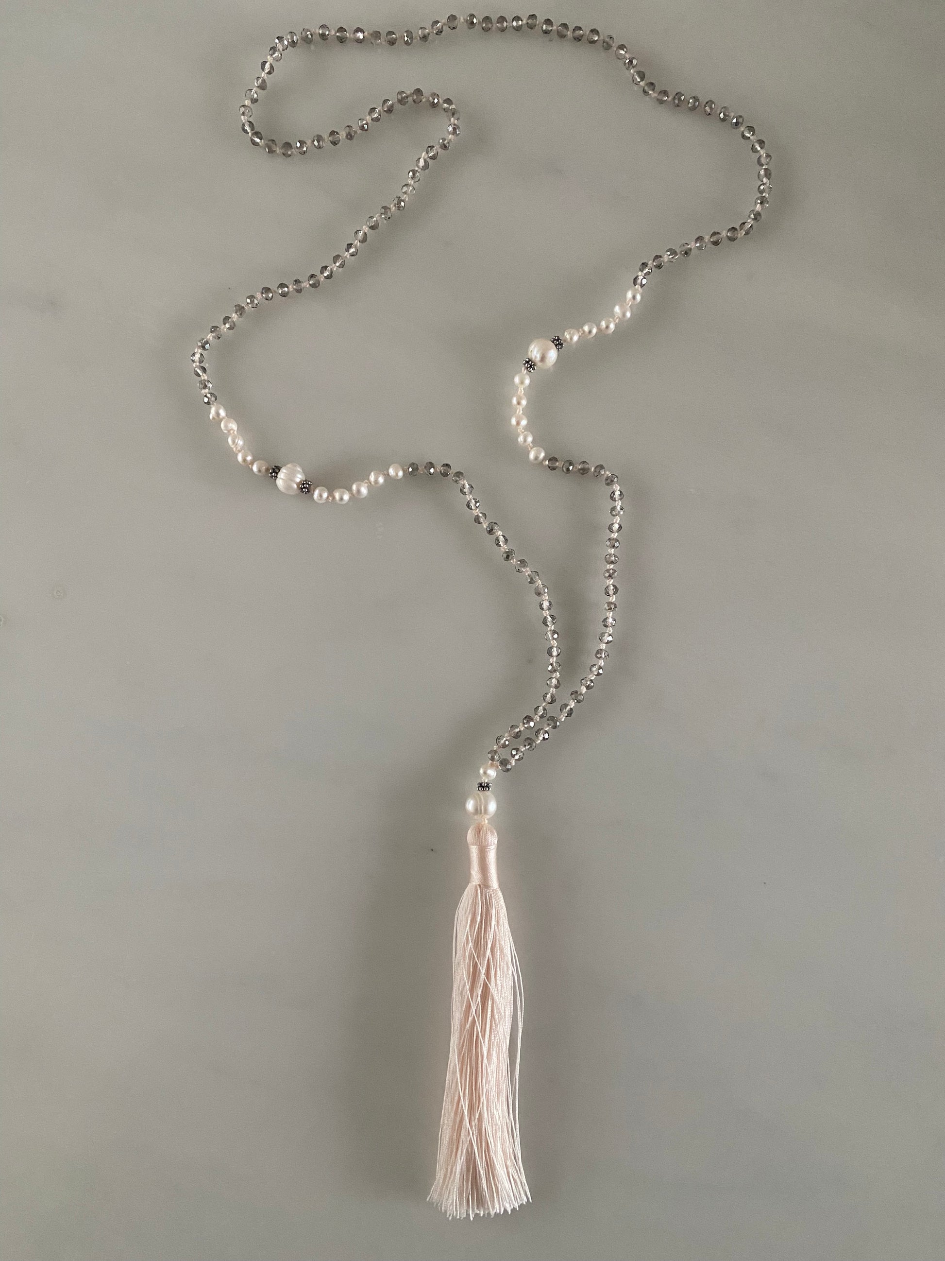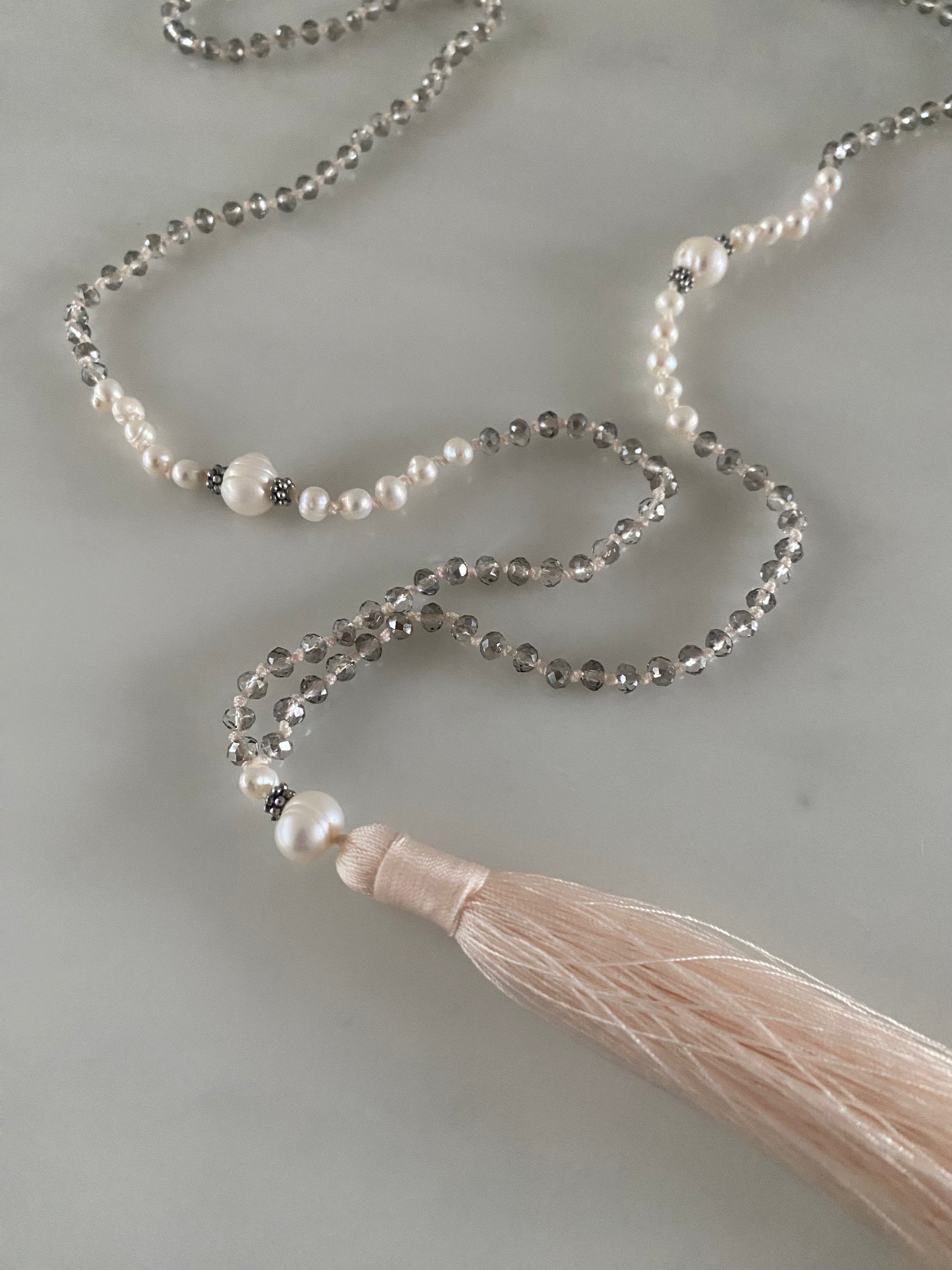 Hand knotted with transparent grey crystals in cream thread. At its centre sit substantial white pearls surrounded in white fresh water pearls, highlighted with antique silver tone separators At the end a further white pearl before the antique cream tassel which is almost tinged peach-pink.