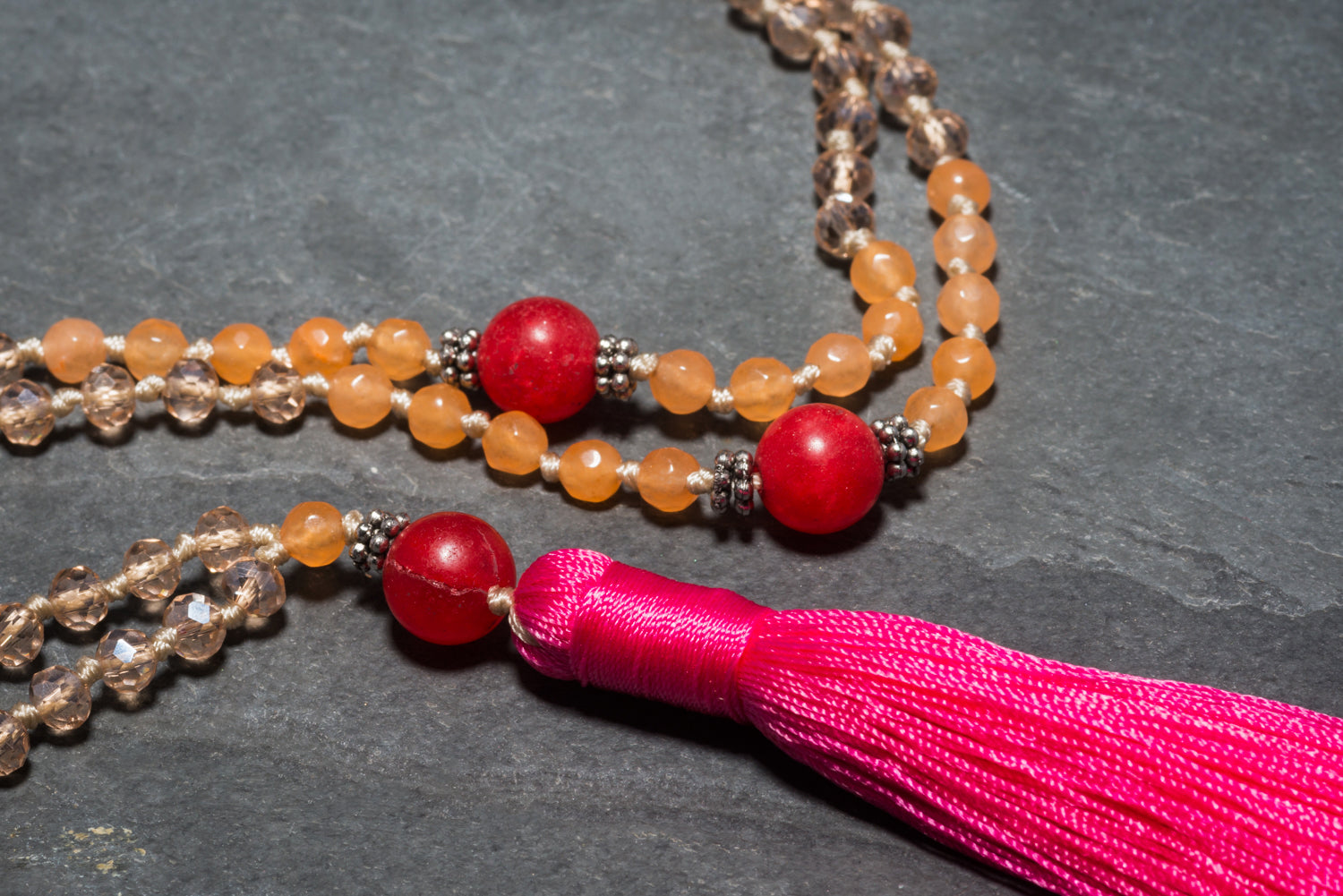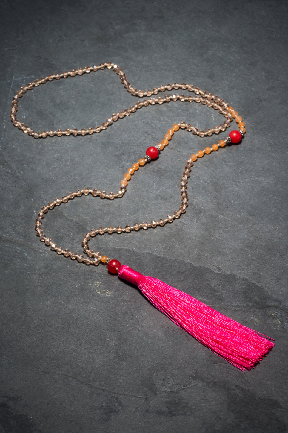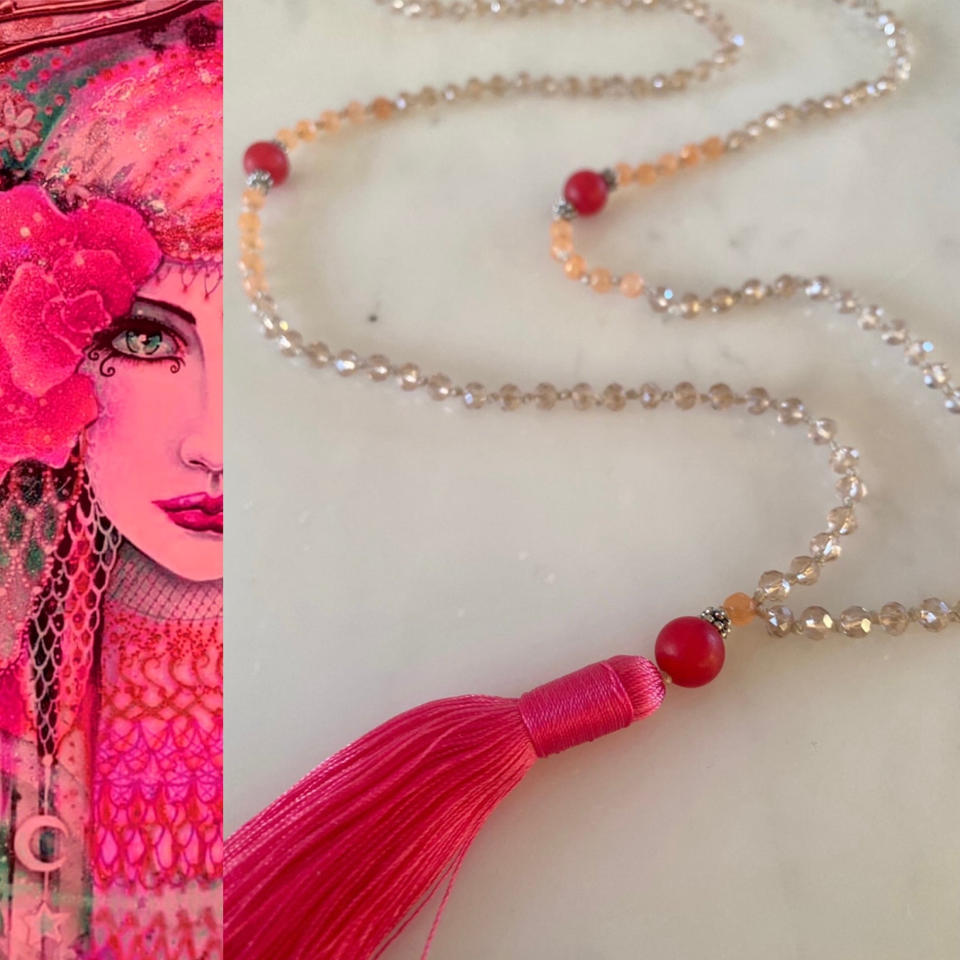 A warm and fun loving vibe. Softer pink than our neon pink necklace, but still with warmth, spirit and vibrancy. This necklace is made up of warm champagne crystals, hand knotted in light silver grey thread. At it's centre sit glowing warm pink agates, surrounded with smaller, peach pink faceted agate semi precious stones. A further glowing pink and peach agate sits before the hand made tassel of warm pink.