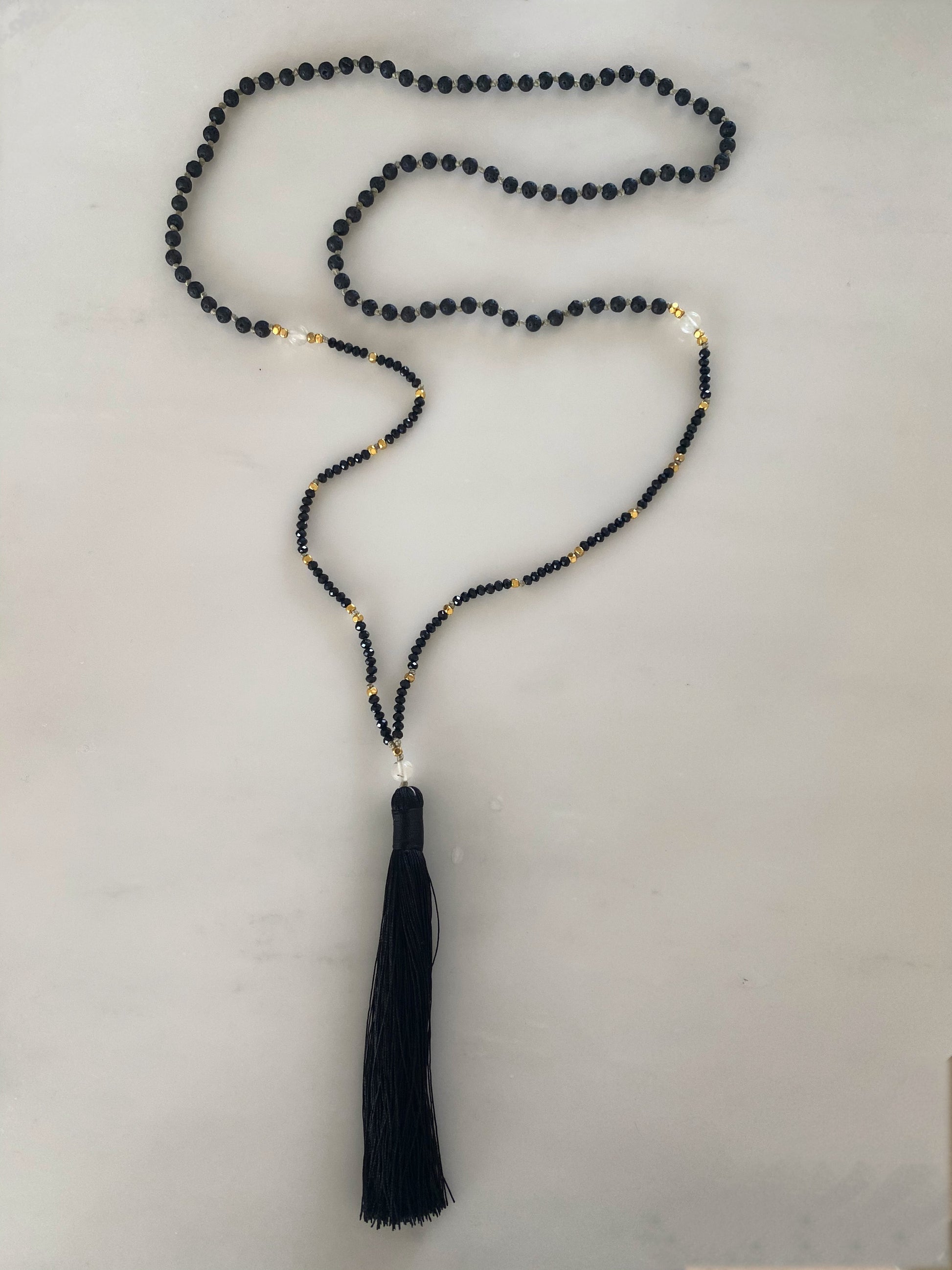 Inspired by the magic of the night sky and all that the universe is made up of....of long since departed stars of incomprehensible distances. This beautiful necklace is made up of fine black crystals with small gold cubic brass squares. The centre is made of rutile quartz which adds a brilliance inbetween the dark. The upper section is made of volcanic Matt stones For a feel of disappearing into endless expanse. There is another rutile before the simplistic black end tassel.