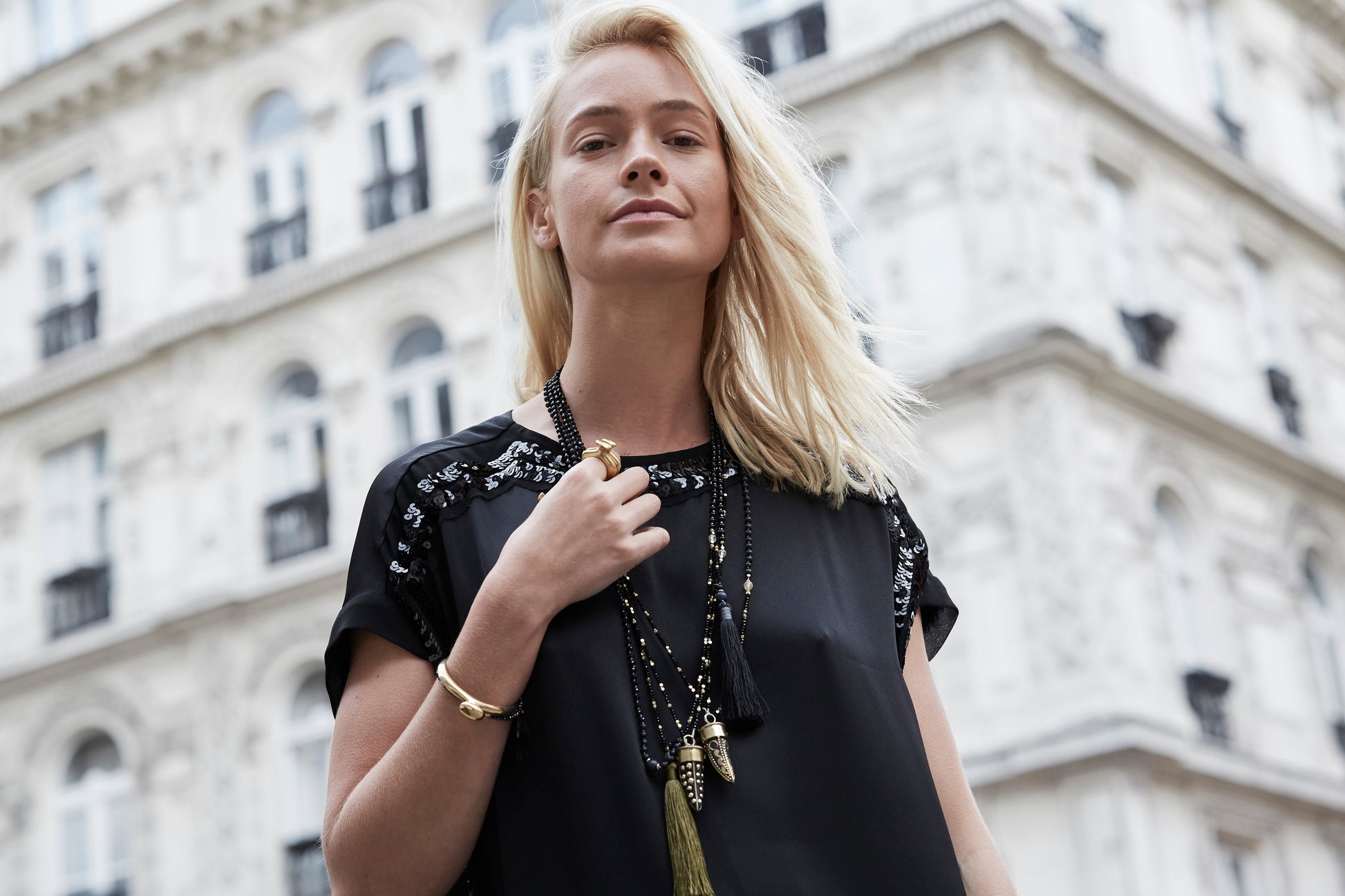 This necklace is if rock and roll went luxe global travelling. This rock and roll boho piece is hand knotted from volcanic stone, rutile quartz and black crystals interspersed with square brass beads. The tusk pendant is inset with chunky brass studding. It has a weighty feel and is great alone, but our favourite is worn layered with intergalactic tassel necklace.
