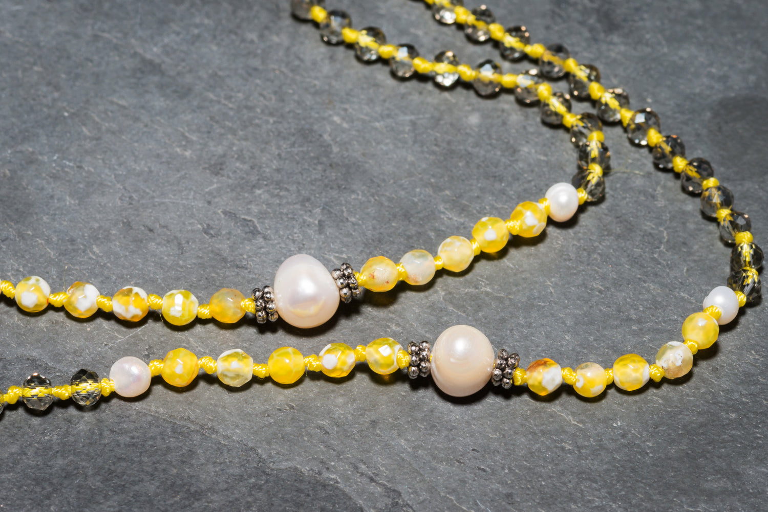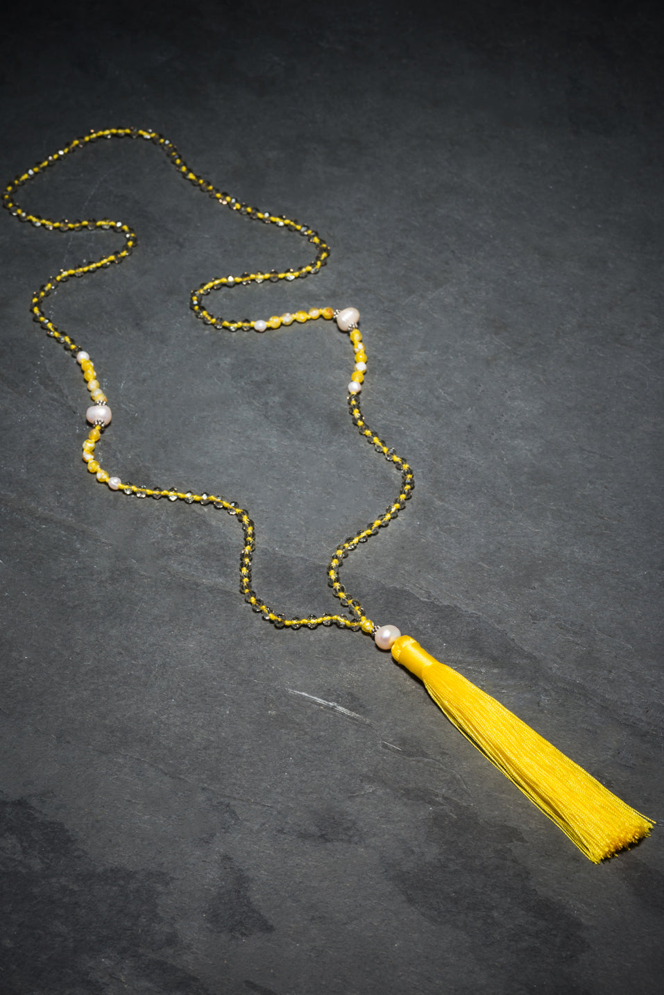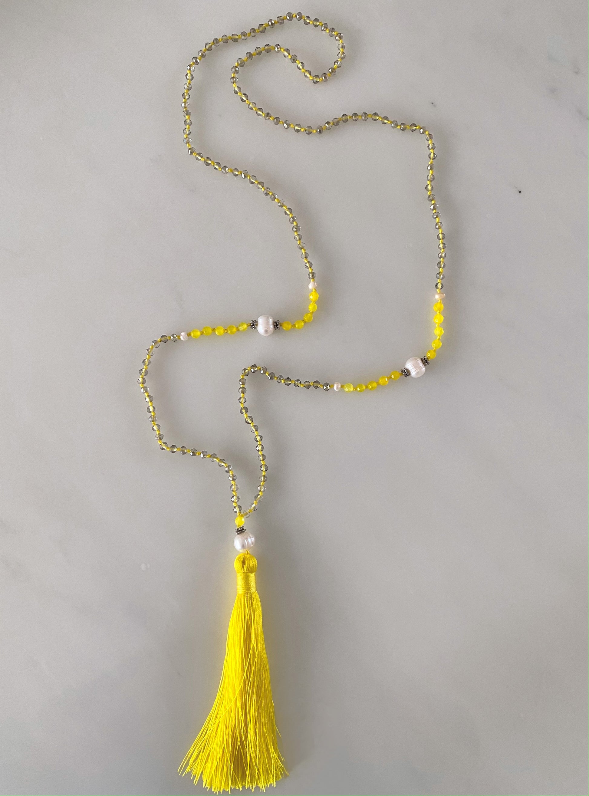 This is the sunshine yellow version of one of our classic go to necklaces. Clear crystals are intricately hand knotted by our artisan in bright yellow thread. Sunny yellow agates, large white pearls and small fresh water pearls sit at its centre. Finished with another yellow agate and white pearl and a sunshine yellow tassel!