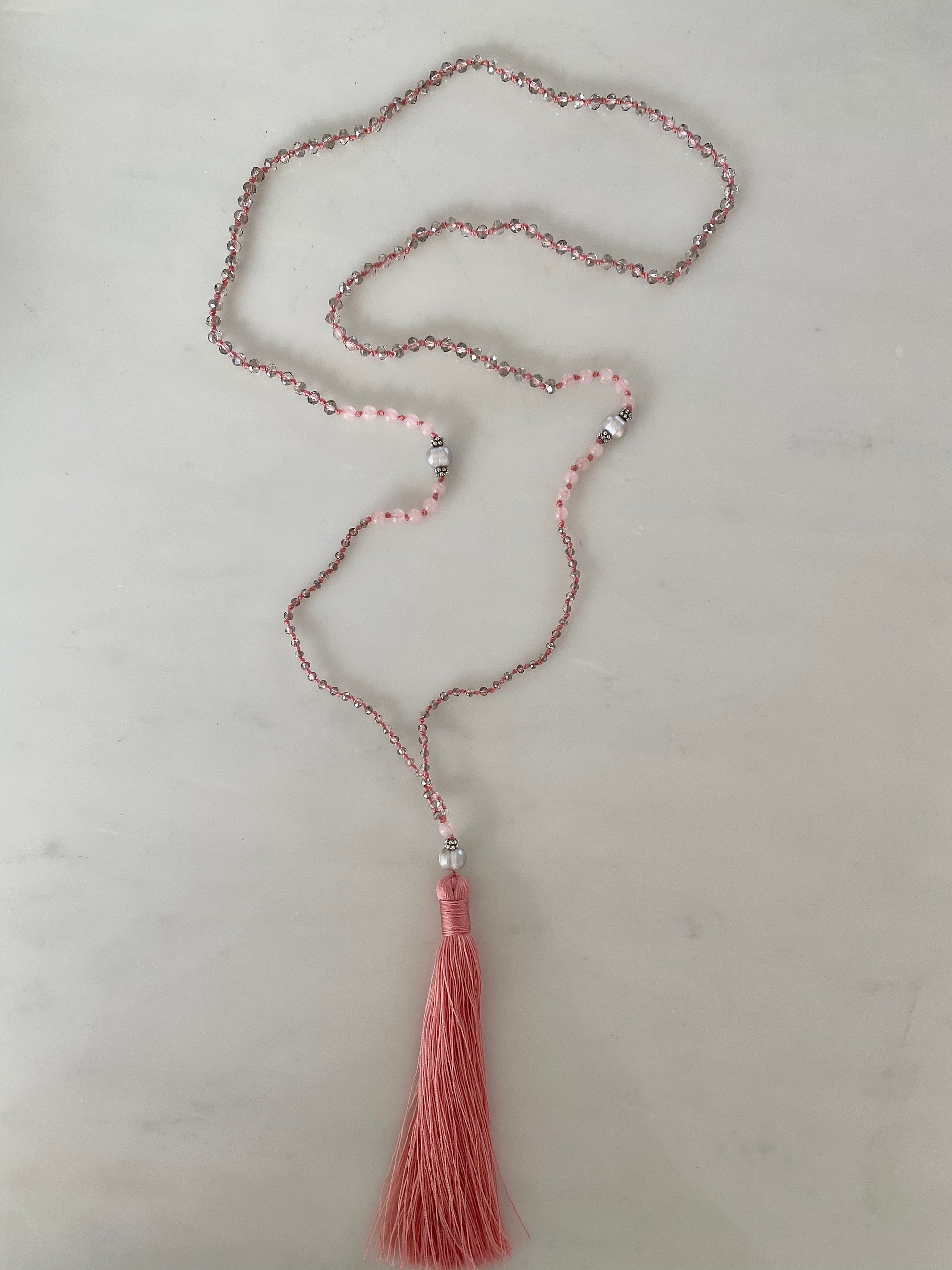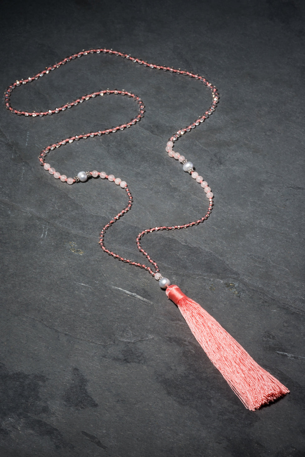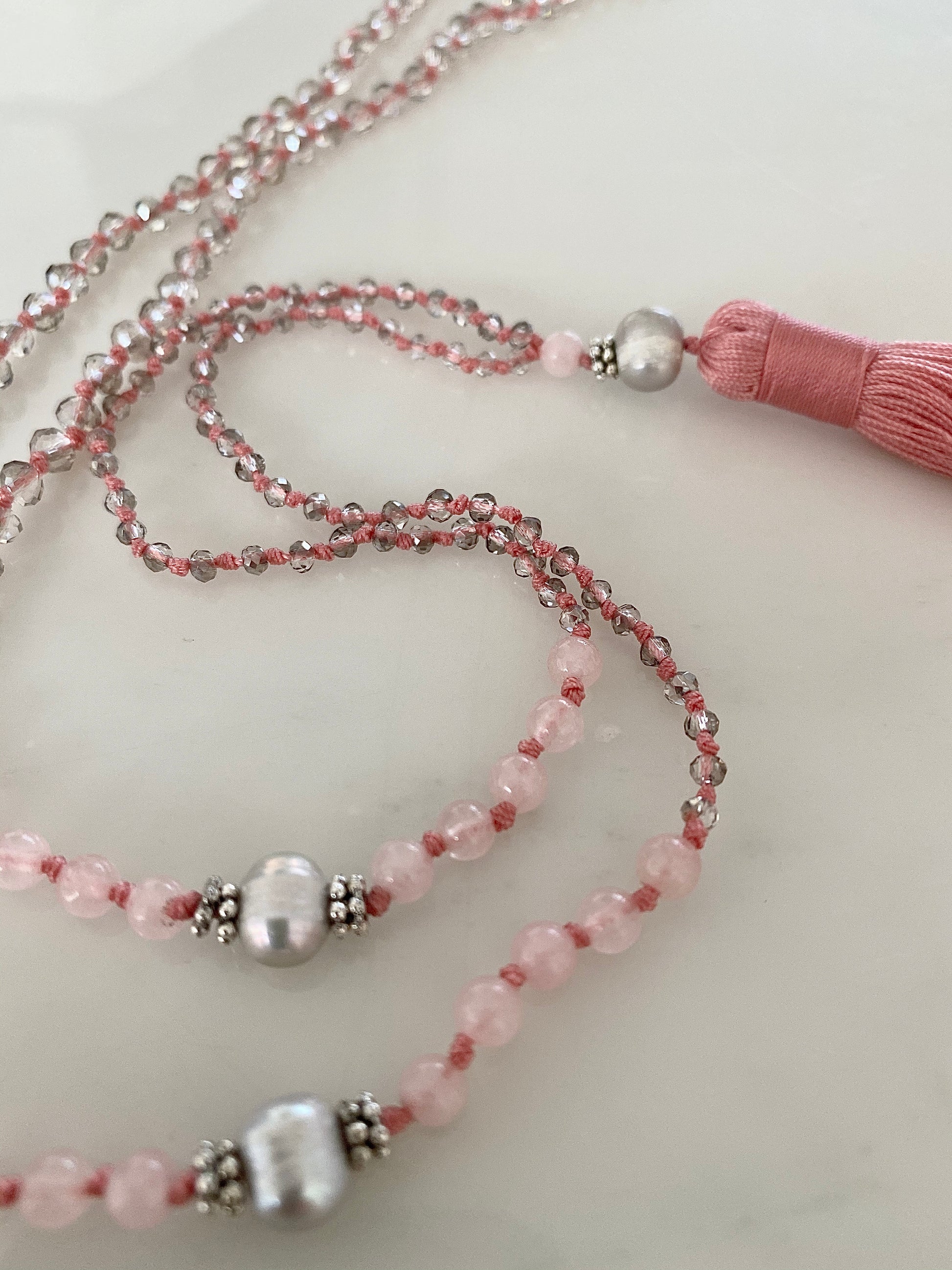 This gentle tassel necklace is made up of light grey crystals, soft pink agates and large grey pearls. Finished with a sophisticated soft pink tassel.