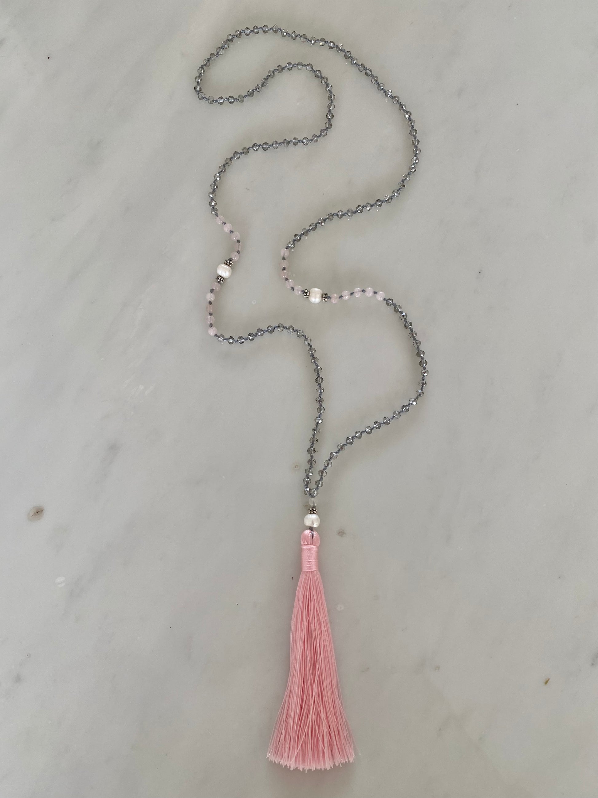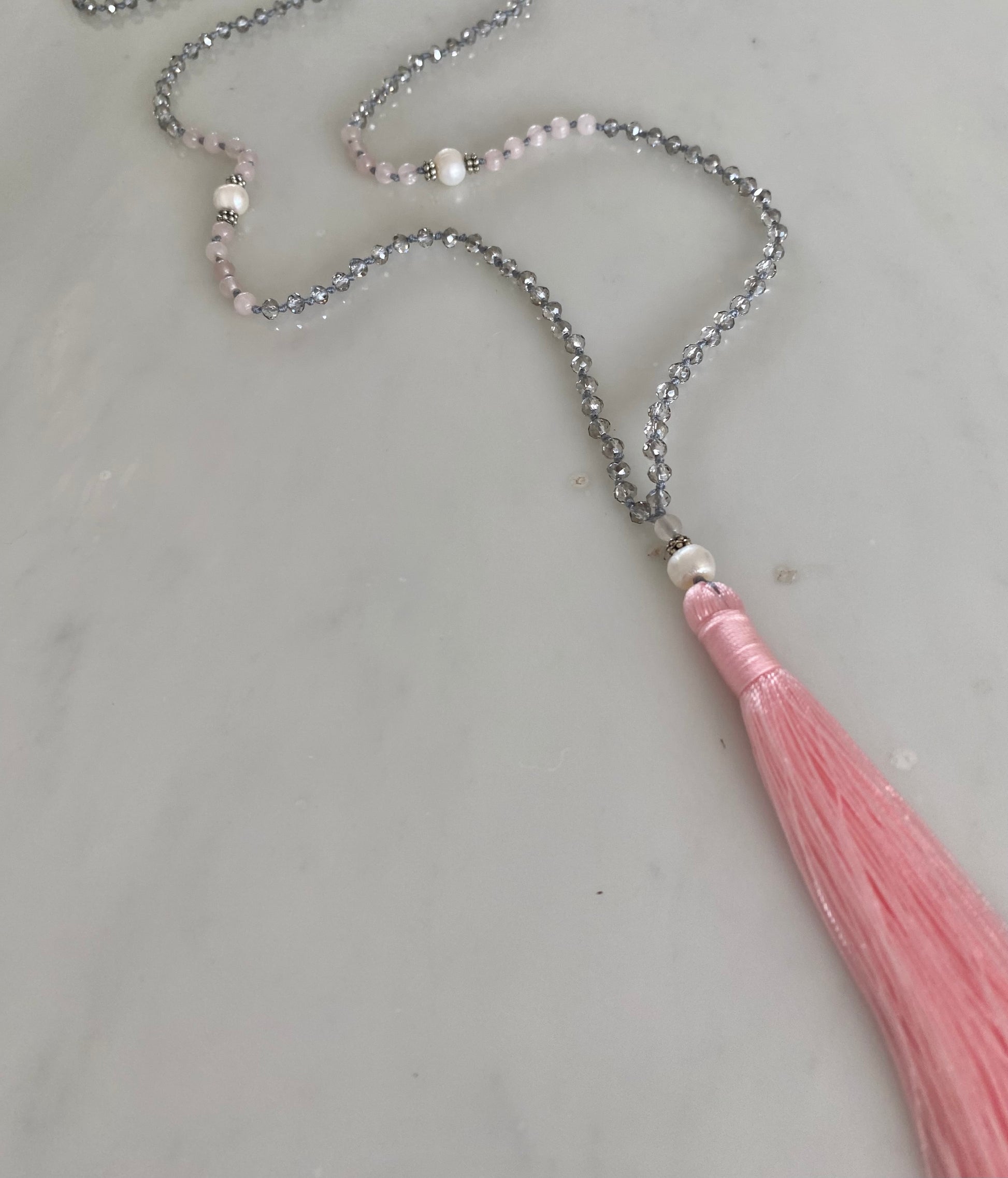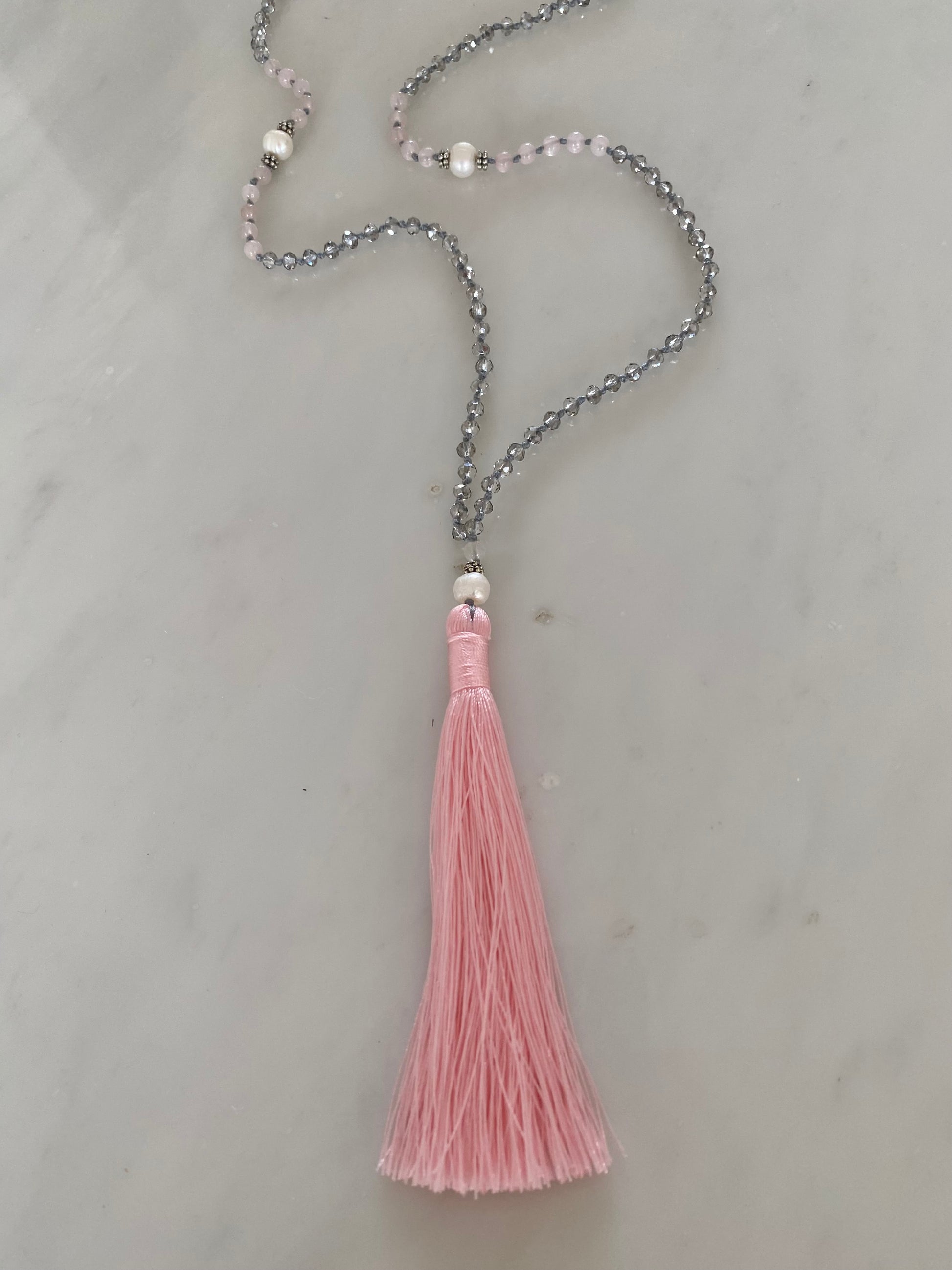 This gentle tassel necklace is made up of light grey crystals, the palest pink agates and larger white pearls all hand woven in light grey thread. Finished with delicate pink tassel.