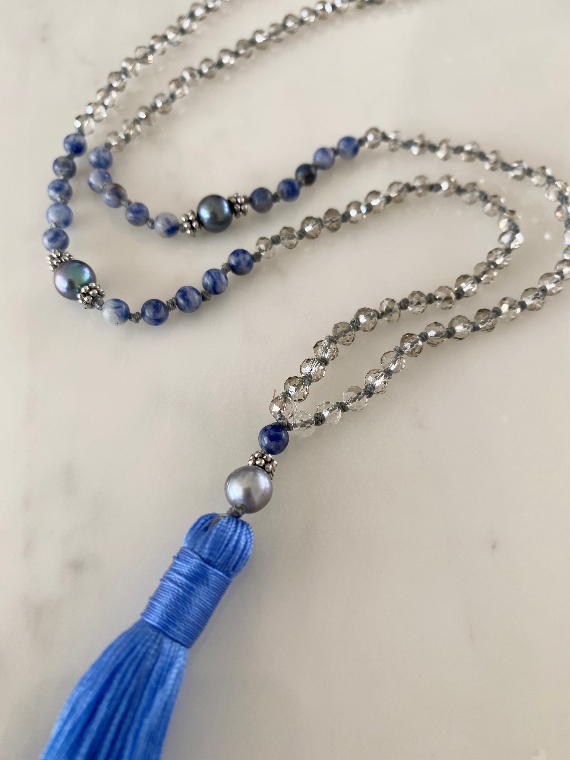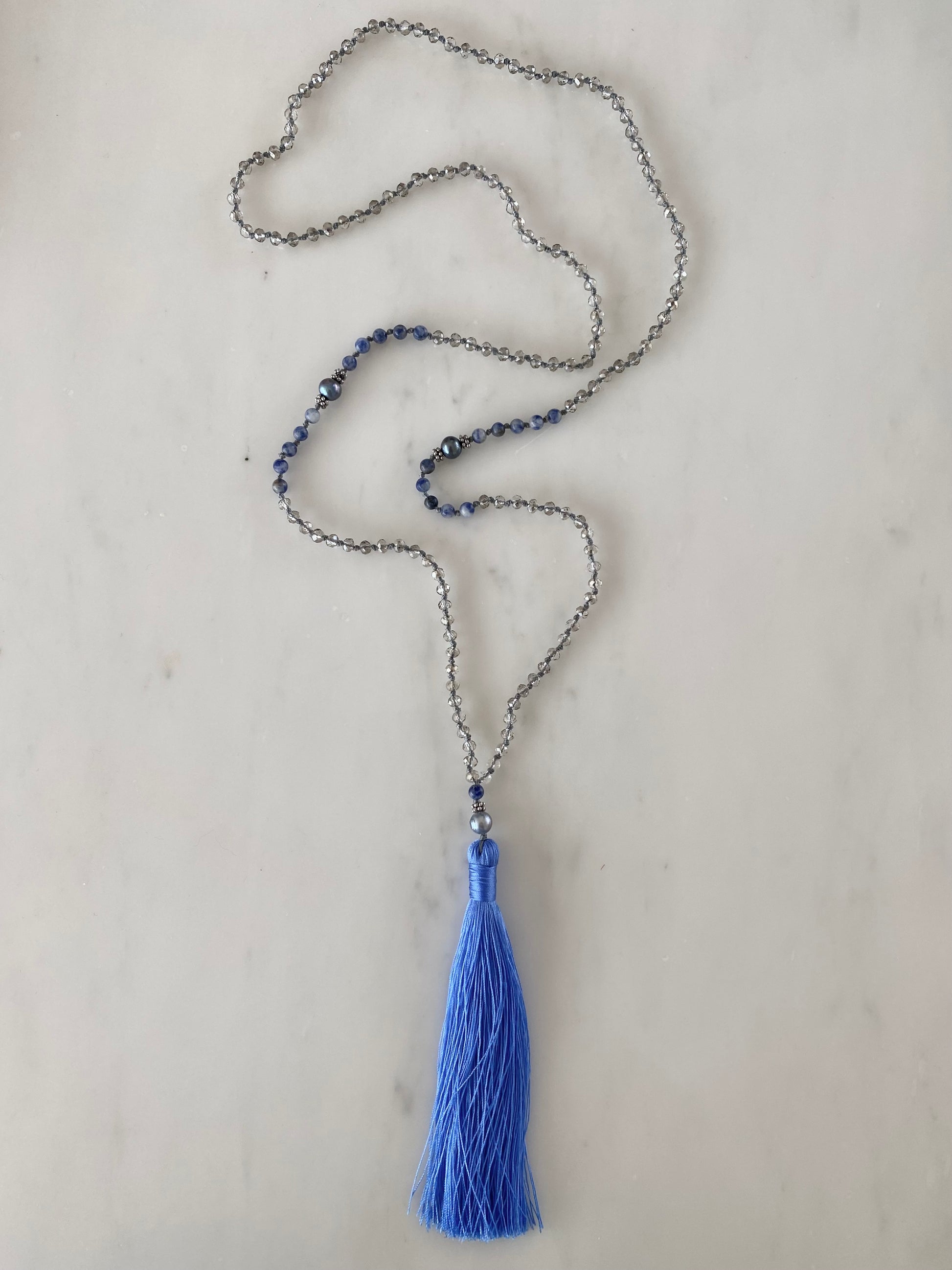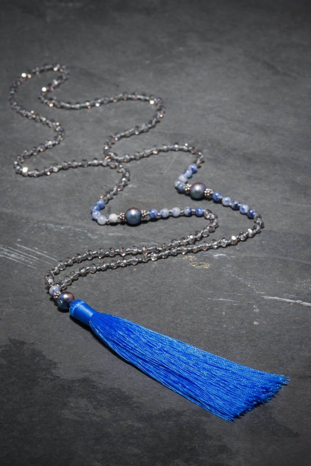 Inspired by the beautiful blue hour, and on trend cornflower blue colour. This beautiful necklace is made up of clear crystals, hand knitted in soft grey-blue. At its centre sit large glowing blue-grey pearls surrounded by small blue lapis lazuli semi precious stones. It is finished with a cornflower blue tassel. Effortlessly elegant it adds a touch of blue hour shimmer to your look.