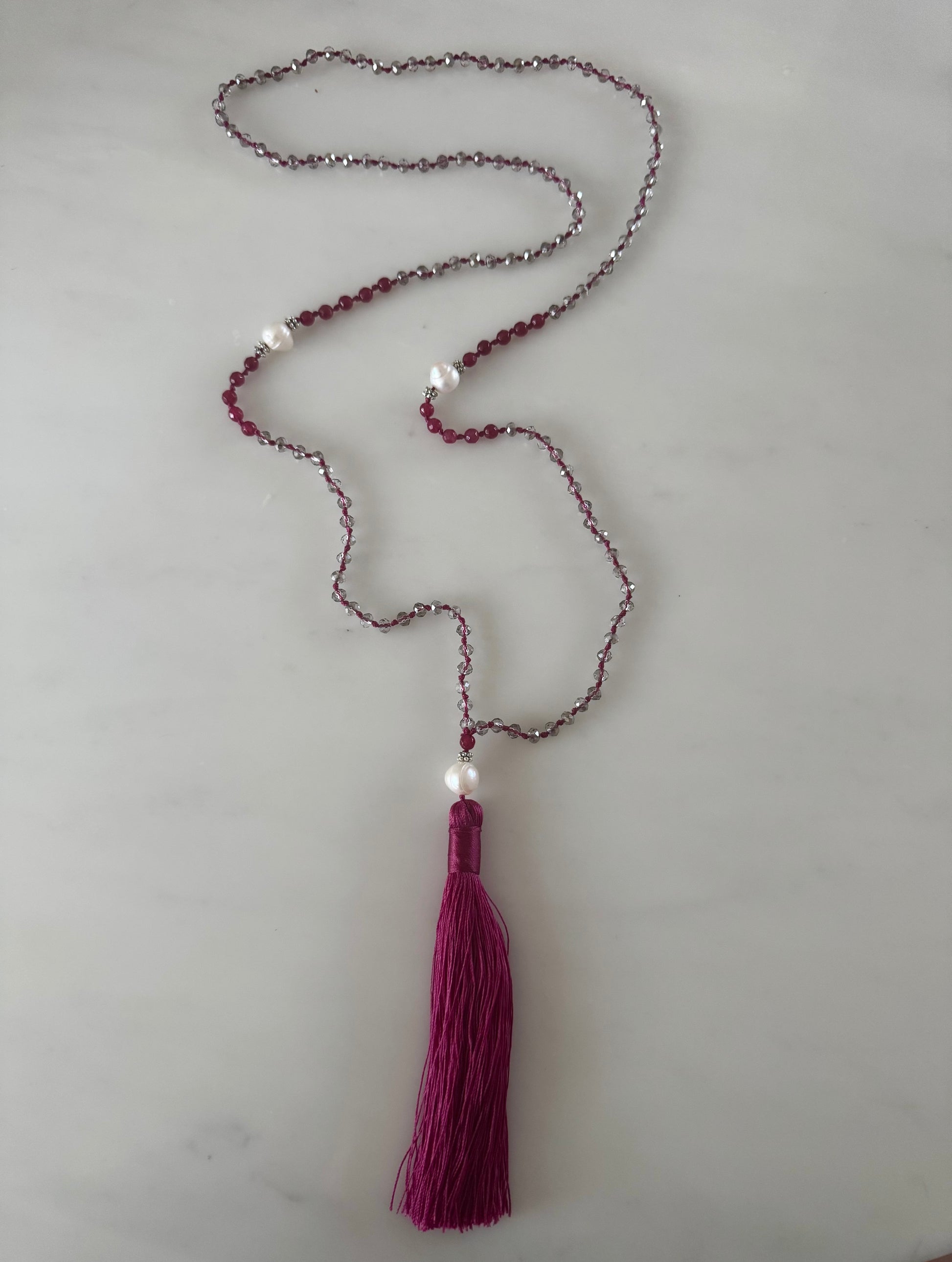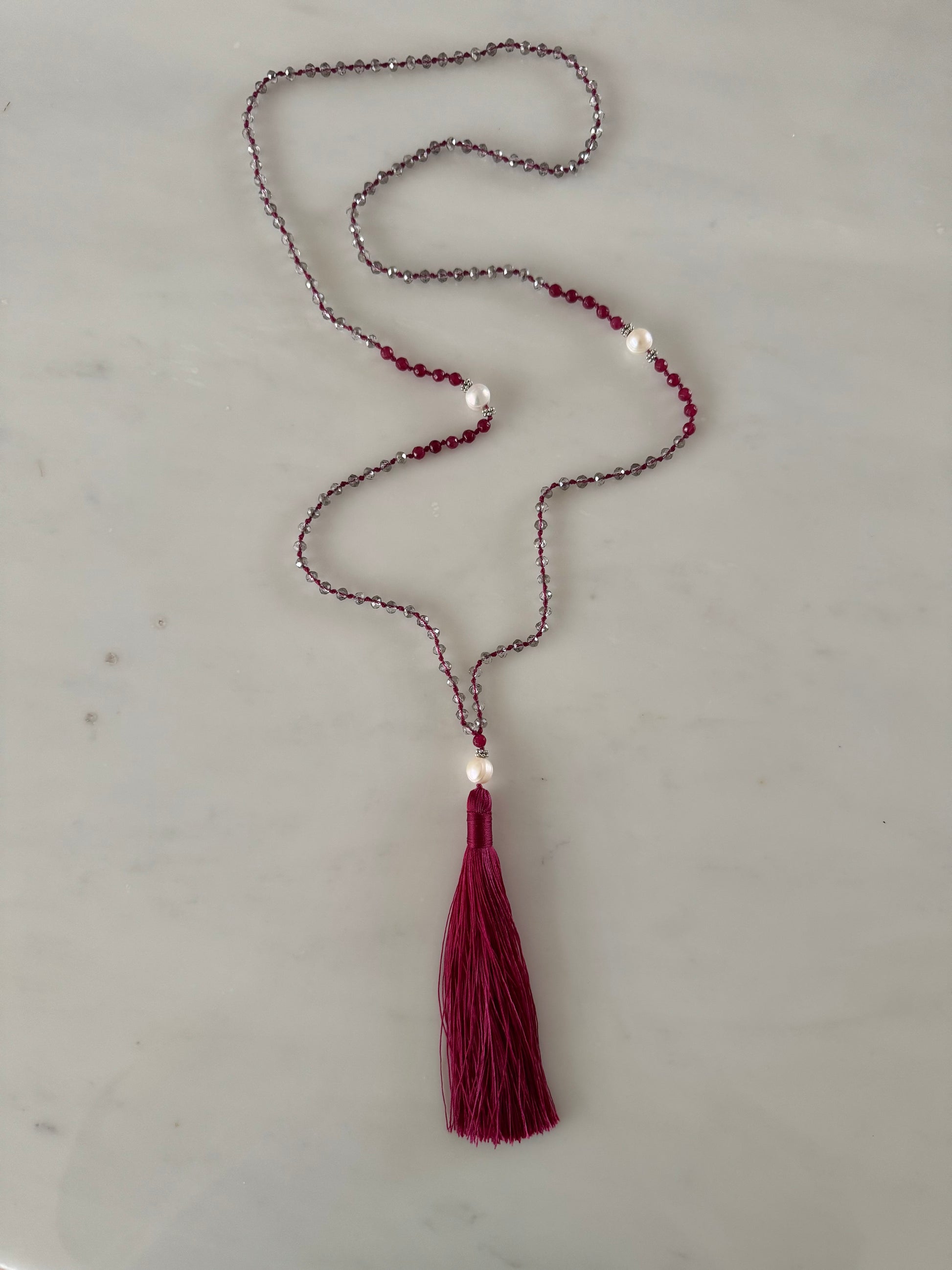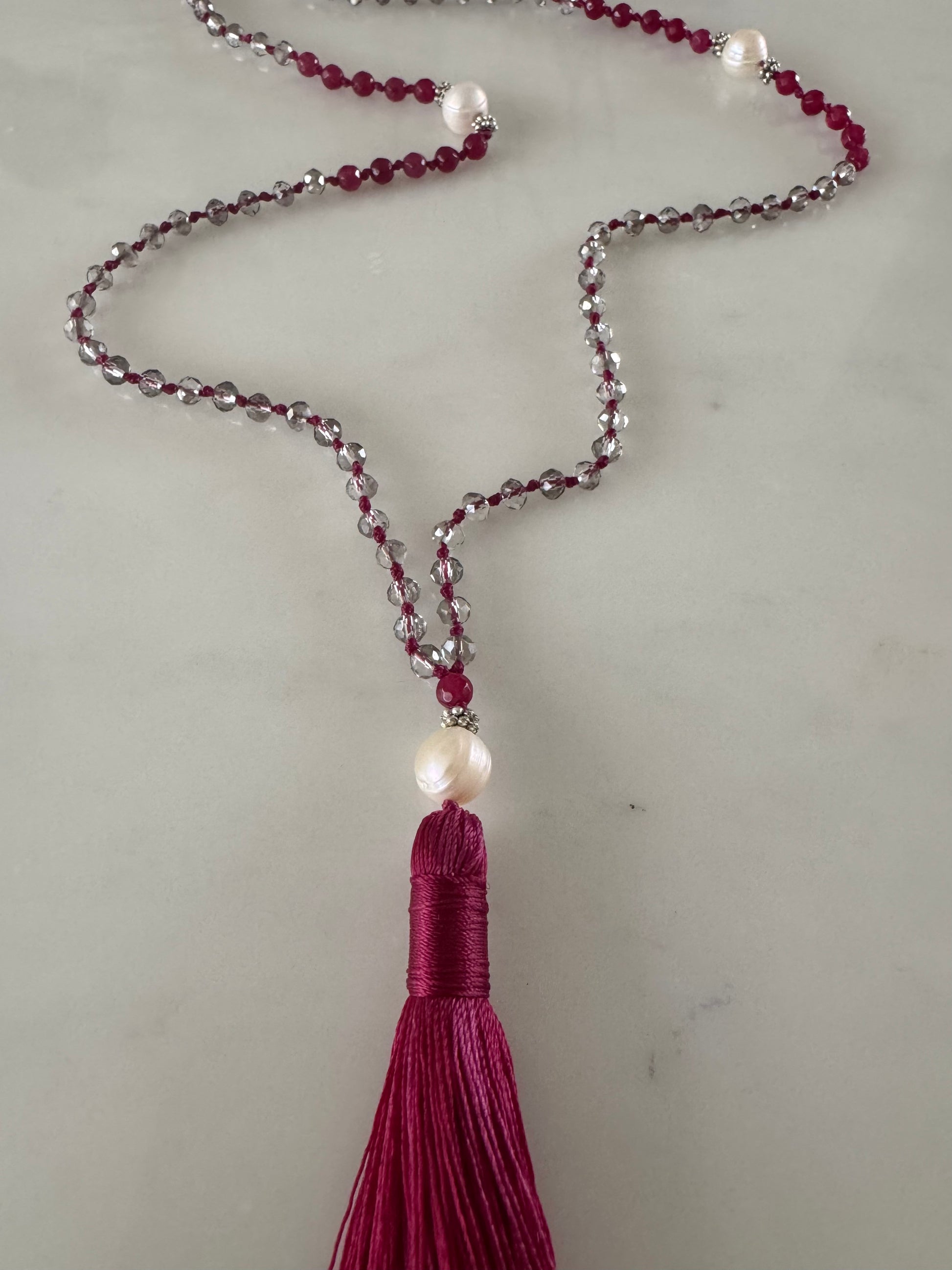 A new deep red version of a classic favourite. Hand knotted with clear grey crystals in a deep red thread with a mixture of sized rich ruby agates either side of glowing white pearls. It is finished with a ruby red agate and amother pearl before the deep red end tassel.