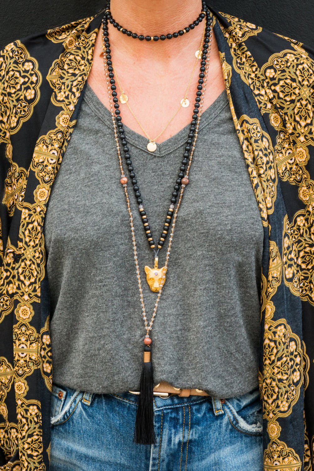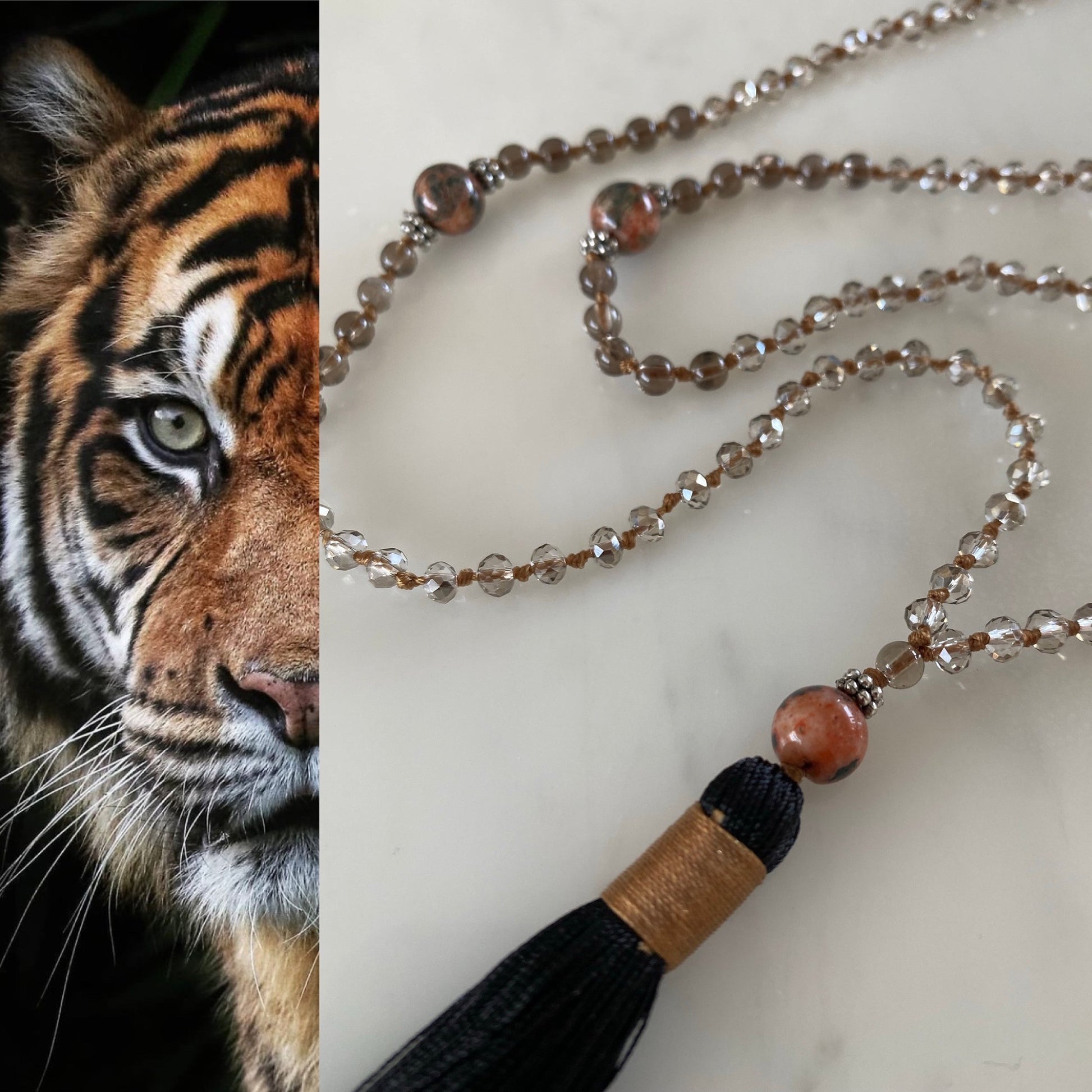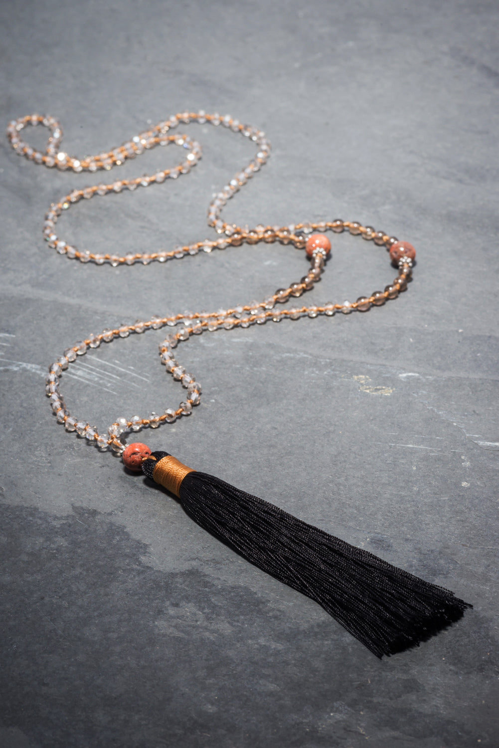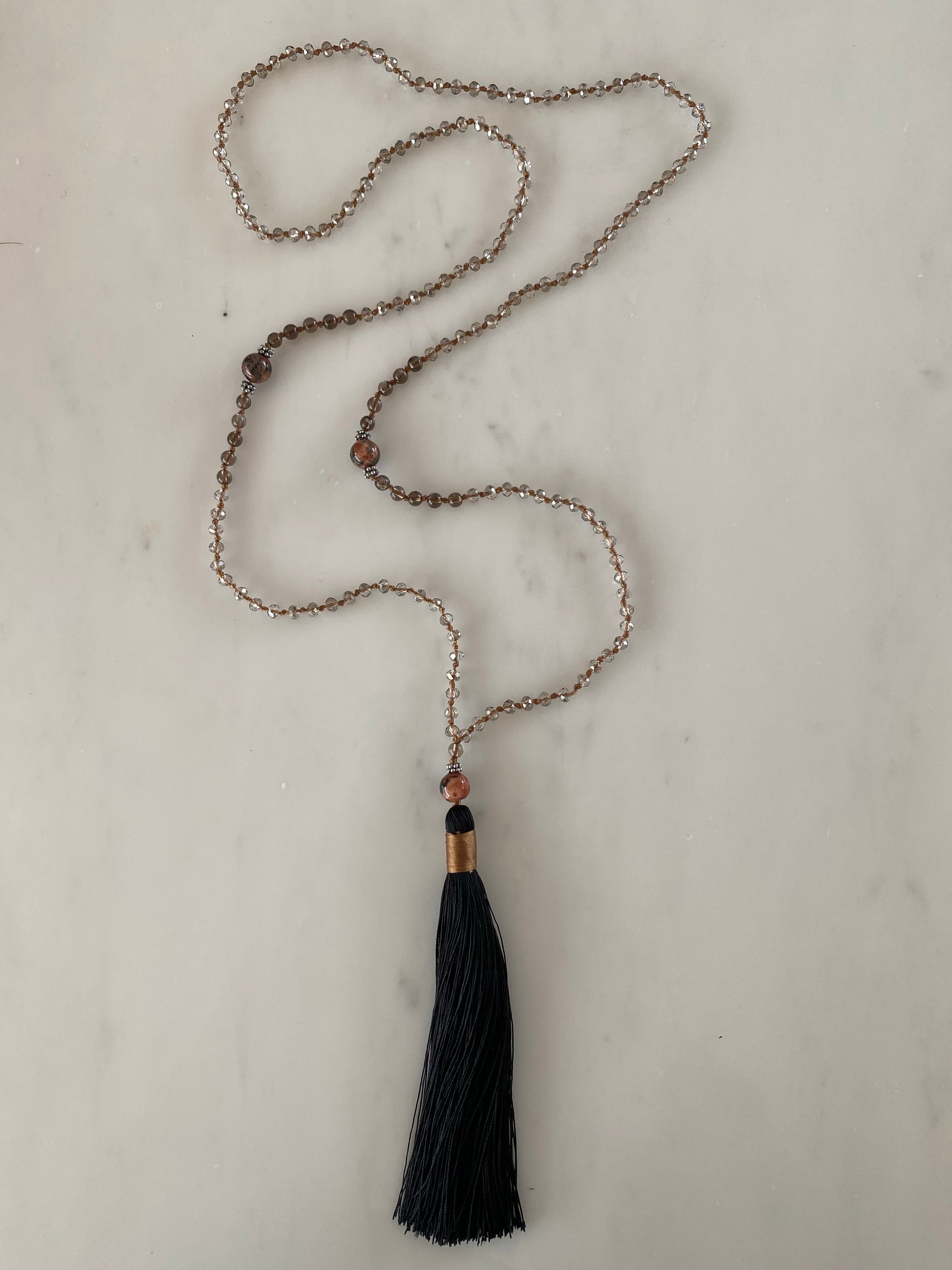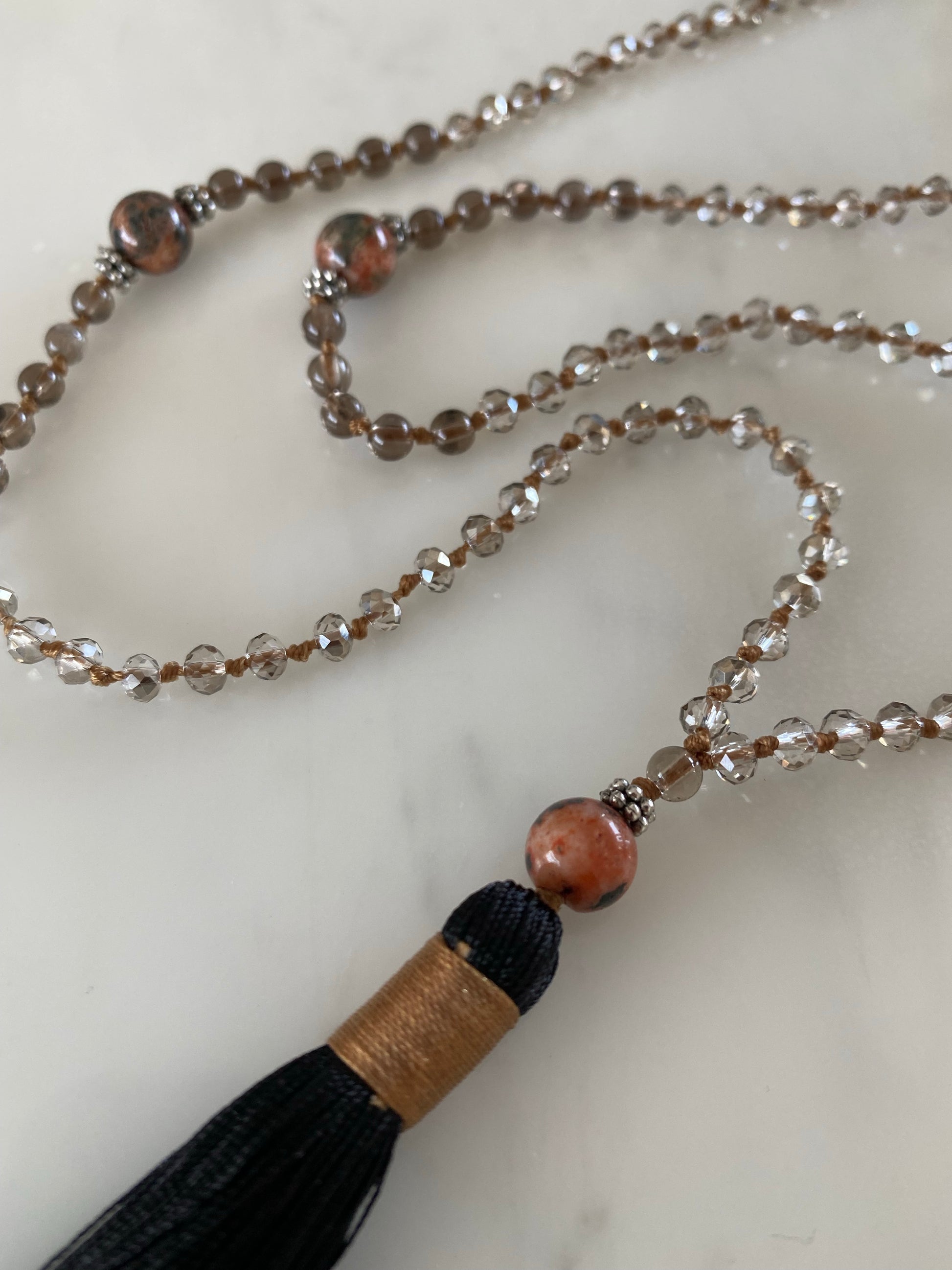 A beautiful deep and smokey, necklace that’s both neutral and interesting. Made up of clear light grey crystals, hand knotted in a rich cinnamon thread. At it's centre sit large round beautiful reddish-brown agates, surrounded with smaller, Smokey topaz semi precious stones. A further Smokey topaz and reddish-brown agate sit before the black hand made tassel wrapped in cinnamon. A sophisticated necklace with a subtle strength.