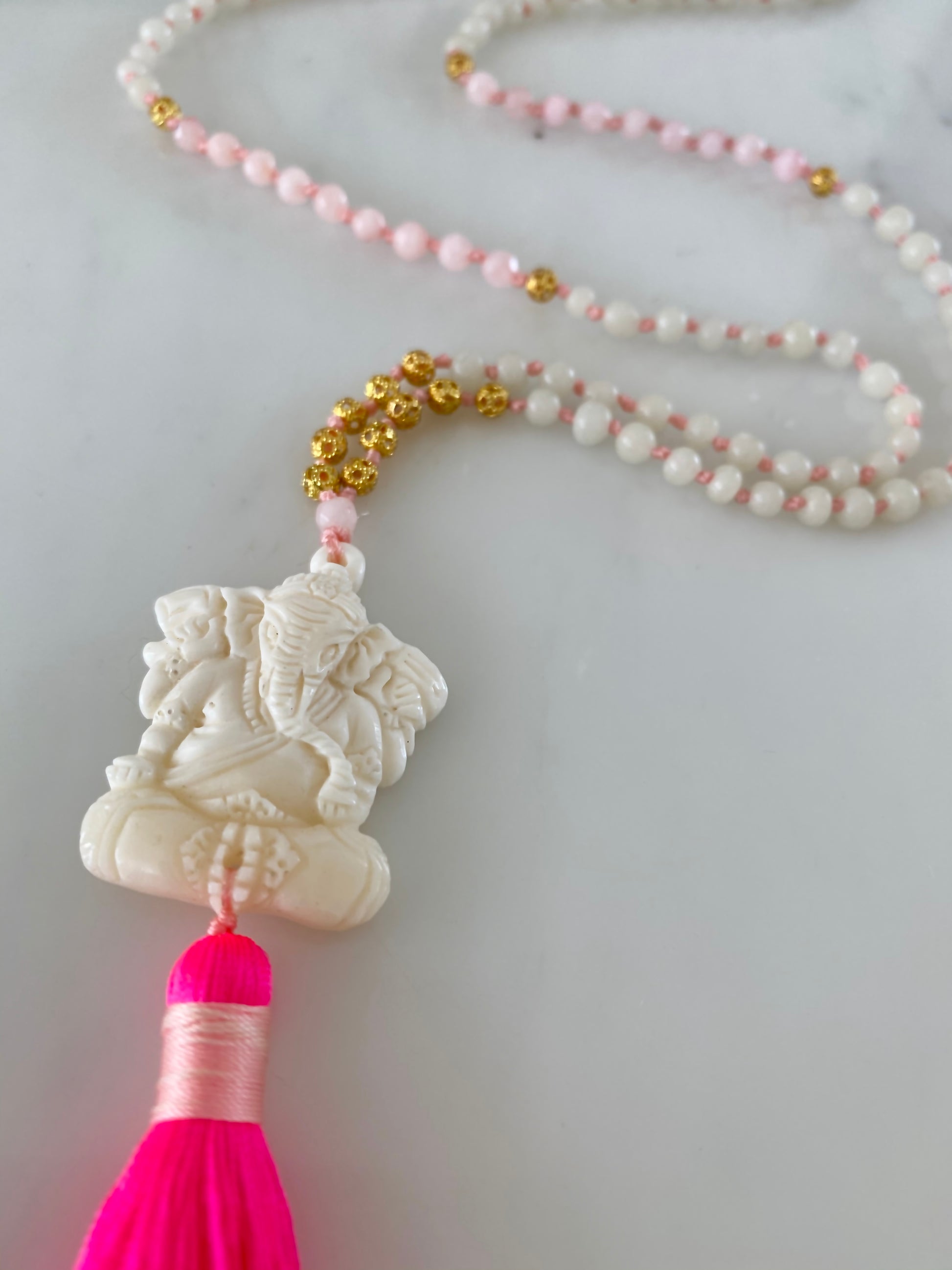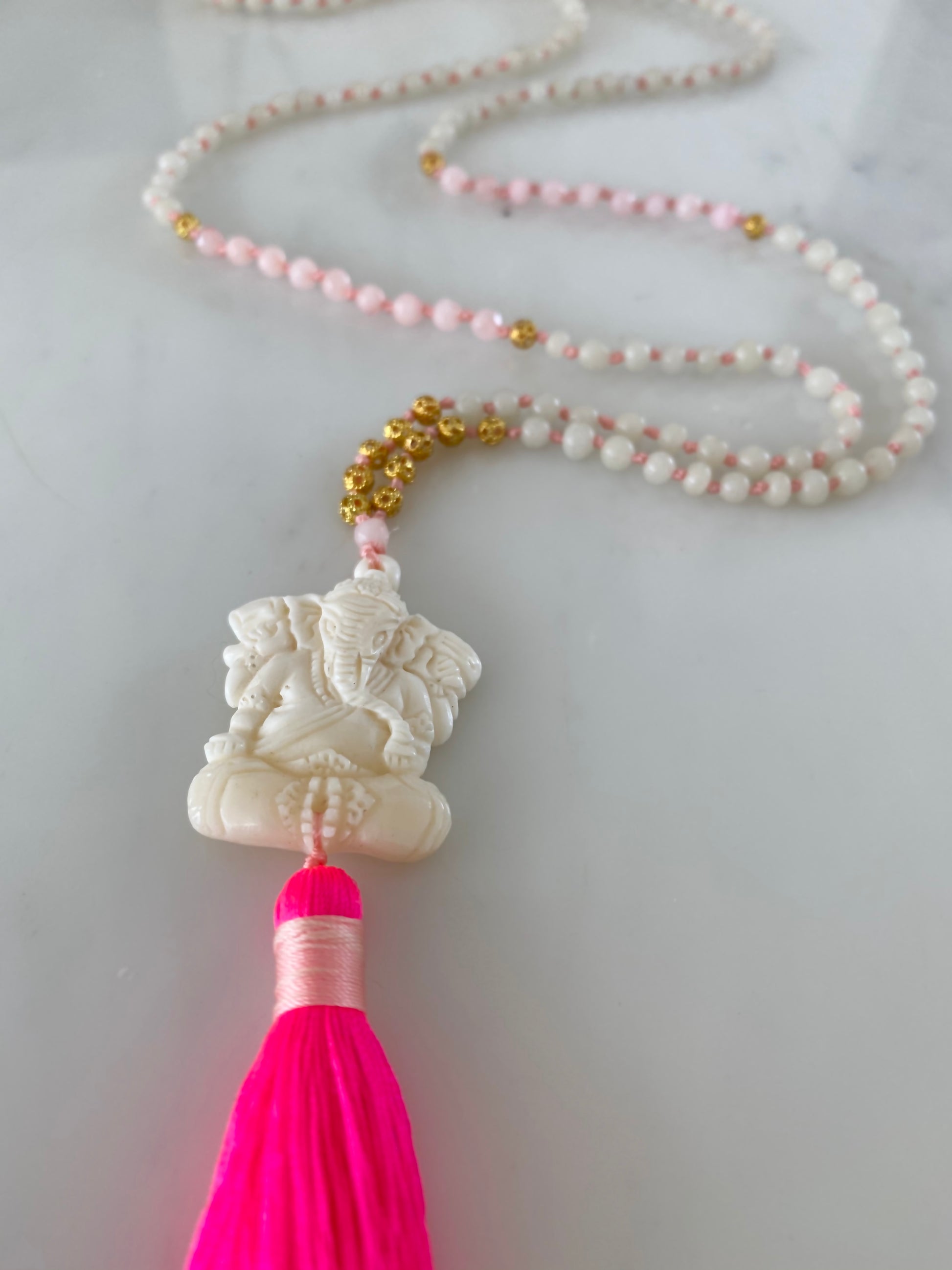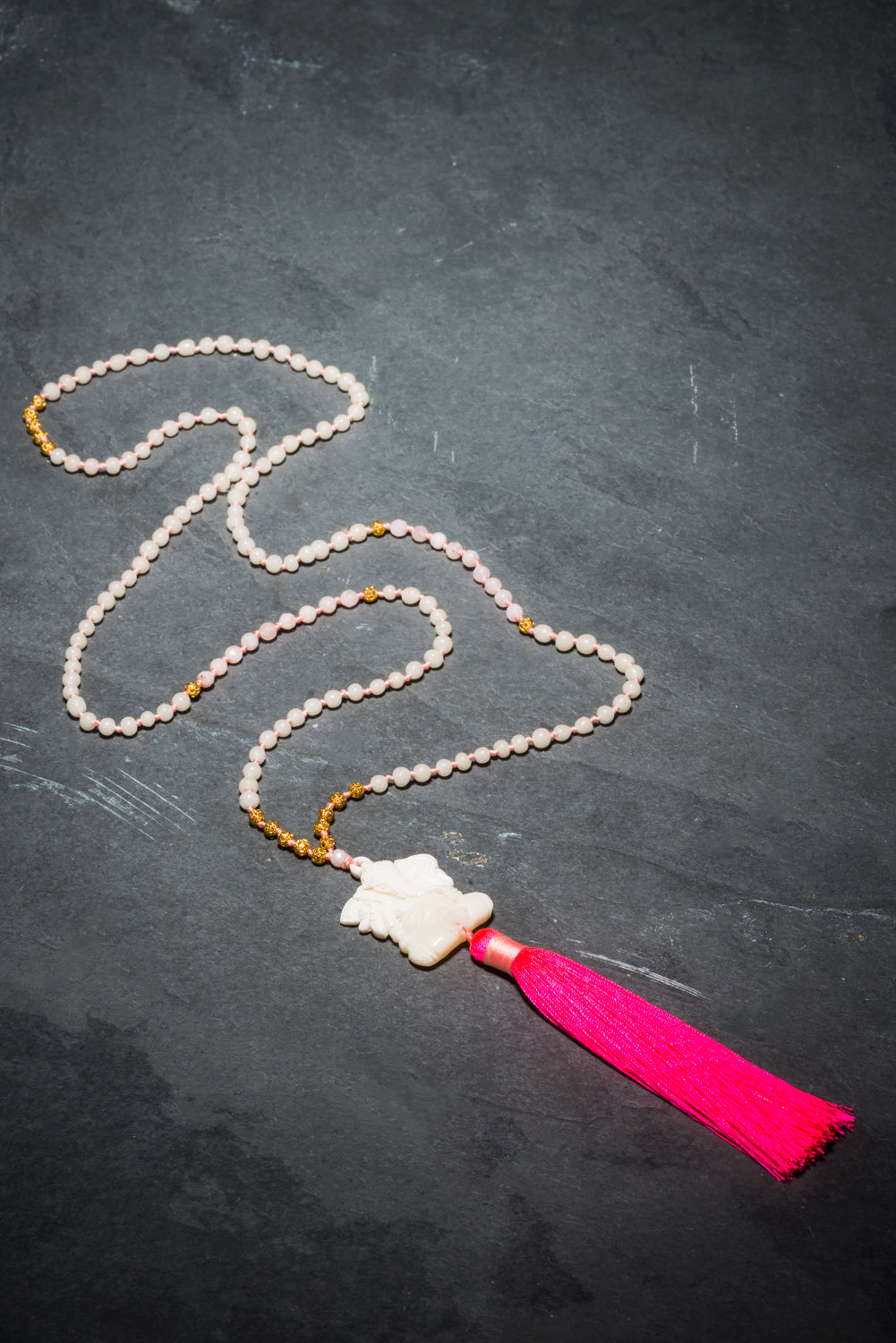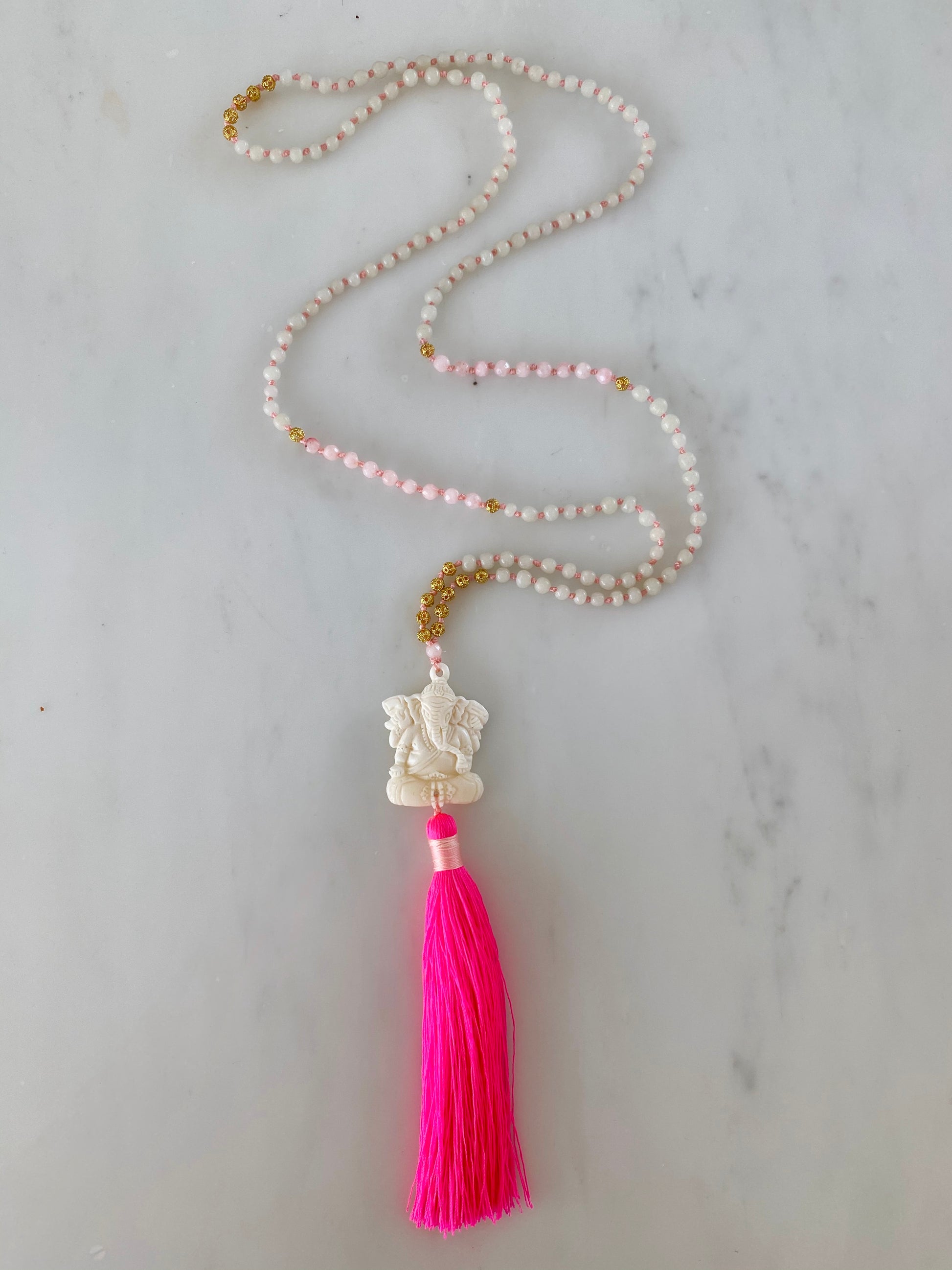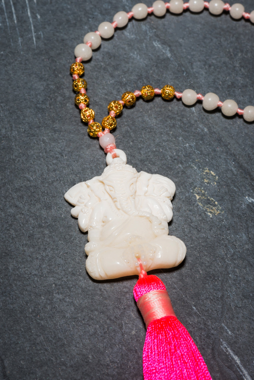 This is one of our very special one off tassel necklaces. The Ganesha is beautifully hand carved by our artisan from ethically sourced bone. It is then hand knotted with rose quartz, hand blown glass beads and golden filigree parts. It is finished with a final rose quartz before the carving and hot pink tassel wrapped in cream.