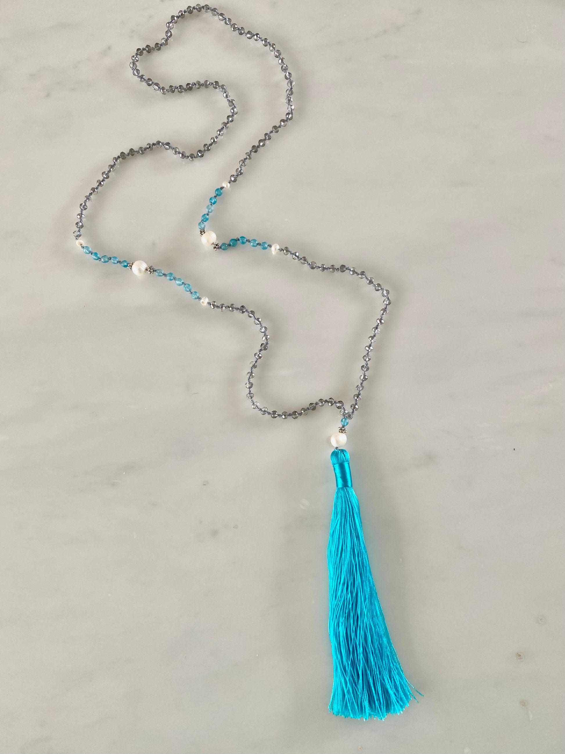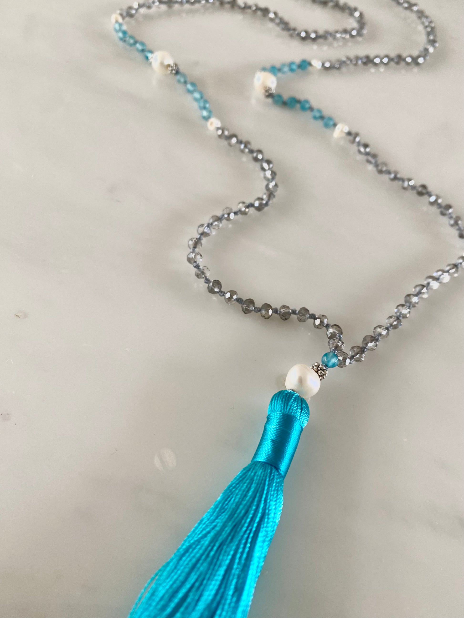 A fresh, uplifting bright turquoise in our classic white pearl range, this necklace is made up of twinkling light grey crystals and turquoise agates knotted in light grey thread. It is accentuated with round white pearls at its centre and before the vibrant turquoise tassel. A go to piece for a colourful pick me up, home or away.