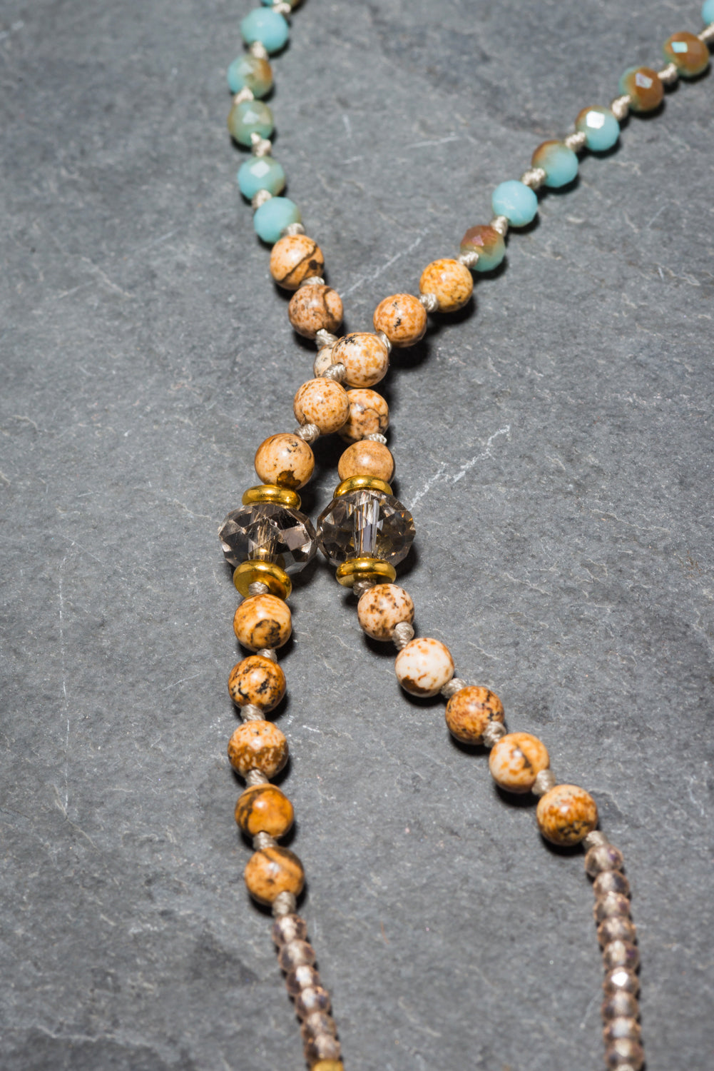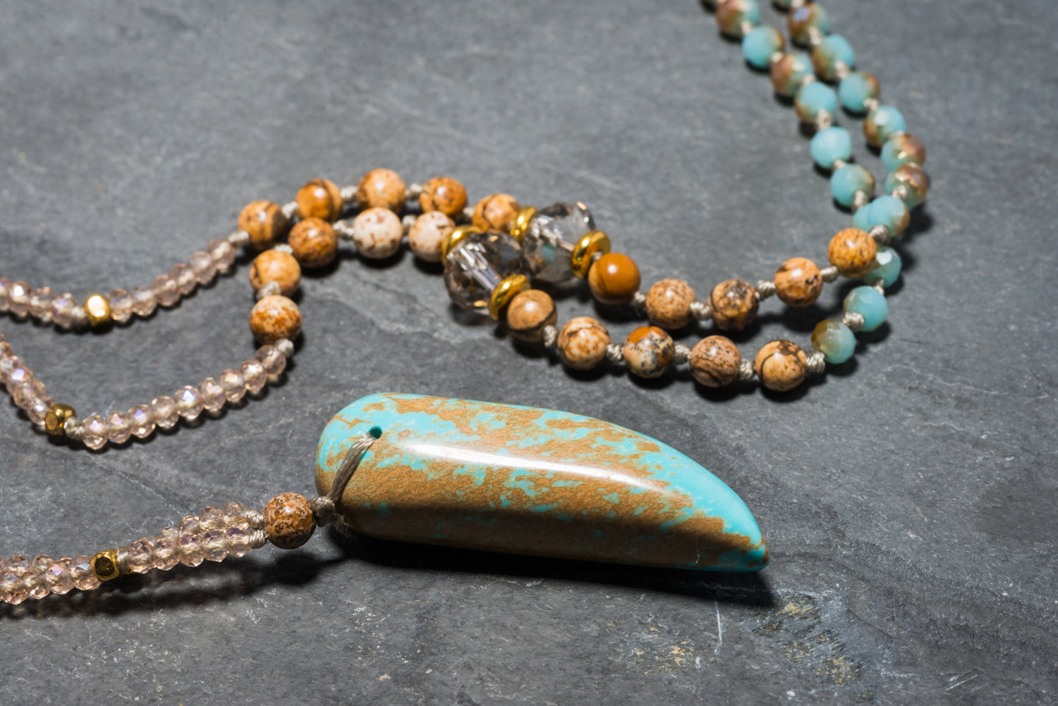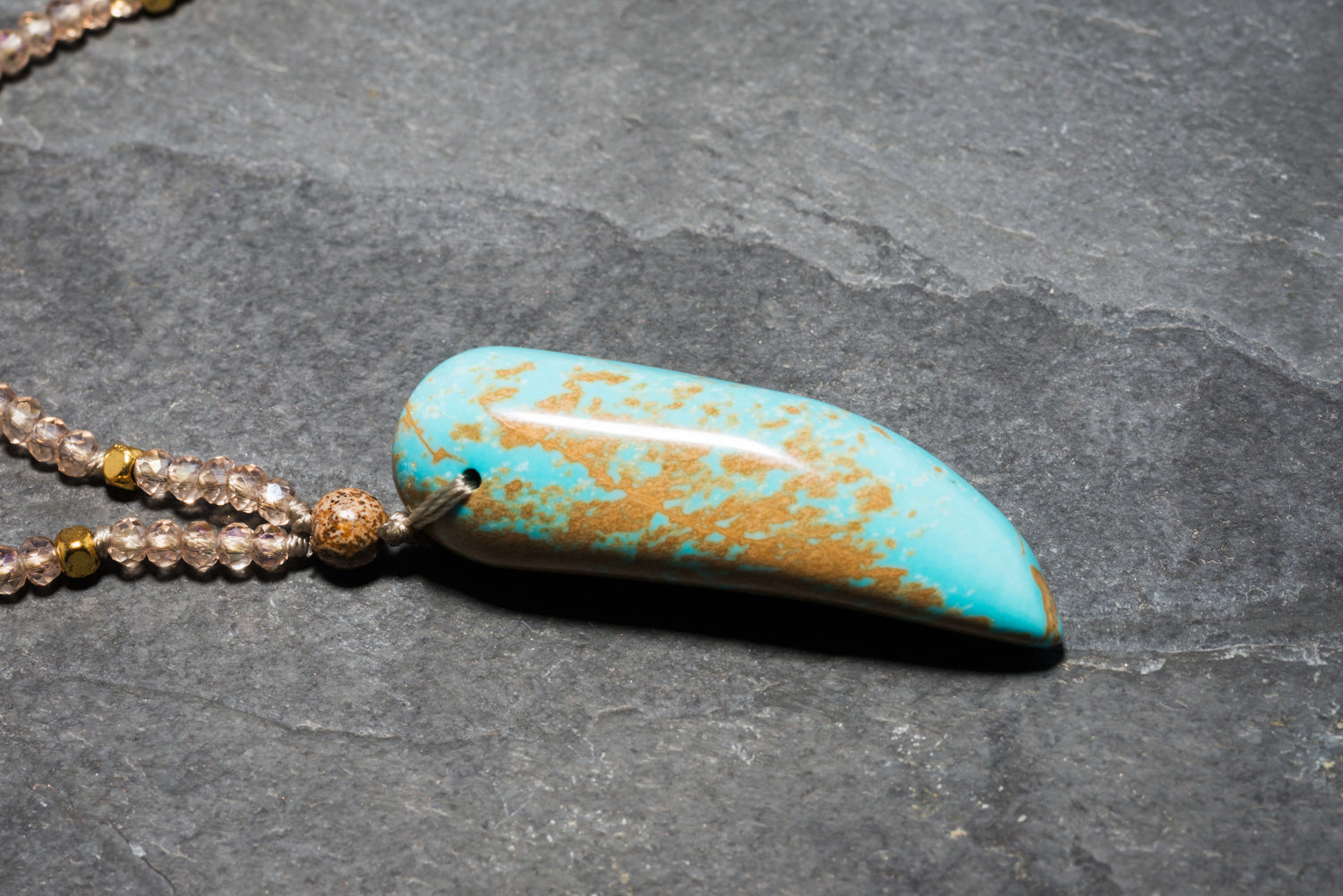 A fresh and summery uplifting rounded mini tusk pendant. Perfect for summer travels, it has a turquoise howlite tusk with grains of caramel. Fine champagne crystals are interspersed with brass cubic beads in the lower section. Earthy jasper quartz stones, and a clear crystal sit as it's centre above which are stronger turquoise crystals. It is very tactile with a nice weight to the tusk. Wear alone or layer with turquoise and blue tassels.