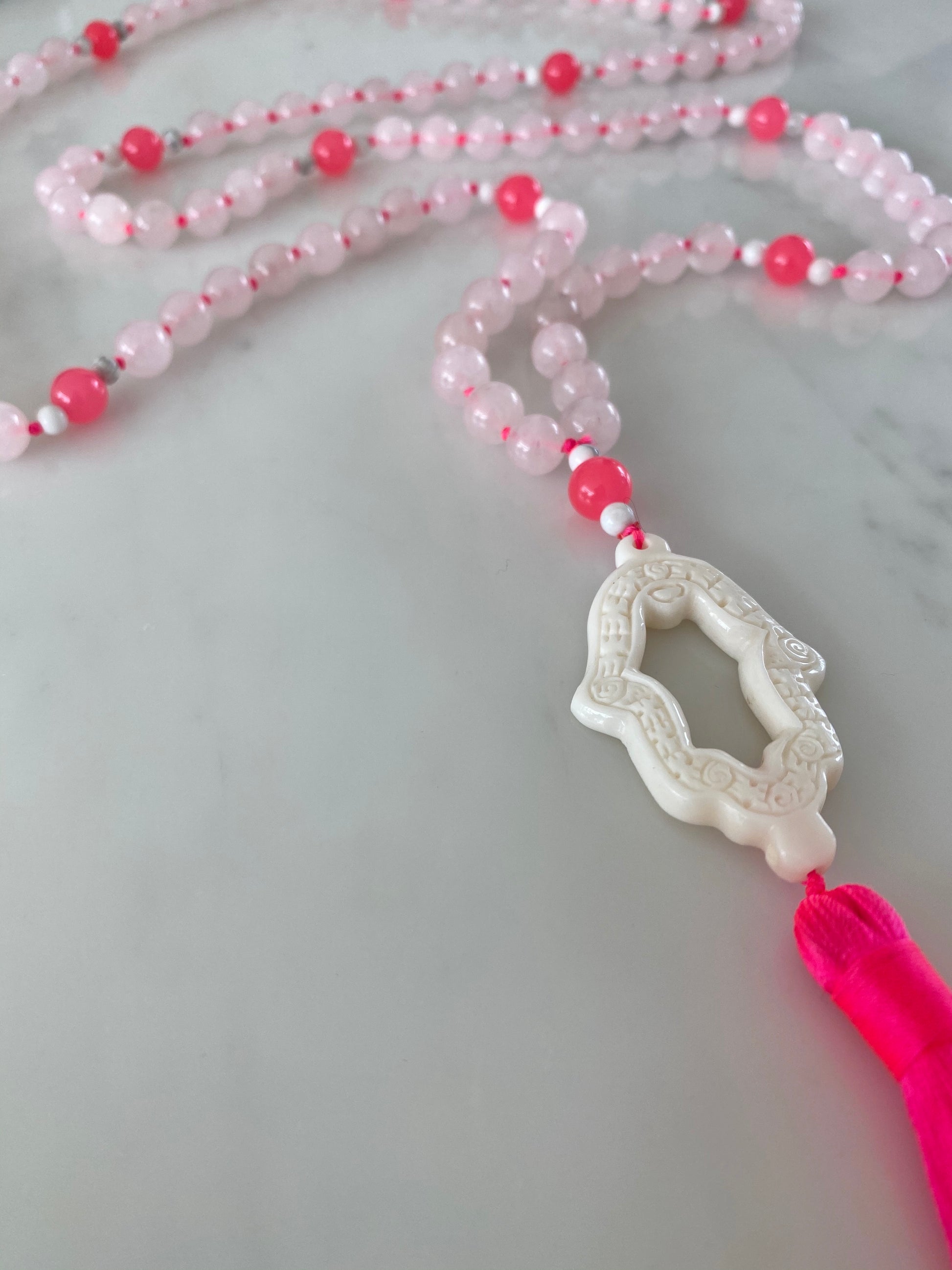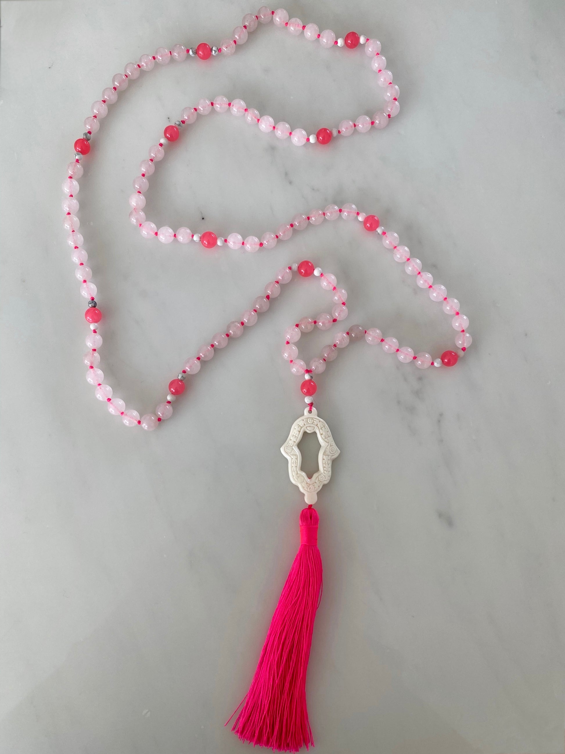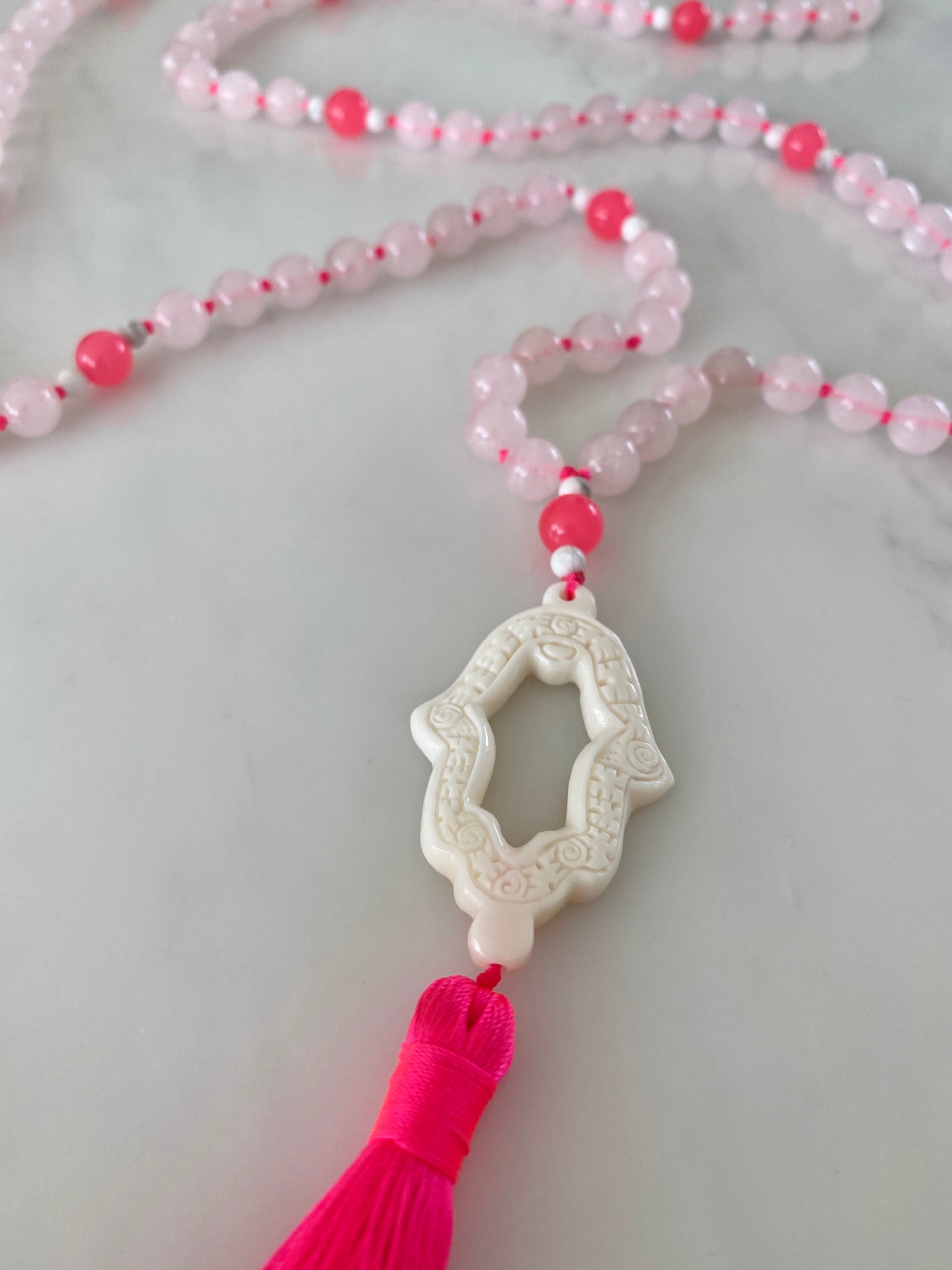 This is one of our very special limited edition mala pieces in full semi-precious stones. It is designed to wear both very long or wrap once around the neck as a double. The prayer hand is beautifully hand carved by our artisan from ethically sourced bone. It is then hand knotted with heavy rose quartz, pink agate and white howlite stones and finished with an unapologetically bold hot pink tassel.