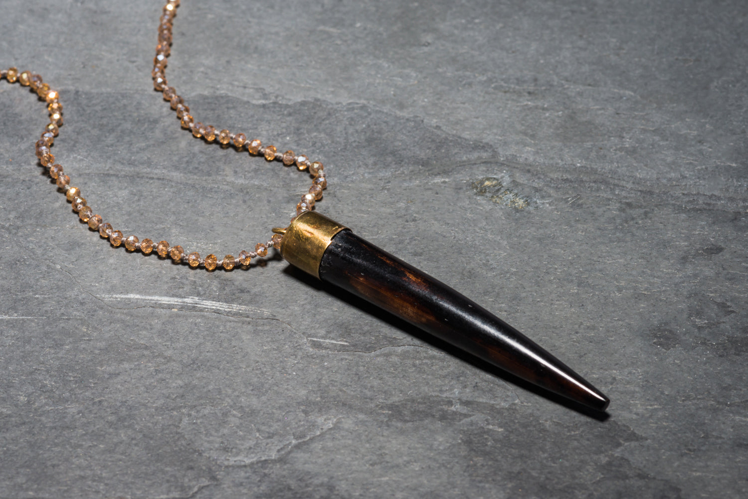 This necklace is named after the Swahili word for 'courage' due to it's mix of volcanic rock beading and a warm semi-precious carnelian centre stone. The black horn which is set in hand cast brass sits on fine nude crystals.