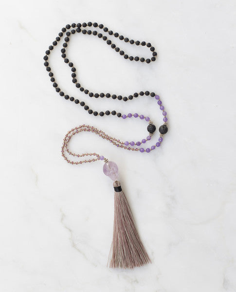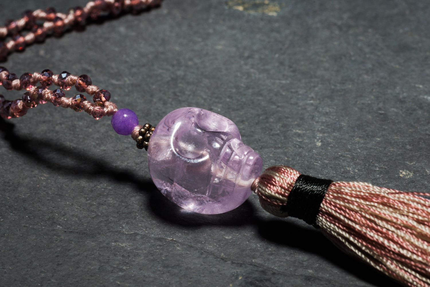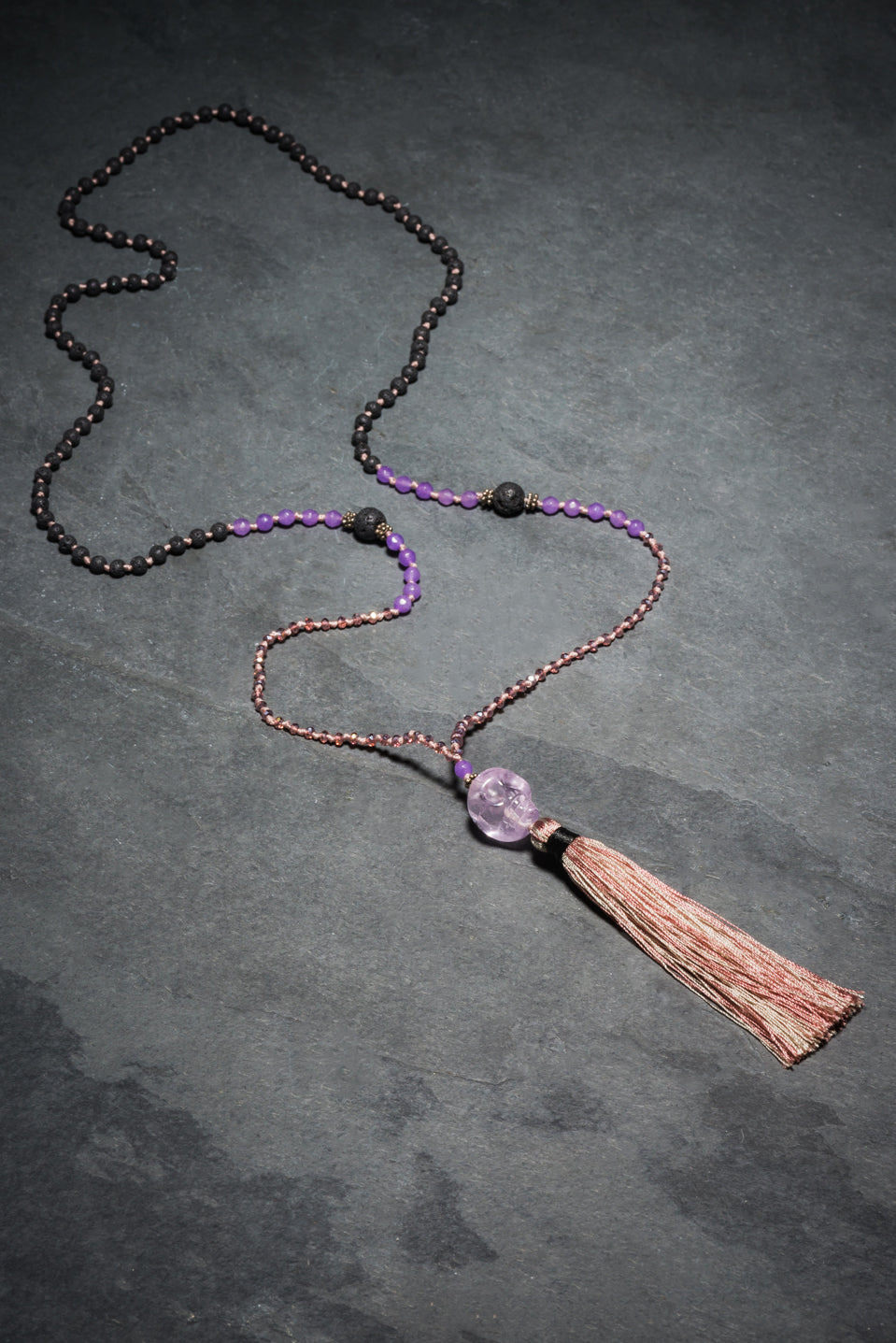 This piece is a delicate balance of volcanic rock beading and fine violet crystals. The focus of this piece is a translucent amethyst skull.