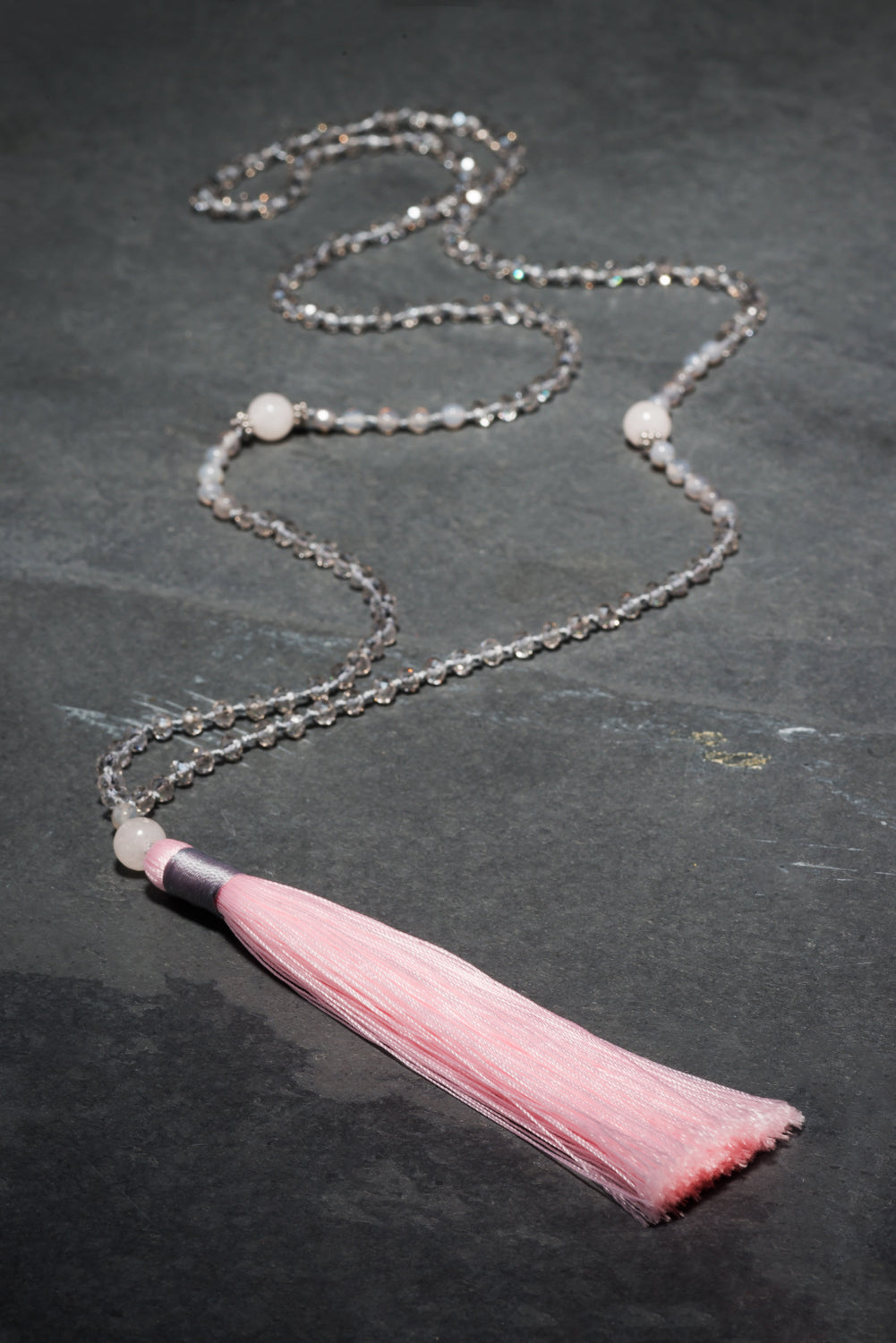 Light clear grey sparkling crystals are knotted in light grey thread. Soft grey faceted agates and smooth rose quartz semi precious stones decorate the mid and end sections. The light playful pale pink end tassel is wrapped in gentle grey.