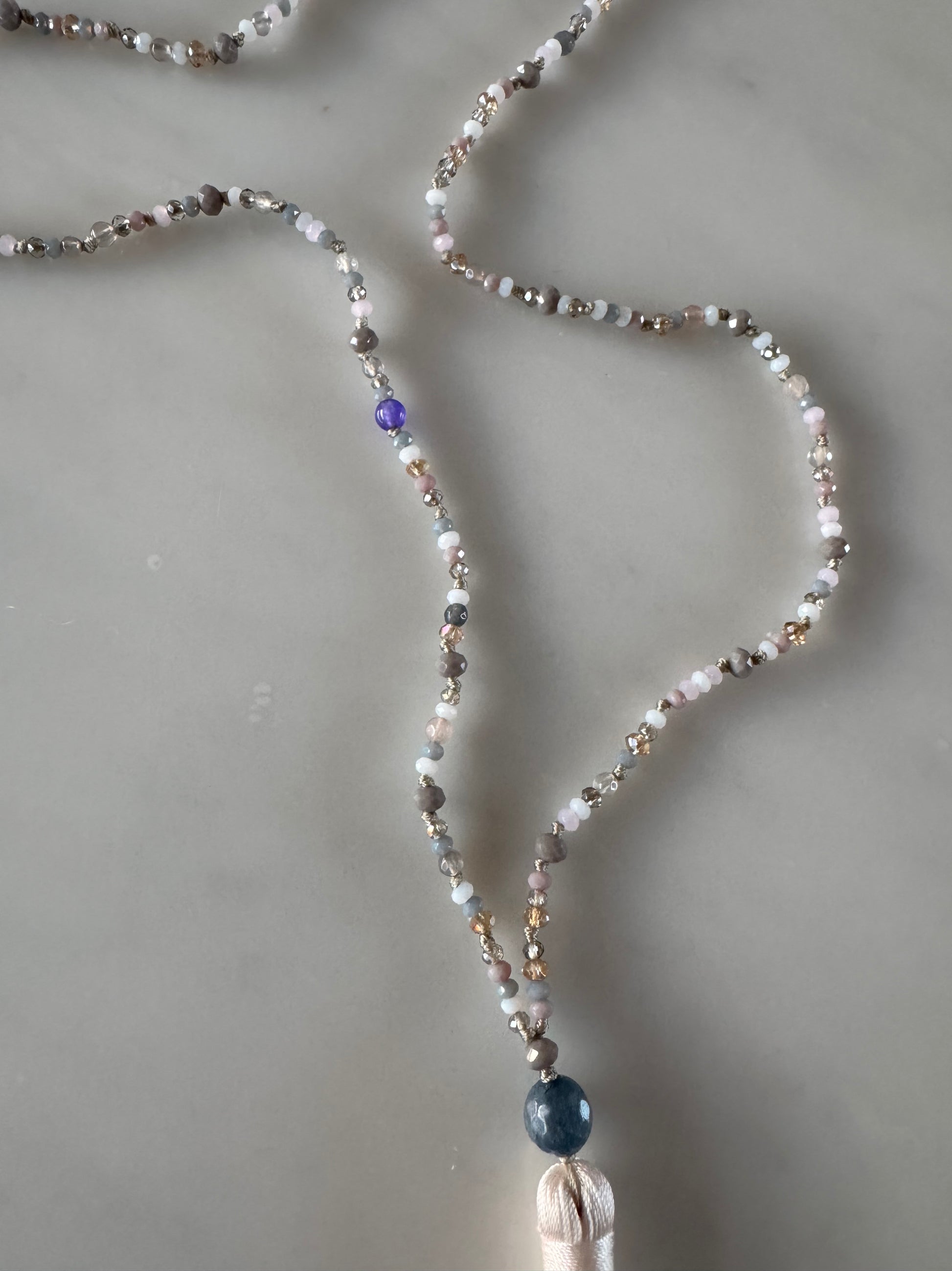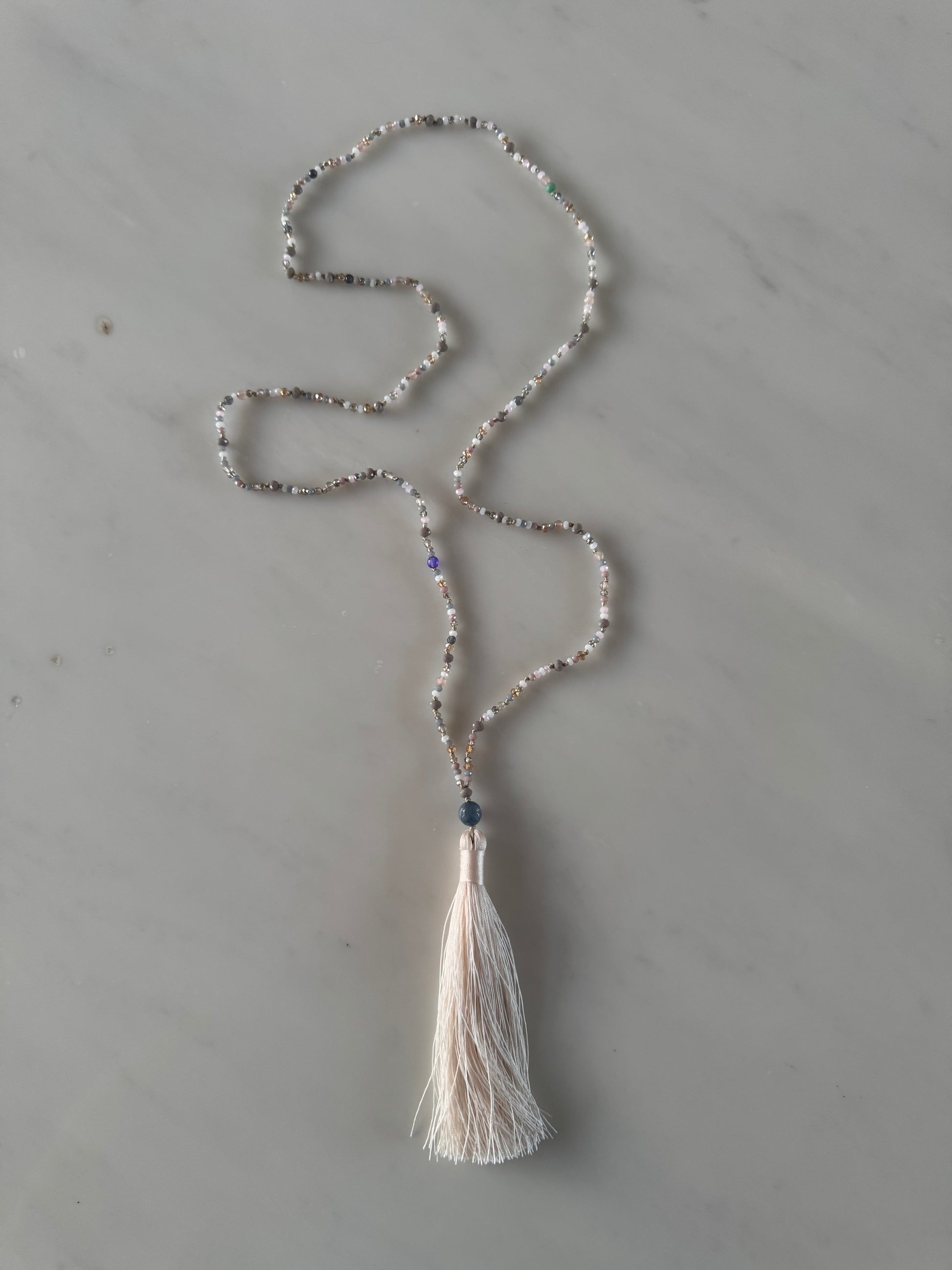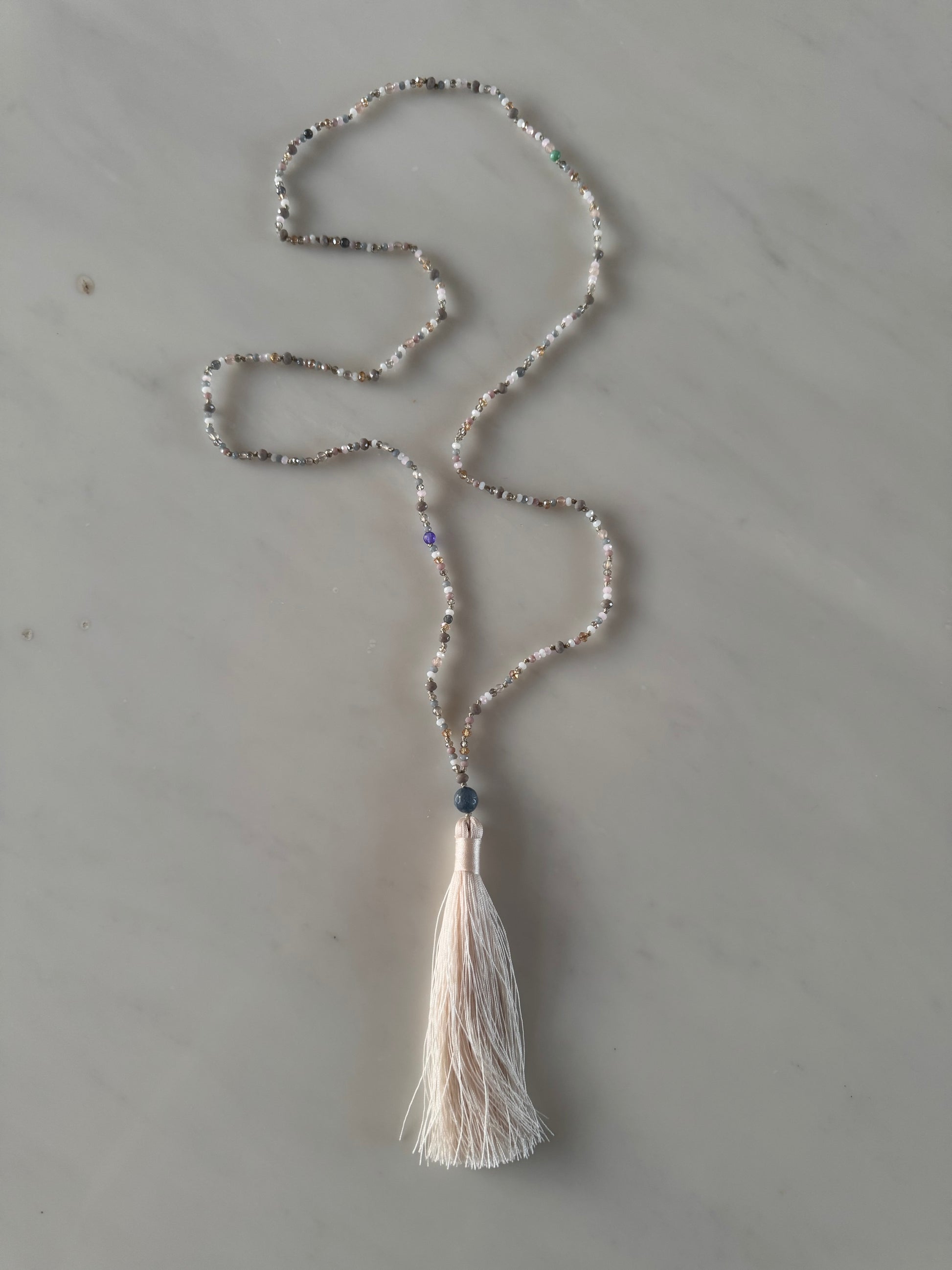 This beautiful new necklace has a rainfall feel to it with a scattered mix of cream, grey, beige, blue and only nude semi precious stones and crystals throughout. All hand knotted and finished with a hand made light cream tassel.