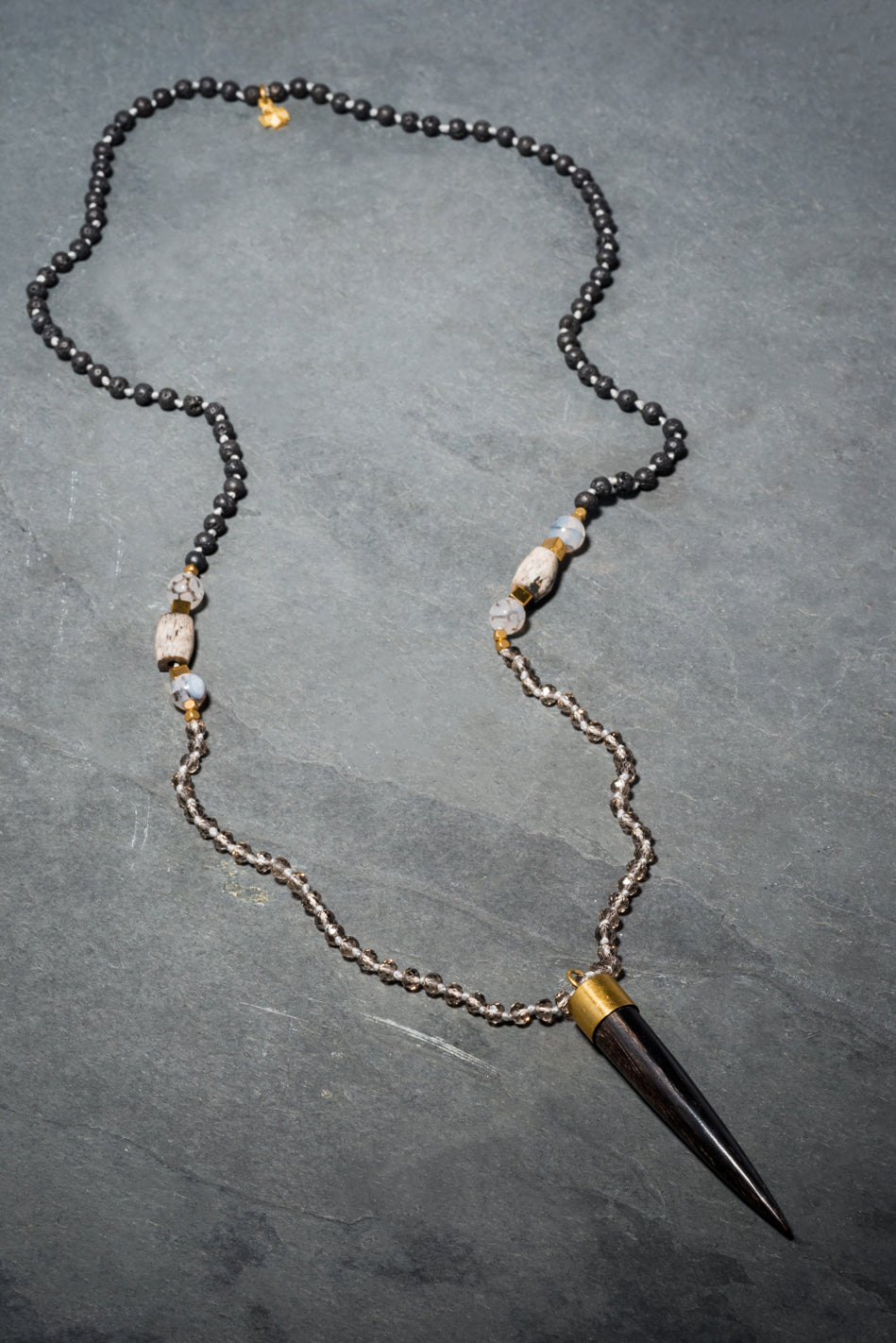 Named after a Kenyan Tribe this necklace combines volcanic stone beading with fine cream crystals brought together by a camel bone bead sandwiched between two crackle agates. The piece is finished with a hand carved black horn pendant set in hand cast brass.