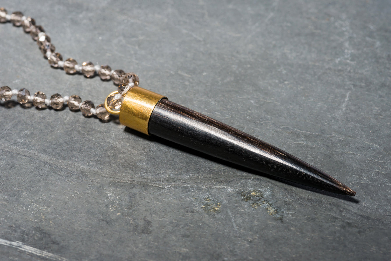 This horn pendant is extremely versatile to wear due to its monochromatic palette. Great for a day or evening look.